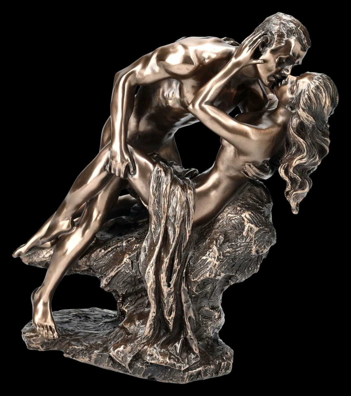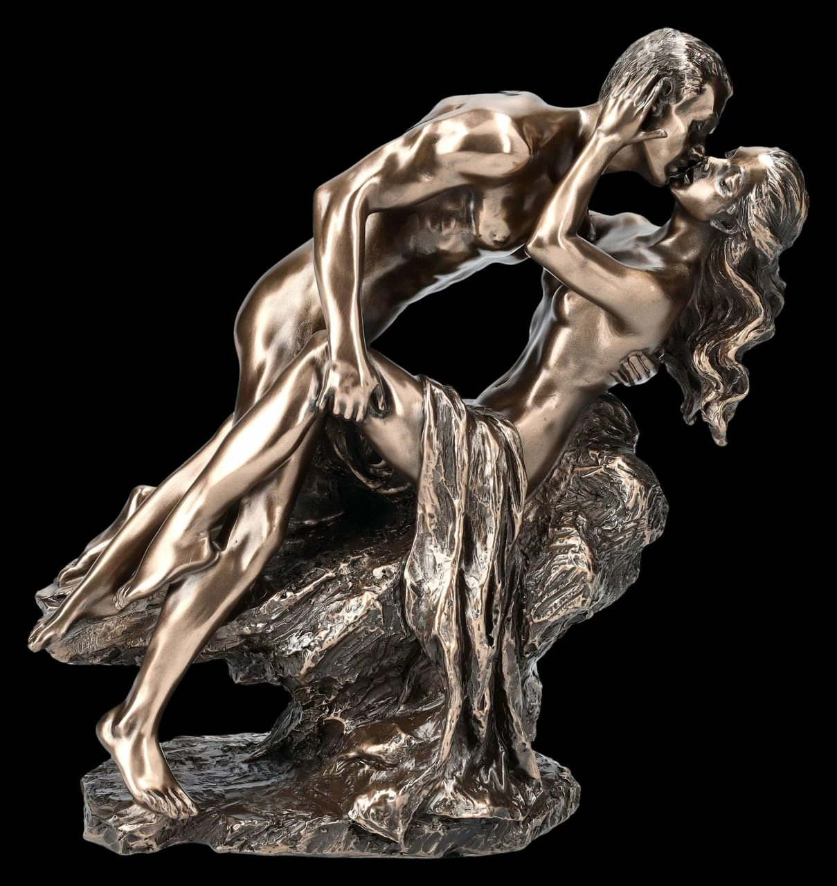 Der berühmte französische Künstler und Bildhauer Auguste Rodin zeigte in seiner Skulpturengruppe ‚Das ewige Idol‘ sich küssende eng umschlungene Liebespaare. Anders als bei Rodin beugt sich die Frau bei dieser leidenschaftlichen Akt-Figur von Veronese kurz vor dem Liebesakt zurück, um bereitwillig den Kuss des Mannes zu empfangen. So geben sich, anders als bei Rodin, der eher die Dominanz der Frau demonstrieren wollte, bei dieser wunderbaren Skulptur Mann und Frau gleichberechtigt ihrer Leidenschaft hin. Mit dem Titel ‚Love in Spring‘ soll diese kleine Skulptur aber vielleicht auch den Beginn einer großen Leidenschaft im Frühling des Lebens darstellen. Die wunderschöne erotische Skulptur ‚Love in Spring‘ aus der Studio Collection strahlt sehr facettenreich Sinnlichkeit, Liebe und Leidenschaft aus. Aus edel bronziertem Kunststein (Polyresin) gefertigt, ist diese wunderbare 20 cm hohe, 19,5 cm breite und 8,5 cm tiefe Akt-Figur der Liebenden ein effektvoller und sehr stilvoller Blickfang in jedem Ambiente und ein wunderbares Geschenk für den oder die Liebste.