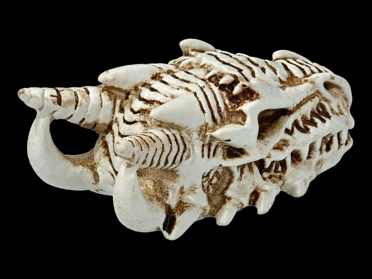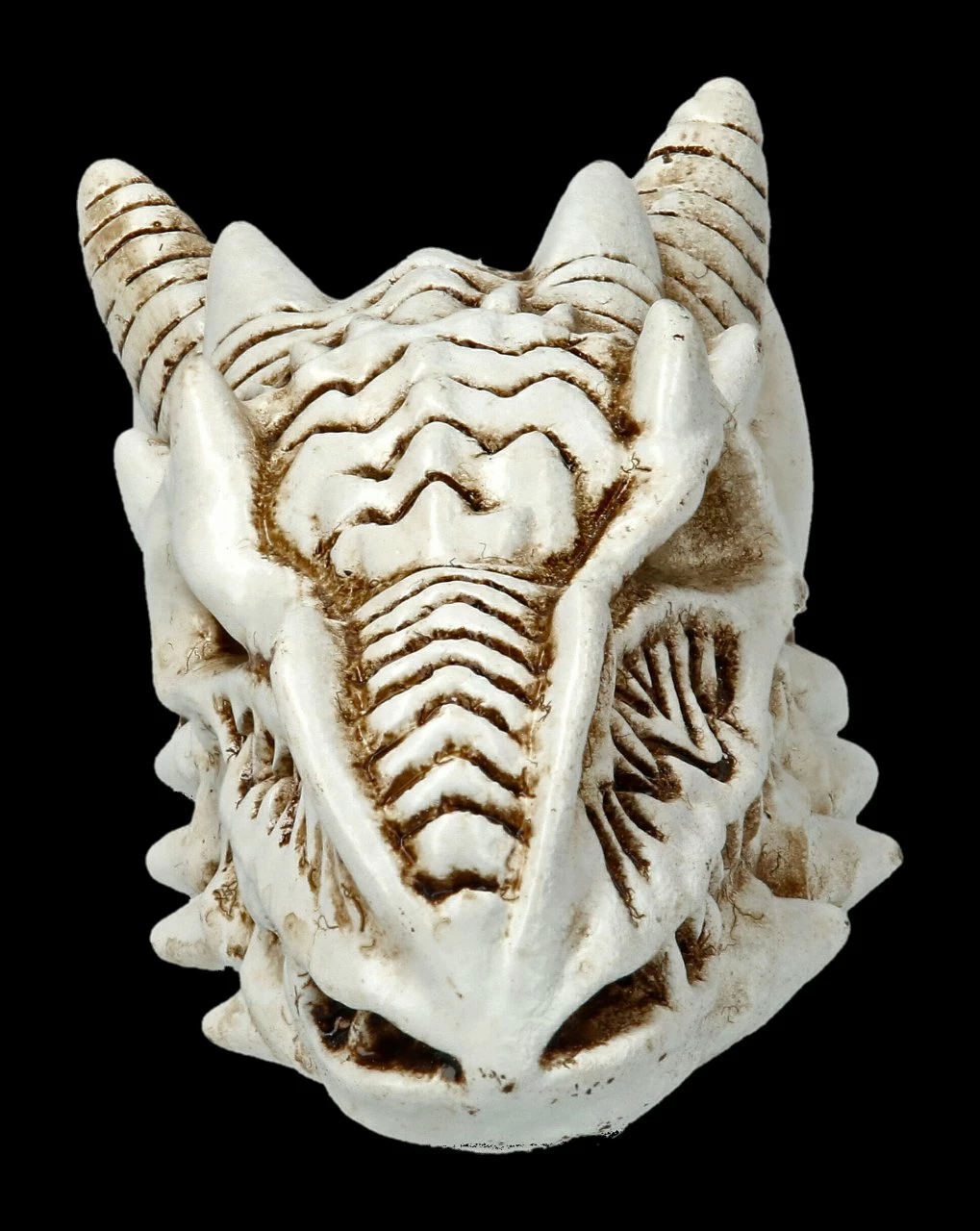 Außerordentlich detailreich und wie ein richtiges Urzeit-Fossil ist der kleine Drachen-Schädel aus handbemaltem Kunststein (Polyresin) gefertigt. Der kleine Drachen-Totenschädel von Alchemy England ist 2 cm hoch, 2,5 cm breit und 5,5 cm tief.