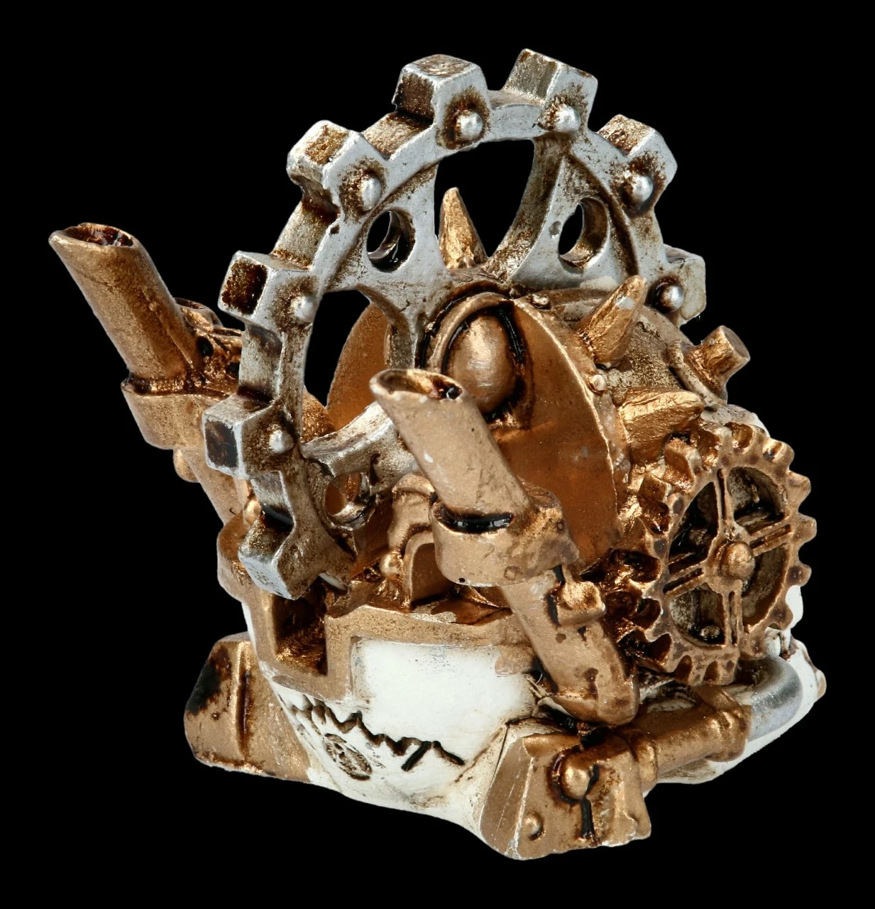 Obwohl er nur eine Höhe von 4 cm, eine Breite von 3 cm und eine Tiefe von 4 cm hat, ist dieser kleine Steamhead-Totenkopf von Alchemy England mit zahlreichen detailliert dargestellten technischen Accessoires versehen. Der kleine Totenschädel im Steampunk-Design ist detailreich aus handbemaltem Kunststein (Polyresin) gefertigt und ein tolles Geschenk für Steampunk-Fans.