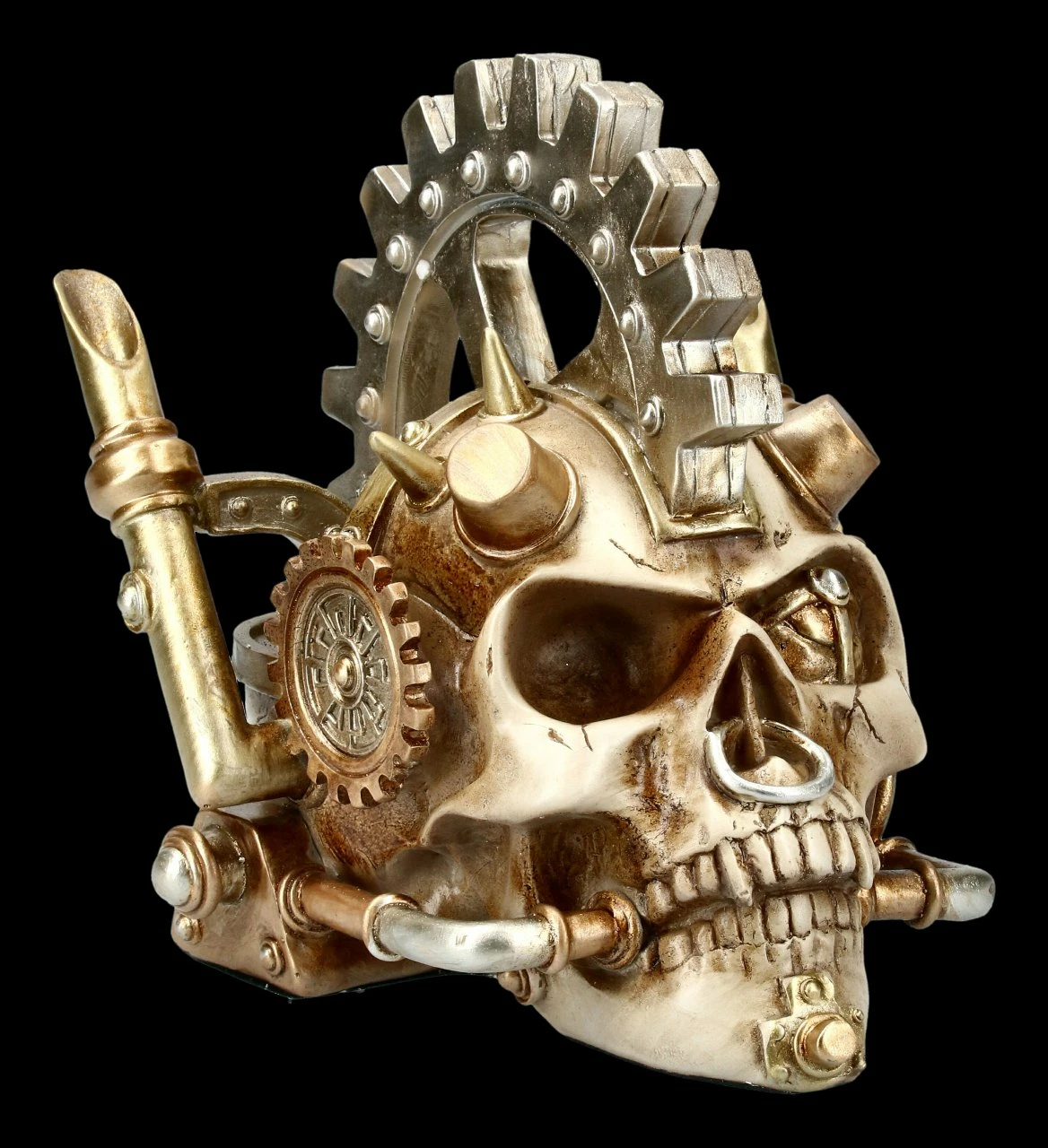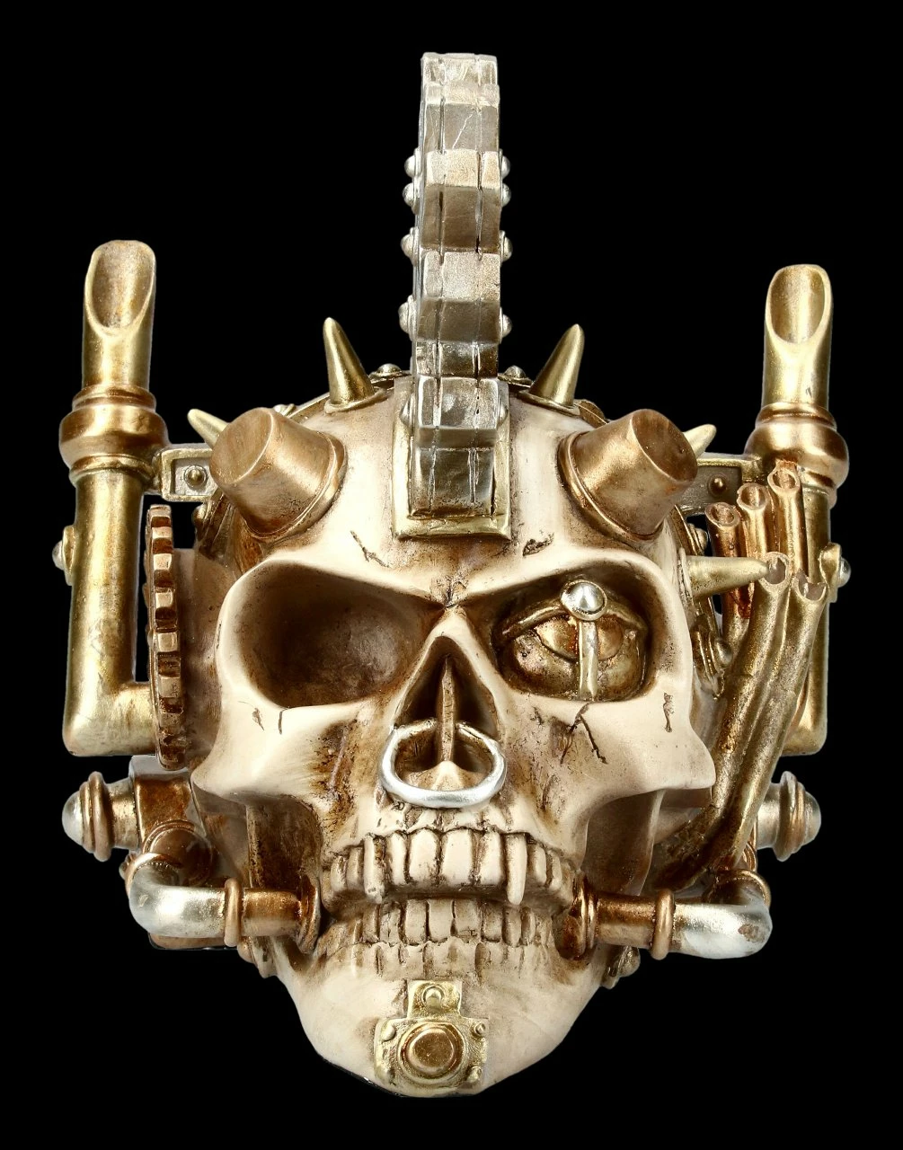 Dieser goldene Steamhead Skull zieht sofort alle Blicke auf sich. Besonders aufregend wirken die mechanischen Teile, die den Totenschädel dekorieren. Der Totenschädel stammt aus der Serie The Vault vom Hersteller Alchemy. Er wurde aus hochwertigem Kunststein (Polyresin) gegossen und anschließend handbemalt.