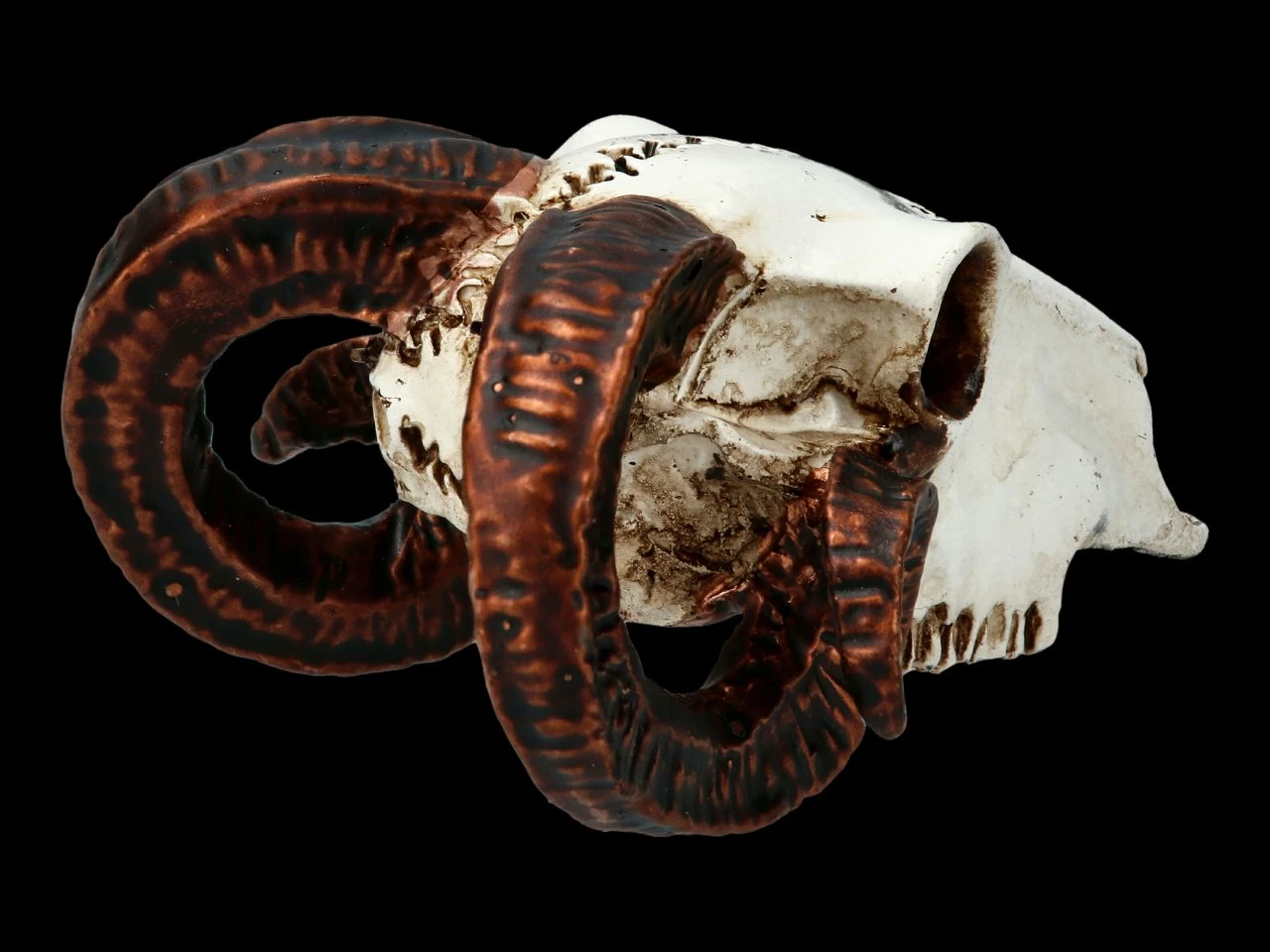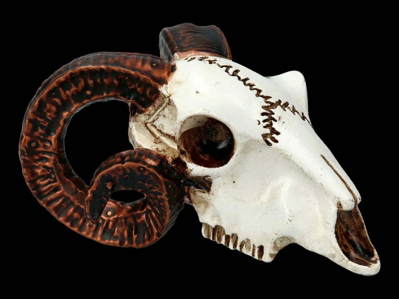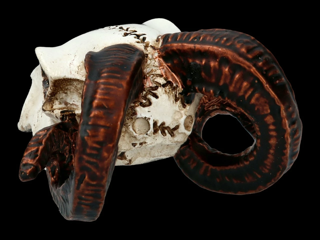 Obwohl der kleine Widder-Totenkopf nur eine Höhe von 2,5 cm, eine Breite von 4 cm und eine Tiefe von 5 cm hat, ist er sehr detailreich aus handbemaltem Kunststein (Polyresin) gefertigt..Gerade weil er so klein ist, ist dieser Widderschädel von Alchemy England ein interessantes Objekt.