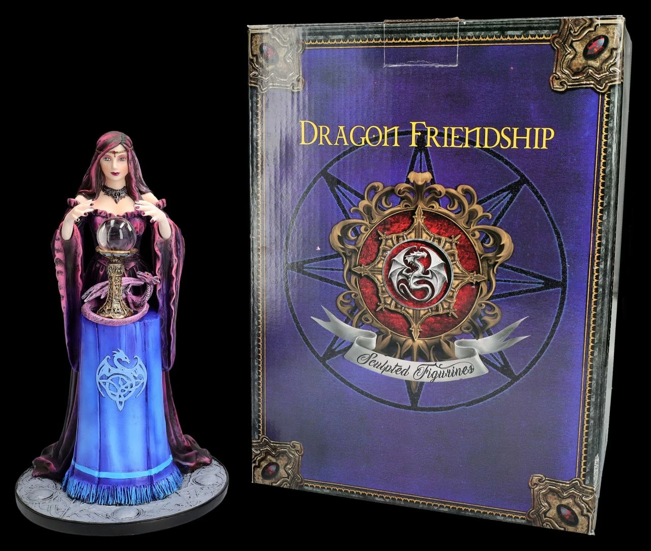 Wenn im geheimnisvollen Land, in dem sich das Königreich der Elfen und Feen befindet, zu wichtigen Feiertagen große Künstler geladen werden, darf die berühmteste Magierin natürlich nicht fehlen. Selbst der kleine violette Drache beobachtet gespannt, was die schöne Magierin in der Kristallkugel sieht und welche Prophezeiungen damit verbunden sind. Denn vor allem der König, aber auch die meisten Bewohner des Elfenreiches beachten die Ratschläge der großen Magierin. Die in London geborene Fantasy-Künstlerin Anne Stokes ist für ihre fantasievollen und lebensechten Darstellungen mystischer Wesen, wie z.B. Elfen, Feen, Einhörner, Wölfen und vor allem auch Drachen in ihrer geheimnisvollen Welt berühmt. Sie hat bei dieser bezaubernd magischen Figur ‚Crystal Ball‘ den Auftritt der Magierin mit ihrer Kristallkugel perfekt eingefangen. Die fantasievolle, 25 cm hohe, 15 cm breite und 15 cm tiefe Anne Stokes-Figur aus der Serie ‚Dragon Friendship‘ ist sehr detailreich aus Kunststein (Polyresin) entstanden und wurde liebevoll von Hand bemalt. Sie ist nicht nur für Sammler auch ein zauberhaftes Geschenk und kommt daher mit einem schön bedruckten Geschenkkarton.