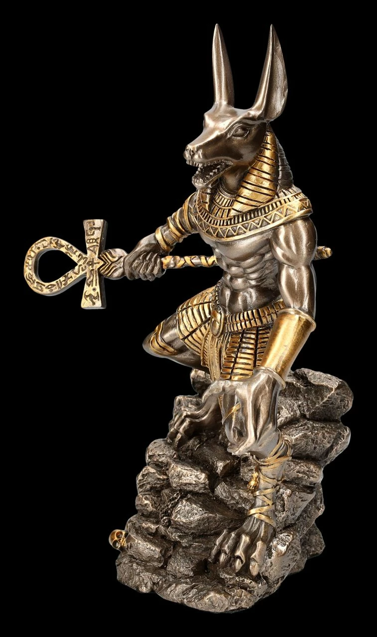 Edel bronziert ist diese detailreiche und hochwertige Anubis Figur aus Kunststein (Polyresin). Der altägyptische Gott der Totenriten und Mumifizierung steht angriffslustig wie ein mächtiger Krieger auf einem Felsen und hält seinen Stab mit dem Anch-Kreuz, dem altägyptischen Symbol für das Weiterleben im Jenseits, wie eine Waffe in seiner rechten Hand. Wer fürchtet ihn nicht? Zu seinen Füßen sind zahlreiche Schädel zu sehen. Als Richter der Toten führte Anubis nach der altägyptischen Mythologie die Seelen in die Unterwelt. Auf der einen Seite stand er auch für das Böse, auf der anderen Seite wurde Anubis als verantwortungsvoller Gott, der seine Macht mit großer Weisheit ausübte und für das natürliche Gleichgewicht stand, verehrt. Diese fantastische Figur zeigt Anubis, wie er dieses Gleichgewicht zu verteidigen scheint. Die 24 cm hohe, 19 cm breite und 12,5 cm tiefe bronzierte Figur des Anubis als Krieger auf dem Felsen ist ein interessantes und faszinierendes Geschenk für jeden, der sich für die ägyptische Mythologie interessiert.