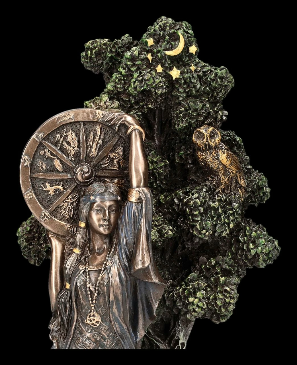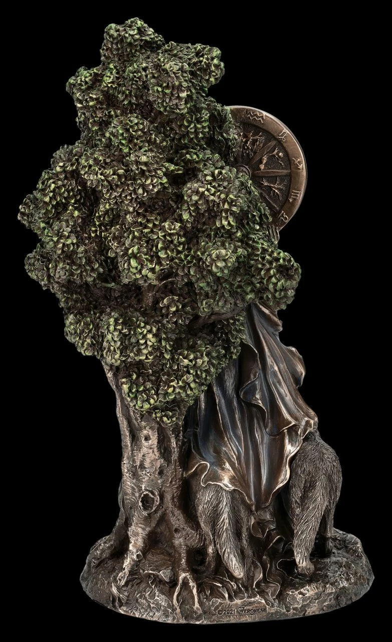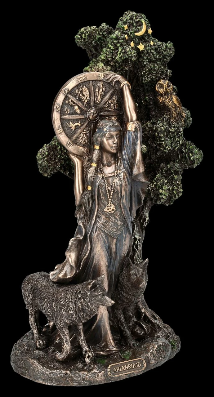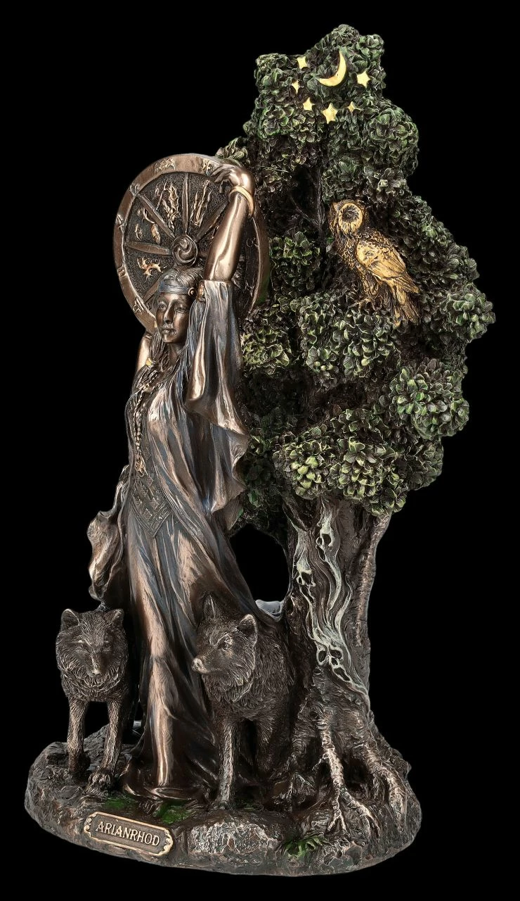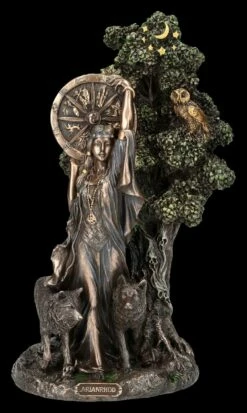 Arianrhod, die keltische Göttin des Schicksals scheint direkt aus dem Lebensbaum hervorzutreten. Das Rad des Lebens oder auch das Silberrad, das ihr den Namen gegeben hat, hält sie hoch über ihren Kopf erhoben. Arianrhod wird in der walisisch-keltischen Mythologie auch als Göttin des Abendhimmels und der Dämmerung bezeichnet. Das zeigt bei dieser detailreichen Skulptur auch die Eule in dem Geäst des alten Baumes. Begleitet wird die in ein feines fließendes Gewand gekleidete Göttin bei dieser Skulptur von zwei Wölfen. Die wunderbare Arianrhod-Figur aus der Studio Collection von Veronese wurde aus hochwertigem Kunststein (Polyresin) gefertigt. Sie wurde edel bronziert und sehr fein coloriert. Die 23,5 cm hohe, 14 cm breite und 10 cm tiefe herrliche Arianrhod-Figur ist nicht nur ein magischer Blickfang, sondern als Schicksalsgöttin auch ein perfektes Geschenk.
