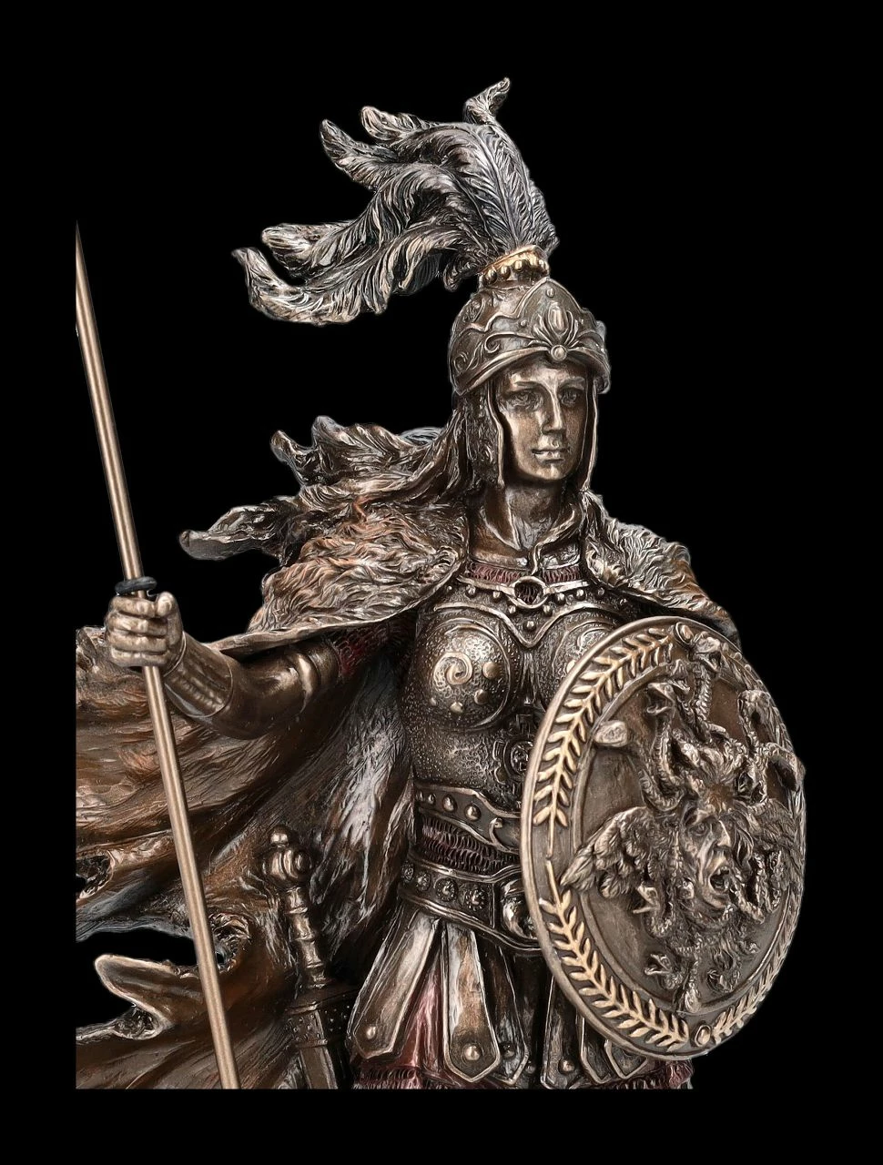Die Göttin Athena oder auch Athene aus der altgriechischen Mythologie war nicht nur die Göttin der Weisheit, der Kunst, des Handwerks und der Handarbeit. Athena war auch die Schutzgöttin und Namensgeberin der griechischen Hauptstadt Athen und auch Göttin der Strategie und des Kampfes. In kriegerischer Ausrüstung mit dem Speer in der rechten Hand und ihrem Schild mit dem Kopf der Medusa in der linken Hand steht Athena mit wehendem Umgang fest auf dem felsigen Untergrund. Sie lächelt, denn sie ist überzeugt, dass sie siegen wird. Diese wunderbare 30 cm hohe, 17 cm breite und 9 cm tiefe Figur der Göttin Athena mit Schild und Speer stammt aus der Studio Collection von Veronese. Die edel bronzierte und sorgfältig colorierte Figur wurde aufwändig aus Kunststein (Polyresin) gefertigt. Der Speer ist zum Stecken. Diese edle Figur wird überall zum sofortigen Blickfang und sollte daher gut sichtbar aufgestellt werden. Sie ist aber auch ein perfektes Geschenk für jeden, der von der griechischen Mythologie begeister ist.