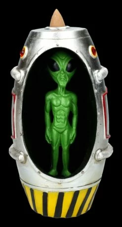 Soll er oder soll er nicht? Ein Alien ist gerade mit der Rettungskapsel auf der Erde gelandet, scheint aber zu zögern, ob er die Kapsel verlassen sollte. Wenn der Räucherkegel brennt, umwabert ein Nebel das grüne Männchen, das dadurch sehr mystisch wirkt. Der fantasievolle Backflow Räucherhalter mit der Alien Rettungskapsel ist 17,5 cm hoch, 9,5 cm breit und 9 cm tief. Er wurde detailreich aus handbemaltem Kunststein (Polyresin) gefertigt und ist ein fantastisches Geschenk für Science Fiction Fans. 3 Backflow Räucherkegel sind in der Lieferung enthalten, weitere finden Sie natürlich in unserem Shop. Bitte beachten Sie unsere Sicherheitshinweise bei der Verwendung des Backflow-Räucherhalters.
