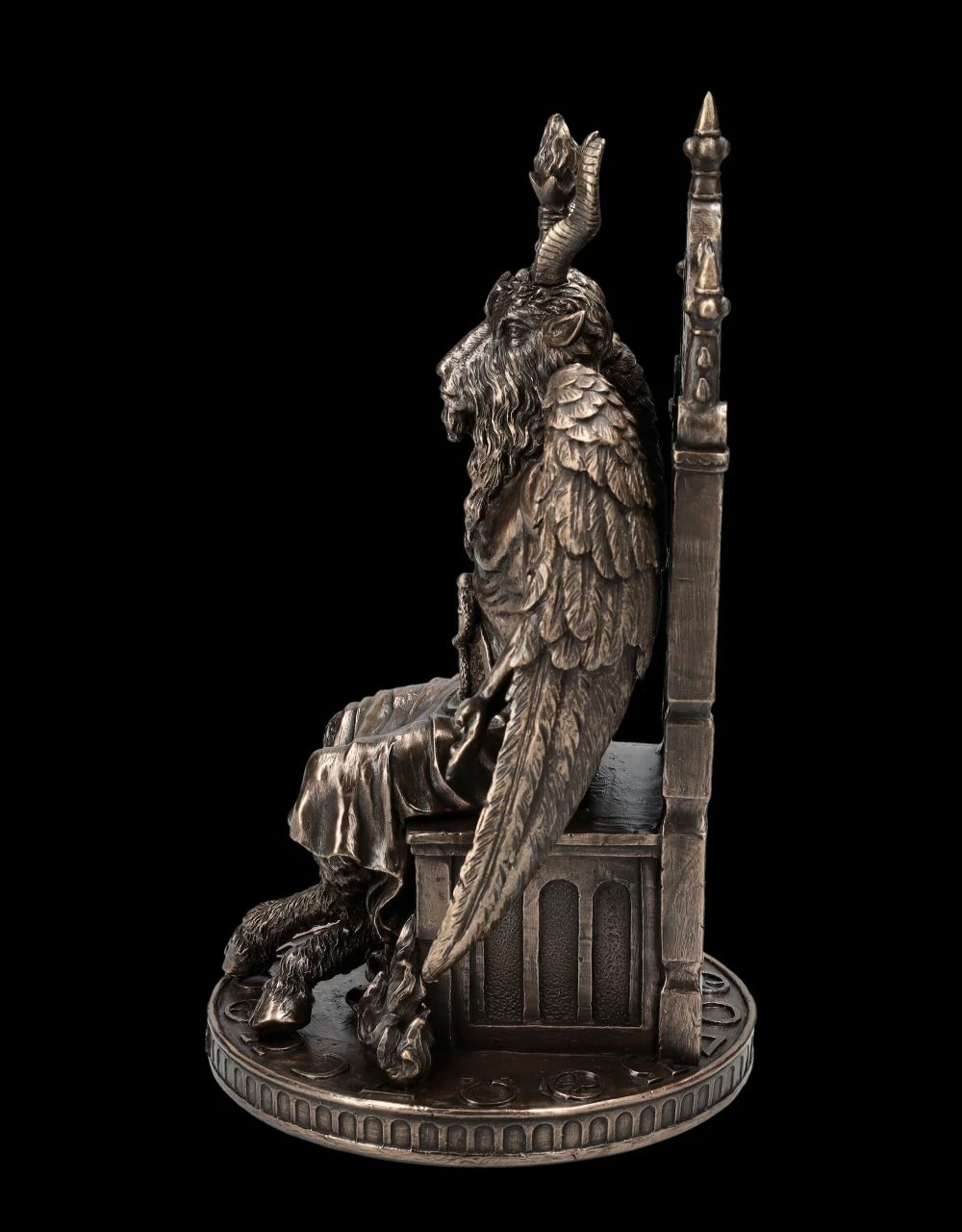 Baphomet, der gefallene Engel mit dem Ziegenkopf, den Pferdehufen und den großen Flügeln sitzt majestätisch auf seinem Thron. Einst von den Templern und Freimaurern als Sinnbild für ‚Gut und Böse‘ verehrt, hat Baphomet, vor allem auch mit dem Pentagramm als mächtiges Schutzsymbol, mittlerweile viele Anhänger. Heute wird er zwar von vielen als Symbol des Satans gesehen, andere sehen in ihm jedoch eine Gottheit und eine Möglichkeit für eine spirituelle Entwicklung. Baphomet vereint die Gegensätze wie ‚Engel und Teufel‘, ‚Gut und Böse‘, ‚Tier und Mensch‘, ‚Mann und Frau‘. Die sehr archaisch, aber auch edel wirkende Skulptur des Baphomet auf dem Thron aus hochwertigem Kunststein (Polyresin) stammt aus der Studio Collection von Veronese. Die 24 cm hohe, 14 cm breite und 14 cm tiefe edel bronzierte Figur hat in der detaillierten Darstellung eine außerordentlich große Wirkung. Diese Skulptur des Baphomet auf dem Thron wird garantiert überall zum sofortigen Blickfang.