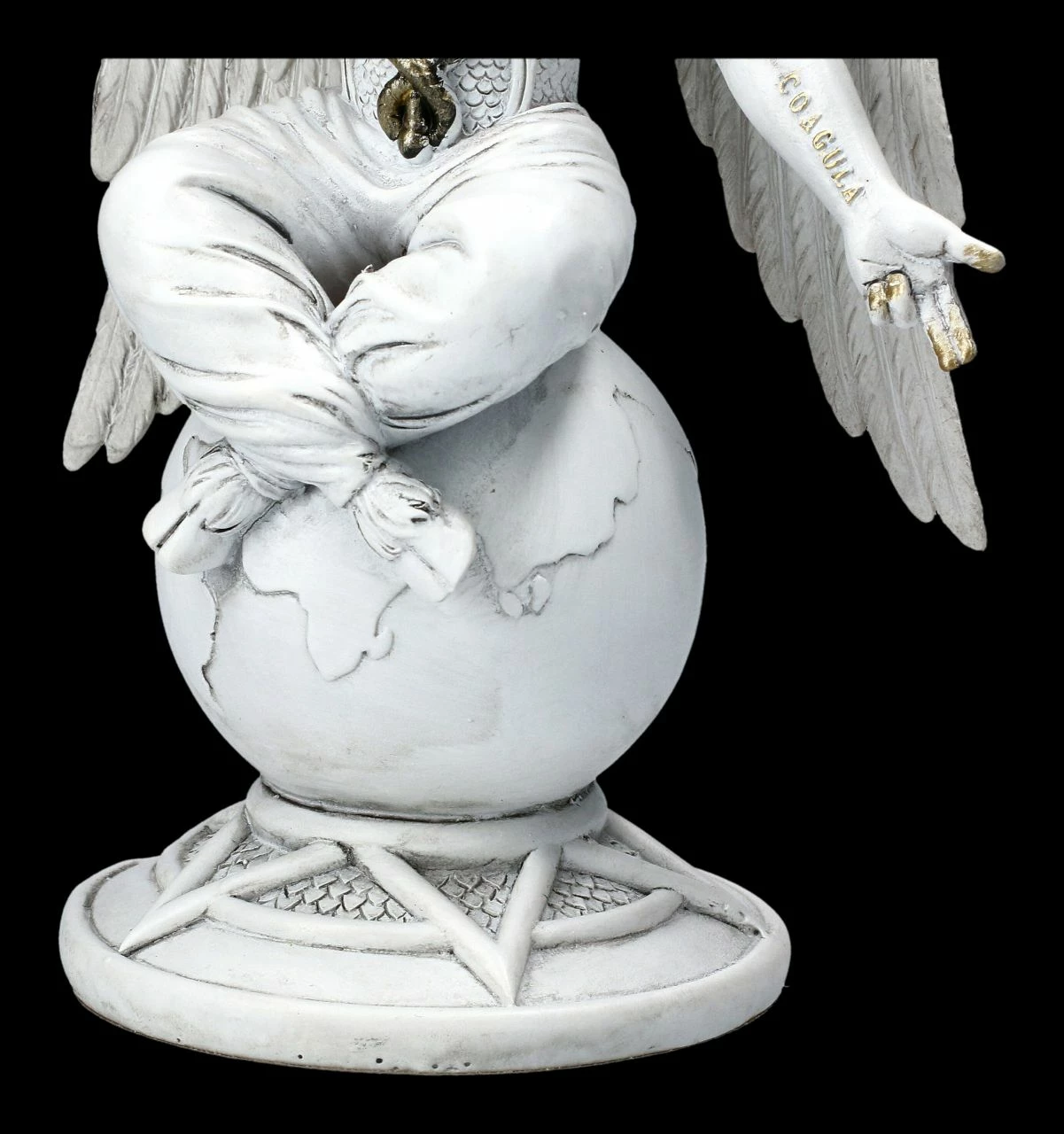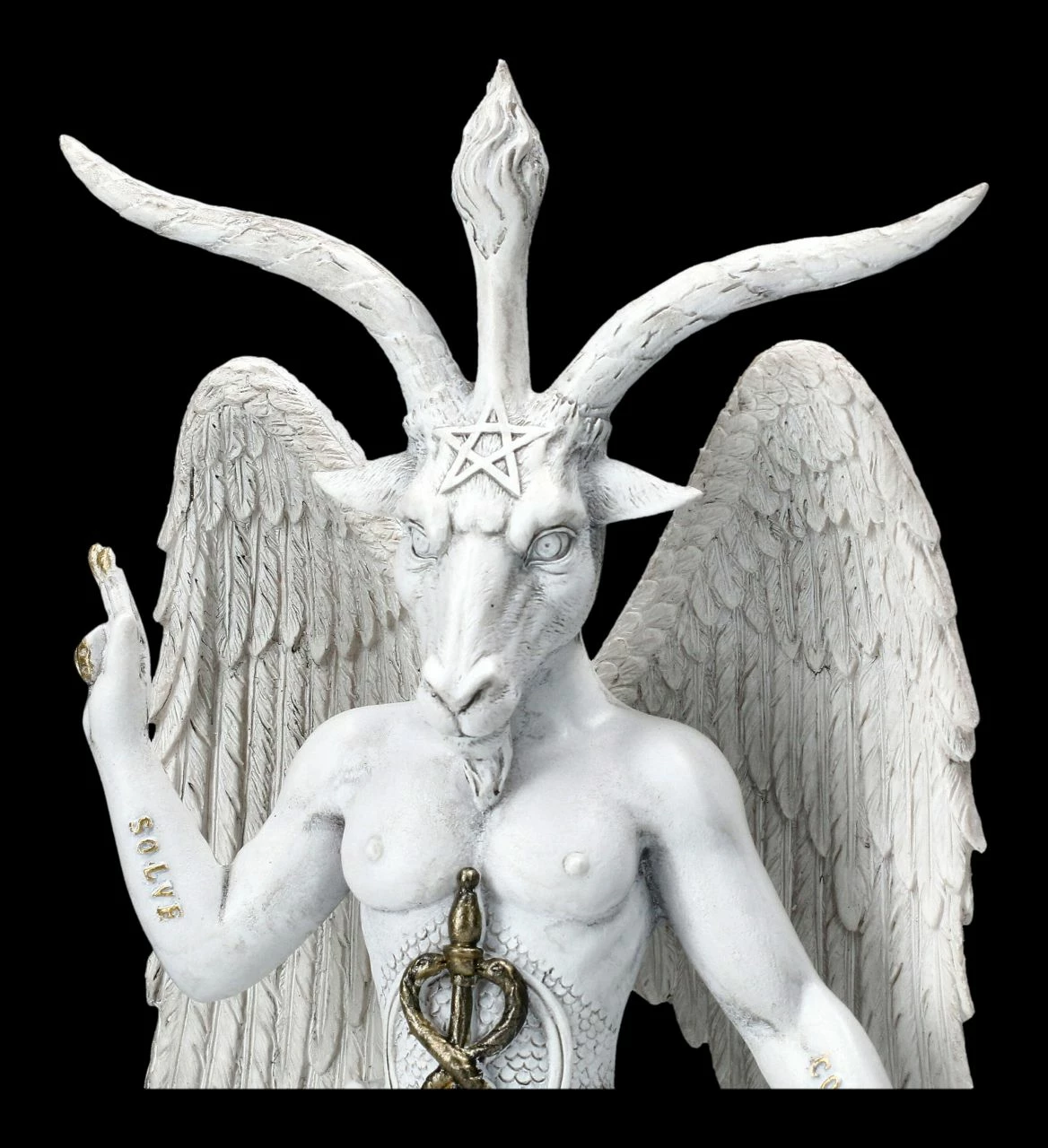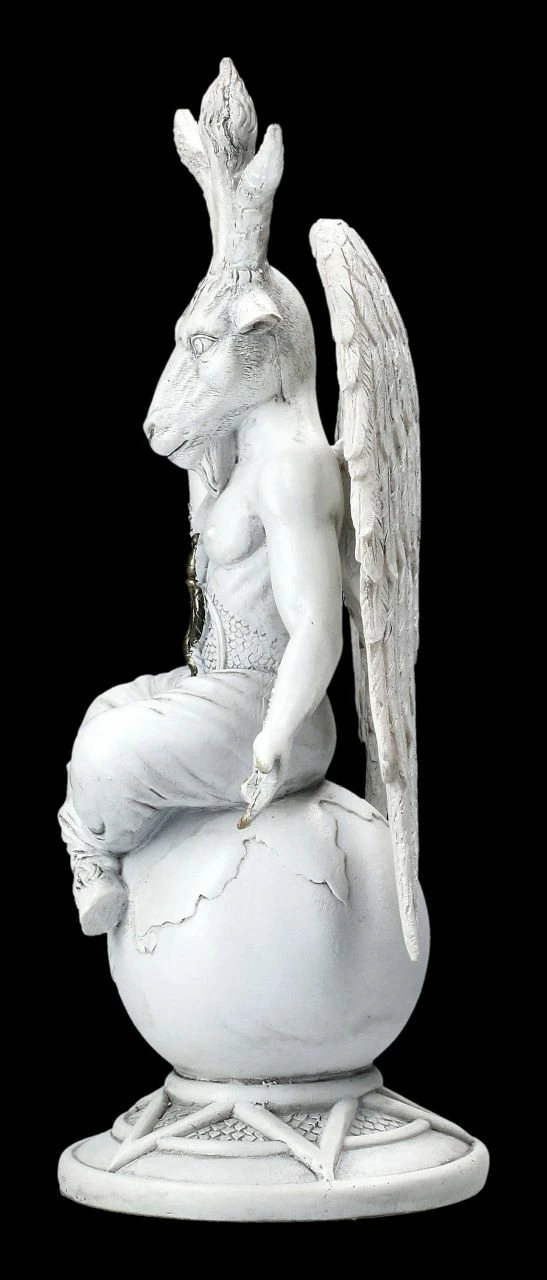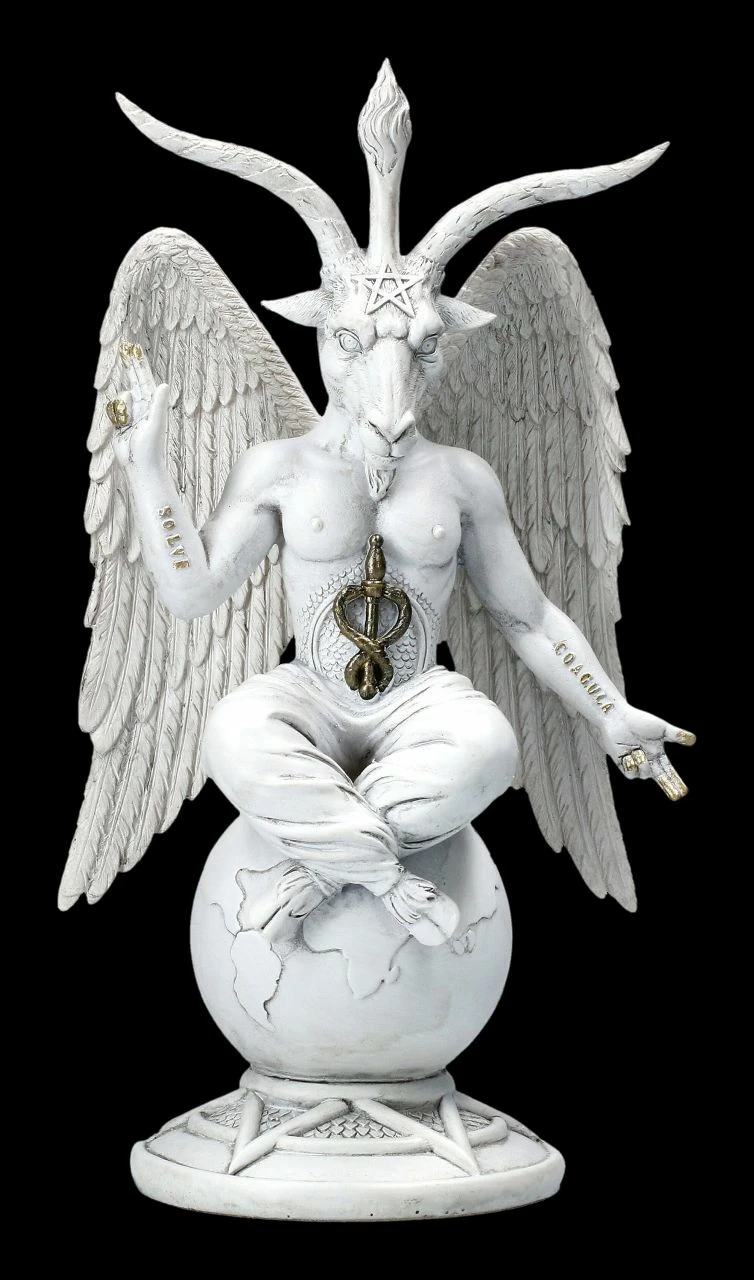 Einer Darstellung aus dem 19. Jhdt. nachempfunden ist diese schöne Baphomet Figur mit dem Ziegenkopf und den gegensätzlichen Attributen, wie gut und böse, halb Tier-halb Mensch, männlich-weiblich, Ganz in weiß und mit großen Engelsflügeln sitzt The Dark Lord auf einer Weltkugel, die wiederum auf einer runden Platte mit Pentagramm ruht. Allerdings schmückt sich Baphomet mit goldenen Akzenten, wie dem Dolch mit den beiden Schlangen am Bauch und den lateinischen Wörtern ‚SOLVE‘ (auflösen) am rechten, nach oben zeigenden Arm und ‚COAGULA‘ am linken, nach unten zeigenden Arm. Die Baphomet Figur wirkt in der weiß-goldenen Farbgebung sehr edel. Sie ist sehr fein aus Kunststein (Polyresin) gefertigt und sorgfältig handbemalt. Die Figur hat eine Höhe von 26 cm, eine Breite von 15 cm und eine Tiefe von 10 cm und wird mit Sicherheit alle Blicke magisch auf sich ziehen.