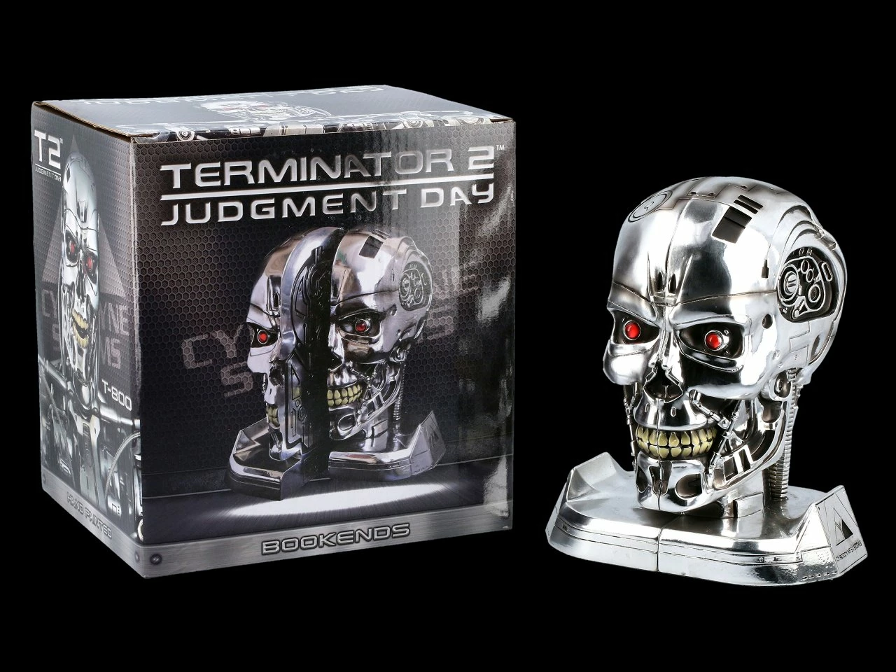 Egal ob geöffnet als Buchstütze oder zusammen geschoben als Büste, die lizensierten Terminator 2 T-800 Buchstützen sind einfach der Wahnsinn! Die handbemalten Schädelhälften sind aus hochwertigem Kunststein (Polyresin) gefertigt und werden zum absoluten Blickfang in jedem Regal oder auf dem Sideboard. Für jeden Terminator-Fan sind diese unglaublichen Buchstützen ein perfektes Geschenk und werden in einer passend bedruckten Geschenkverpackung geliefert.