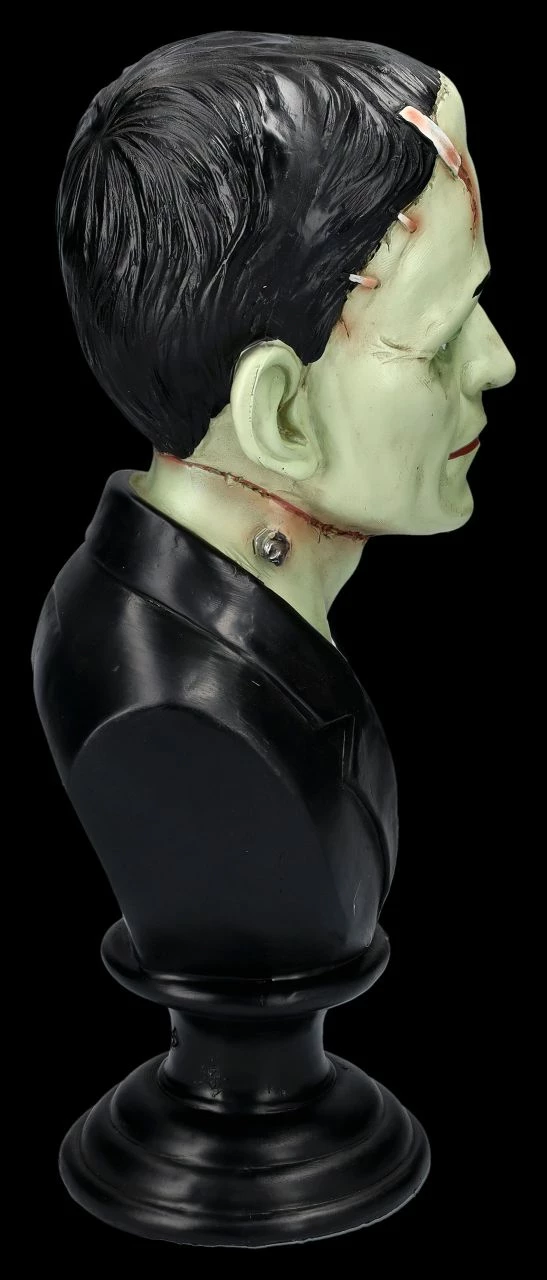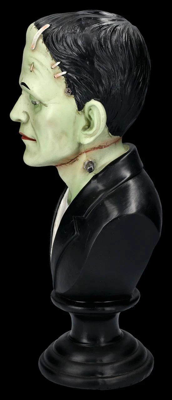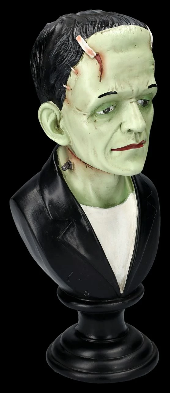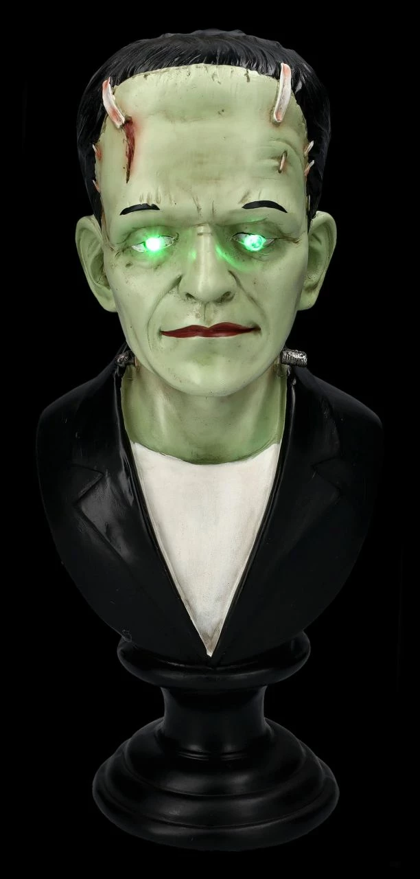 Frankensteins Monster ist unglücklich und deprimiert und das sieht man dieser detailreich aus handbemaltem Kunststein (Polyresin) gefertigten Skulptur auch an. Aber nicht nur das – durch die batteriebetriebene LED-Beleuchtung ist nicht nur das Gesicht grün, sondern im Dunkeln leuchten auch noch die Augen grün. Die 35 cm hohe, 16 cm breite und 12,5 cm tiefe Skulptur mit dem Kopf von Frankensteins Monster ist eine wirklich ungewöhnliche Deko, bei der es viel zu schade ist, wenn sie nur an Halloween aufgestellt wird. Für die LED-Beleuchtung werden 2 x LR44 Batterien benötigt, die nicht in der Lieferung enthalten sind.