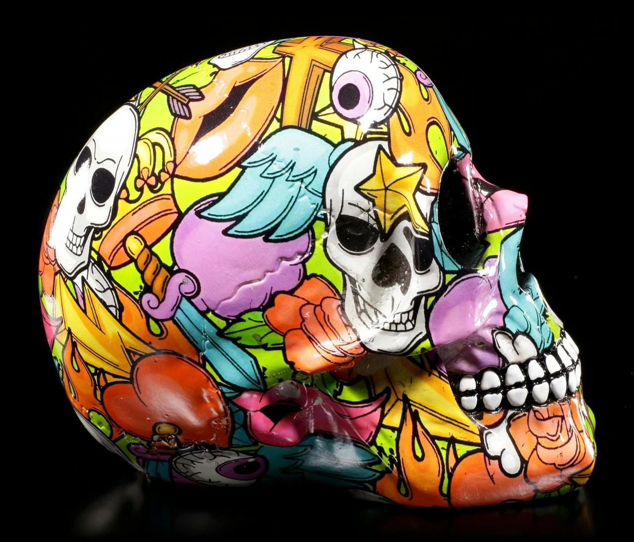 Calypso, der bunt bedruckte Totenschädel im Comic Stil sieht aus wie tätowiert. Egal wie man ihn dreht und wendet, man findet immer etwas Neues, was man vorher noch nicht gesehen hat.