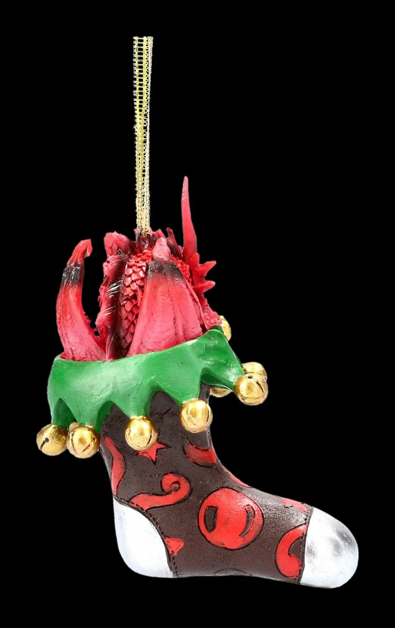 Ein kleiner roter Drache schaut frech aus dem bunten Weihnachtsstrumpf heraus, mit dem Sie Ihren Weihnachtsbaum mal außergewöhnlich schmücken können.. Der witzige Drache mit Strumpf ist aus detailreich handbemaltem Kunststein (Polyresin) gefertigt und zum Hängen. Er ist 11 cm hoch, 7 cm breit und 6,5 cm tief. Dieser Weihnachts-Drache mit Strumpf ist echt lustig und mit den anderen Weihnachtsdrachen aus unserem Shop kombinierbar. So wird Ihr Christbaum zum absoluten Hingucker.
