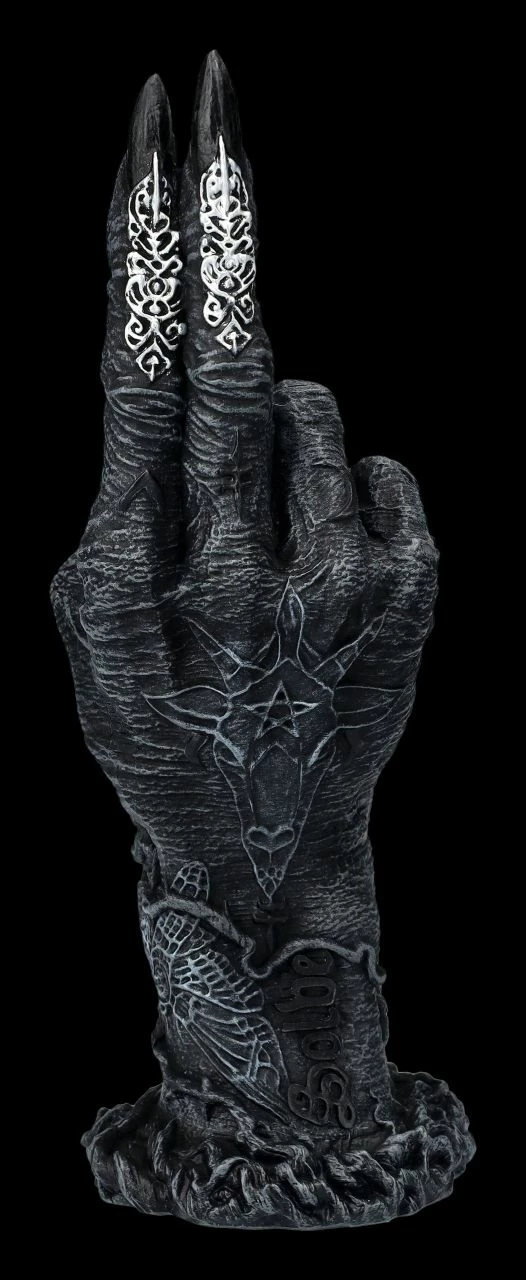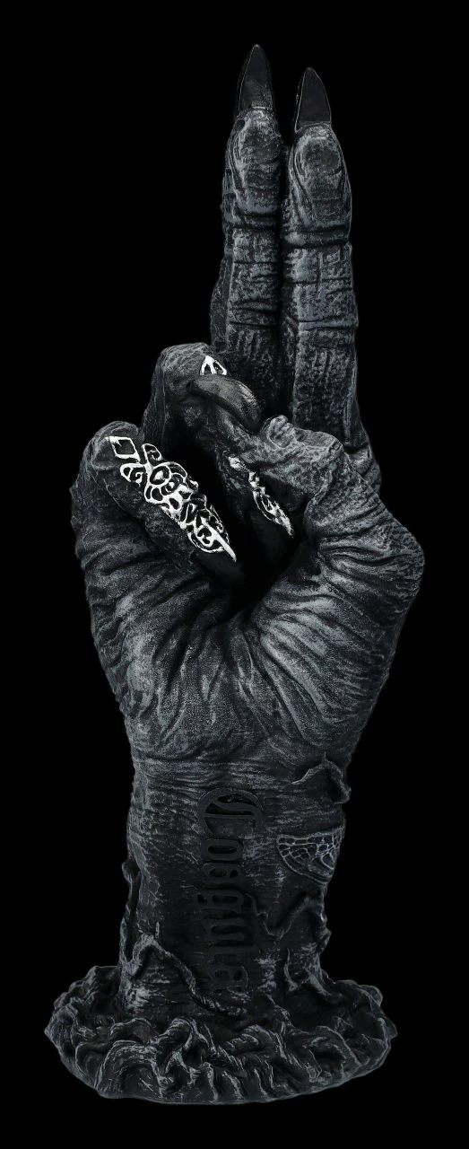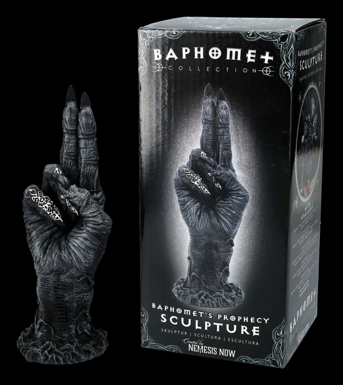 Mit zwei Fingern zeigt bei dieser ungewöhnlichen, 19 cm hohen, 6,5 cm breiten und 6,5 cm tiefen Skulptur Baphomet’s Hand wie aus dem Nichts kommend zum Himmel. ‚Solve‘ und ‚Coagula‘. – also ‚Löse‘ und ‚Verbinde‘ ist auf dem Handgelenk zu lesen. Die wie bereits verfallen aussehende faltige Hand, auf der lediglich der Schmuck silbern glänzt, wurde sorgfältig aus handbemaltem Kunststein (Polyresin) gefertigt. Sie kommt inklusive einer toll bedruckten Geschenkverpackung und passt perfekt in jede Gothic-Sammlung.