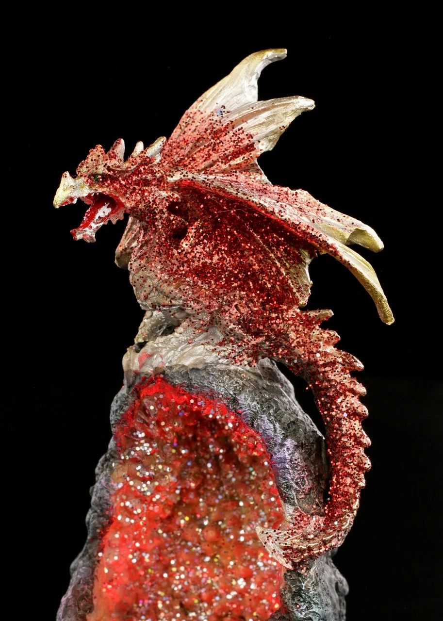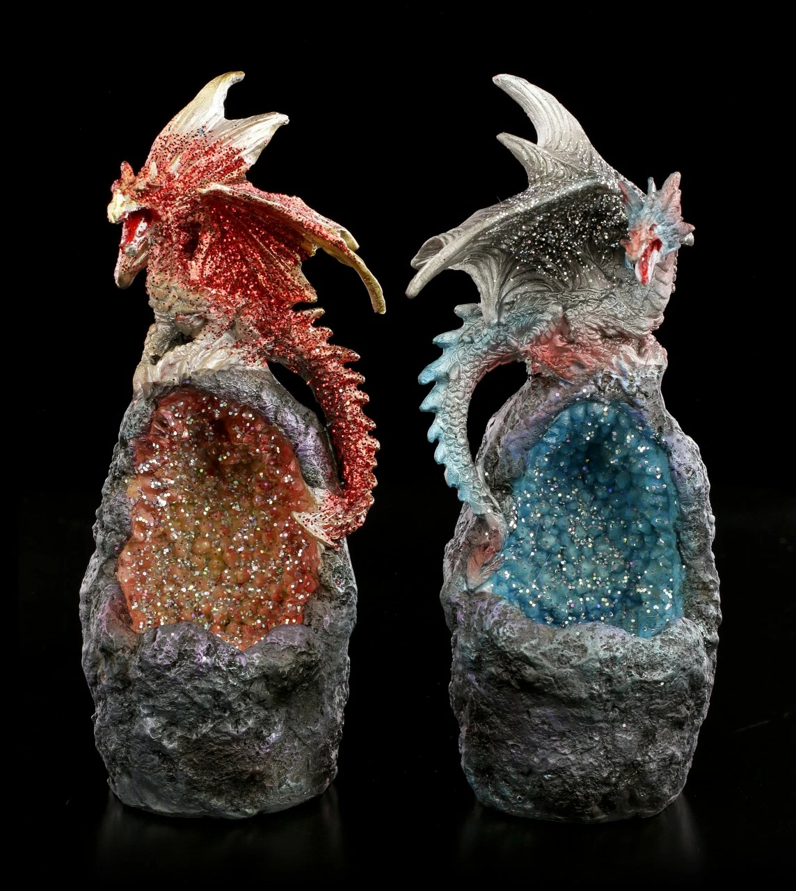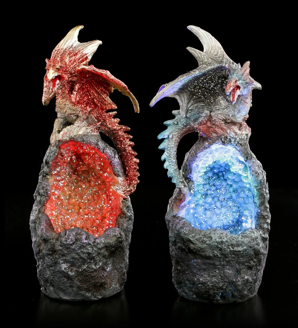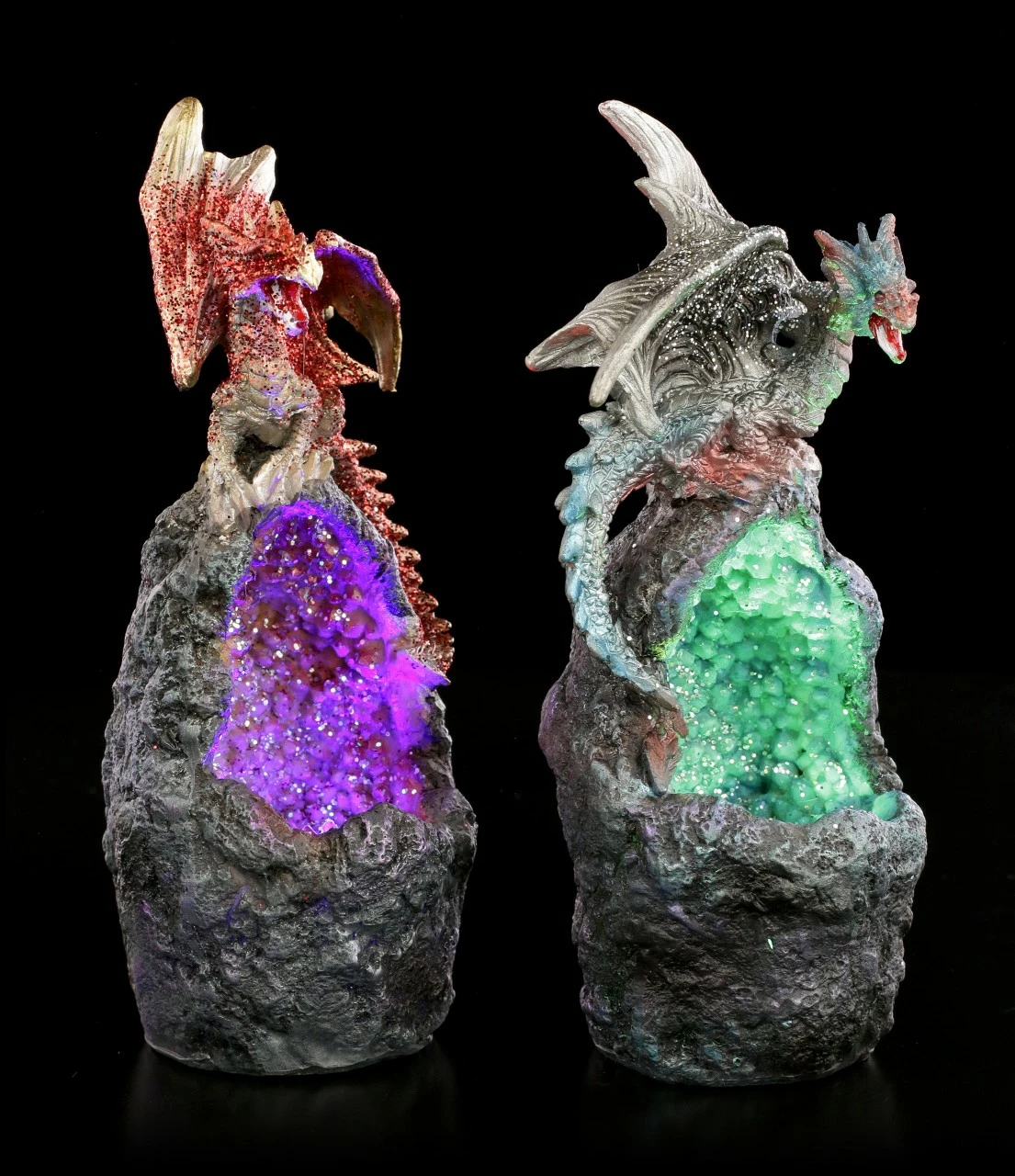 Das Drachen Duo auf magischem Kristall ist ein wunderbares Geschenk für jeden Sammler. Die handbemalte Kunststein Figuren mit integriertem LED Farbwechsler sorgen bei Dunkelheit für eine mystische Ausstrahlung.