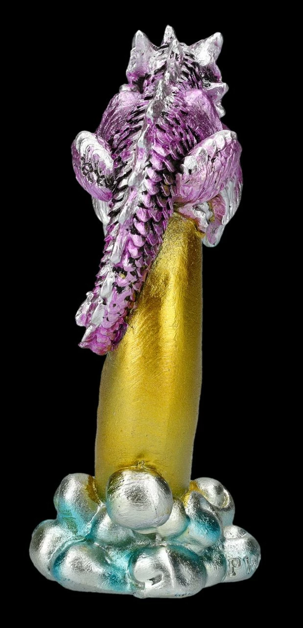 La Li Lu, nur der Mann im Mond schaut zu…. Und schon ist das kleine Drachenbaby, das es bis zur Spitze der Mondsichel geschafft hat, eingeschlafen. Aber auch der Mond selbst schläft selig auf seinem Wolkenbett. Die niedliche Drachen-Figur mit dem kleinen schlafenden Drachen auf dem Mond ist 9 cm hoch, 7 cm breit und 4 cm tief. Sie ist aus liebevoll handbemaltem Kunststein (Polyresin) und nicht nur eine niedliche Deko für Sammler, sondern ein perfektes Geschenk für alle Drachen-Freunde..