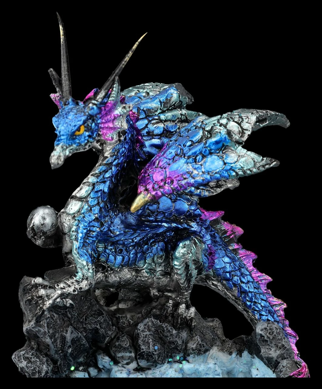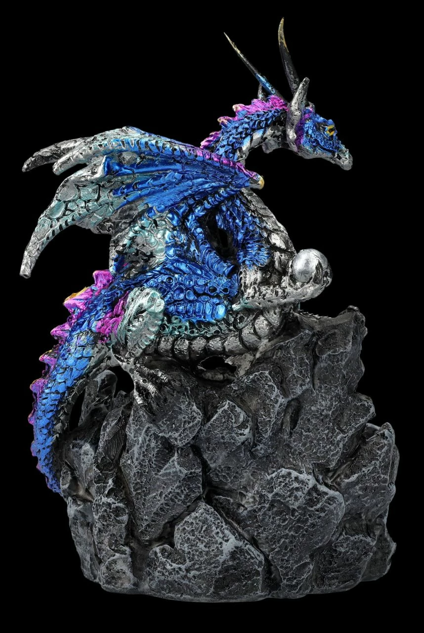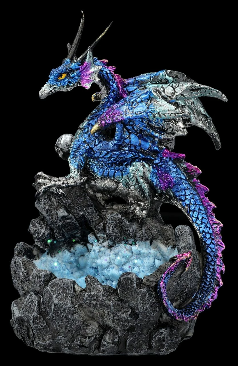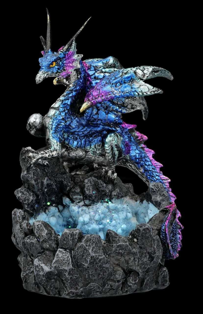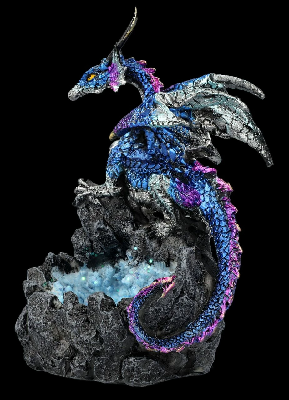 Tief in den dunklen Wäldern, in denen Elfen, Feen und alle möglichen magischen Wesen leben, befindet sich ganz versteckt die blaue Kristallgrotte. Bewacht werden die geheimnisvollen blauen Kristalle von einem gut getarnten Drachen, denn an den seltenen blauen Kristallen sind alle sehr interessiert. Der Drache als Kristallhüter ist 14,5 cm hoch, 9 cm breit und 9 cm tief. Die Drachenfigur ist detailreich aus handbemaltem Kunststein (Polyresin) gefertigt und ein perfektes Geschenk für Drachen-Freunde.