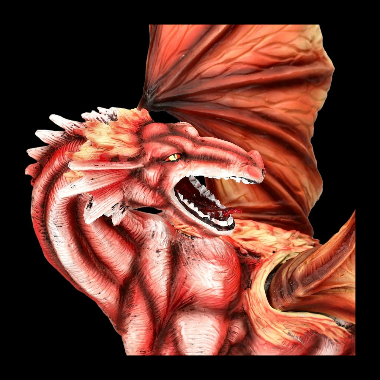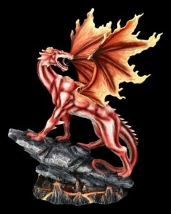 Furchterregend brüllend sitzt der beeindruckende Feuerdrache auf einem Felsen. Feuer ist das Symbol der Verwandlung. Feuer kann zerstören, es verbrennt Altes, kann damit aber auch damit Raum für Neues schaffen und kann mit seiner Wärme Leben erhalten. In vielen alten Kulturen wurde mit Feuer gereinigt. Dieser prächtige große Feuerdrache wurde aufwändig von Hand bemalt und ist 42 cm hoch, 32 cm breit und 22,5 cm tief. Er wurde detailreich aus hochwertigem Kunststein (Polyresin) gefertigt. Die flammend roten Flügel sind zum Stecken. Sammler werden von dieser imposanten Drachen-Figur begeistert sein. Bei der Bedeutung der Sternzeichen steht Feuer für Selbstvertrauen und Energie – also ist dieser mächtige Drache auch ein wunderbar symbolisches Geschenk für alle, die das Element Feuer in ihrem Sternzeichen haben.