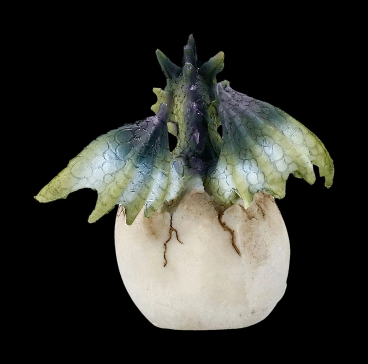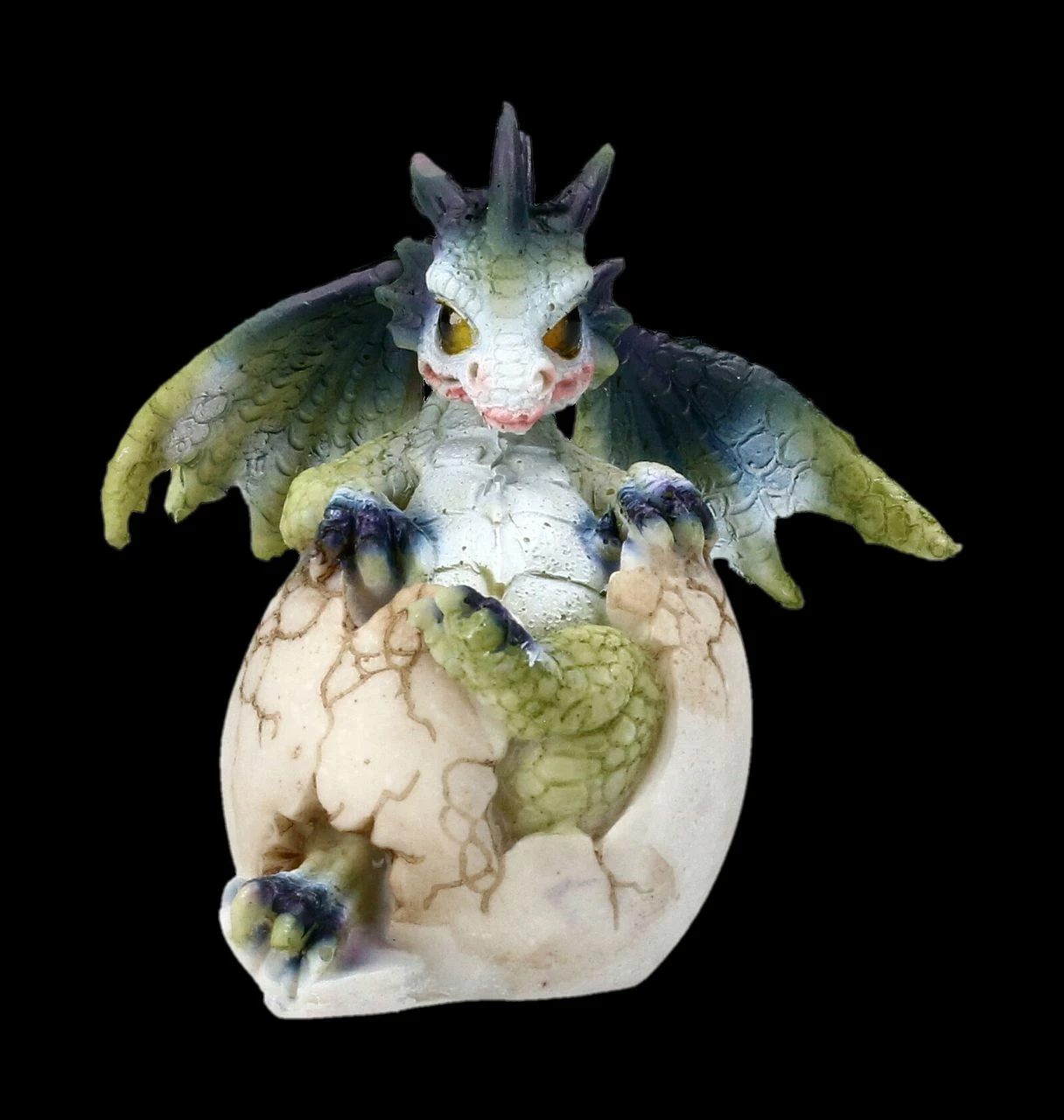 Wartet auf mich! Das unternehmungslustige Drachenbaby Tiny kämpft sich mutig und voller Energie aus dem Ei. Tiny, das gerade aus seinem Ei schlüpfende Drachenmädel, ist aus liebevoll handbemaltem Kunststein (Polyresin) gefertigt und 7,5 cm hoch, 7 cm breit und 7 cm tief. Für alle Sammler ist die putzige kleine Hatchlings Emergence Tiny ein tolles Geschenk. Weitere, gerade aus dem Ei schlüpfende Babydrachen warten übrigens in unserem Shop auf ihre Drachen-Freunde.