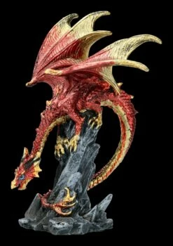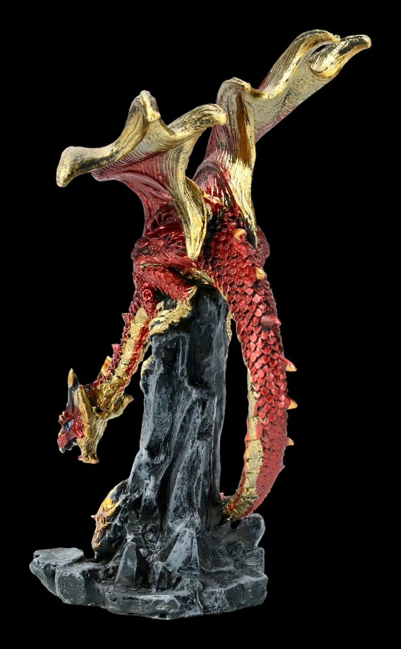 Gut gebrüllt Drache! Auf der Spitze eines Felsens gelandet, verteidigt der rote Drache seinen Platz. ‚Hear me roar‘ – da ist es für Fremde sicher besser, nicht zu nahe zu kommen. Der rote Drache auf seinem Felsen ist sehr detailreich aus handbemaltem Kunststein (Polyresin) gefertigt. Mit einer Höhe von 14 cm, einer Breite von 9,5 cm und einer Tiefe von 7 cm ist er ein tolles Dekoobjekt für jeden Drachenfreund.