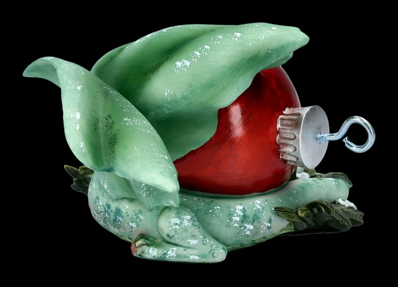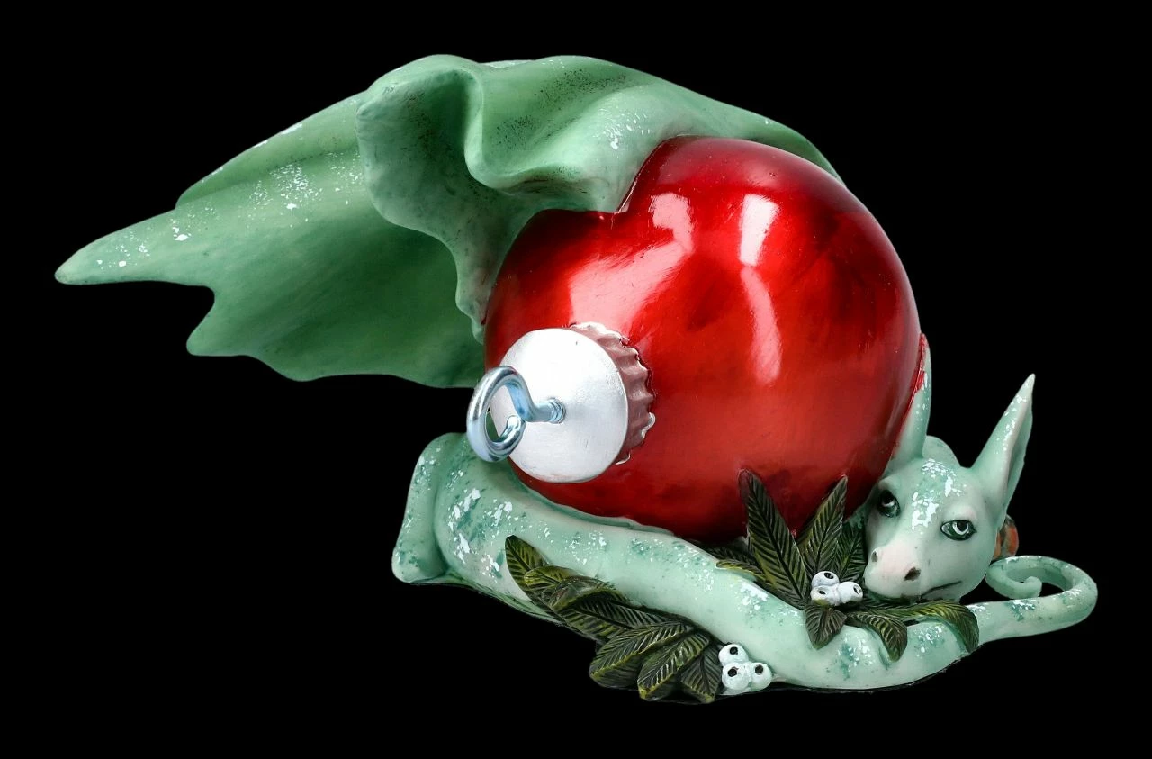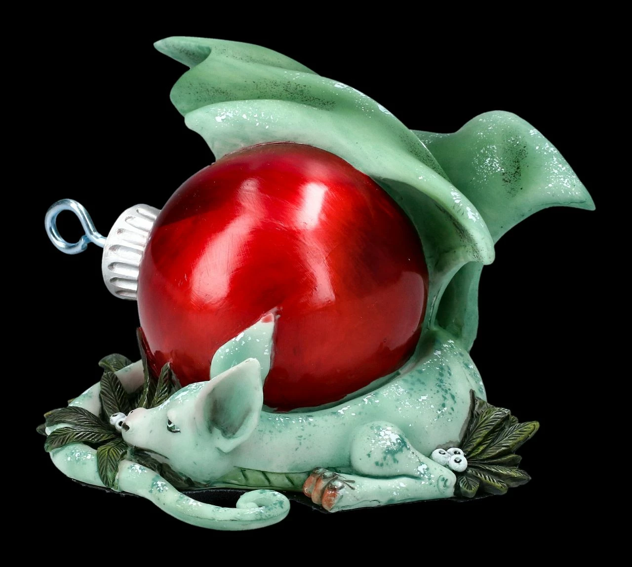 Mit seinen Flügeln hält der niedliche kleine Drache die rote Christbaumkugel fest. Diesen weihnachtlichen Schatz will er sorgsam hüten. Die lustige Drachen Figur mit dem Holiday Treasure ist aus liebevoll handbemaltem Kunststein (Polyresin) gefertigt. Sie ist 8 cm hoch, 13 cm breit und 14 cm tief und nicht nur für Drachenfreunde ein witziges Geschenk.