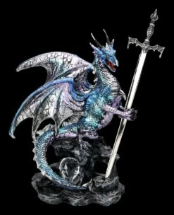 Sword of the Dragon ist ein fantasievolles Accessoire für jeden Schreibtisch. Der prachtvolle Drache, der hoch aufgerichtet einen 21 cm langen Brieföffner aus Metall in Form eines Schwertes in seinen Krallen hält, wurde sehr detailreich aus Kunststein (Polyresin) gefertigt und von Hand bemalt. Der 22,5 cm hohe, 18,5 cm breite und 11,5 cm tiefe Drache mit dem Brieföffner ist aber auch ein außergewöhnliches Geschenk, das nicht nur Drachenfreunden Freude macht.
