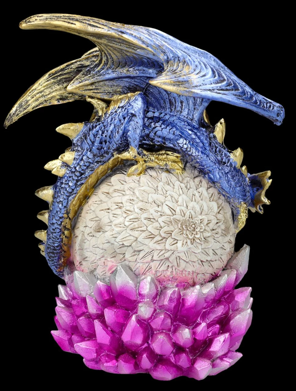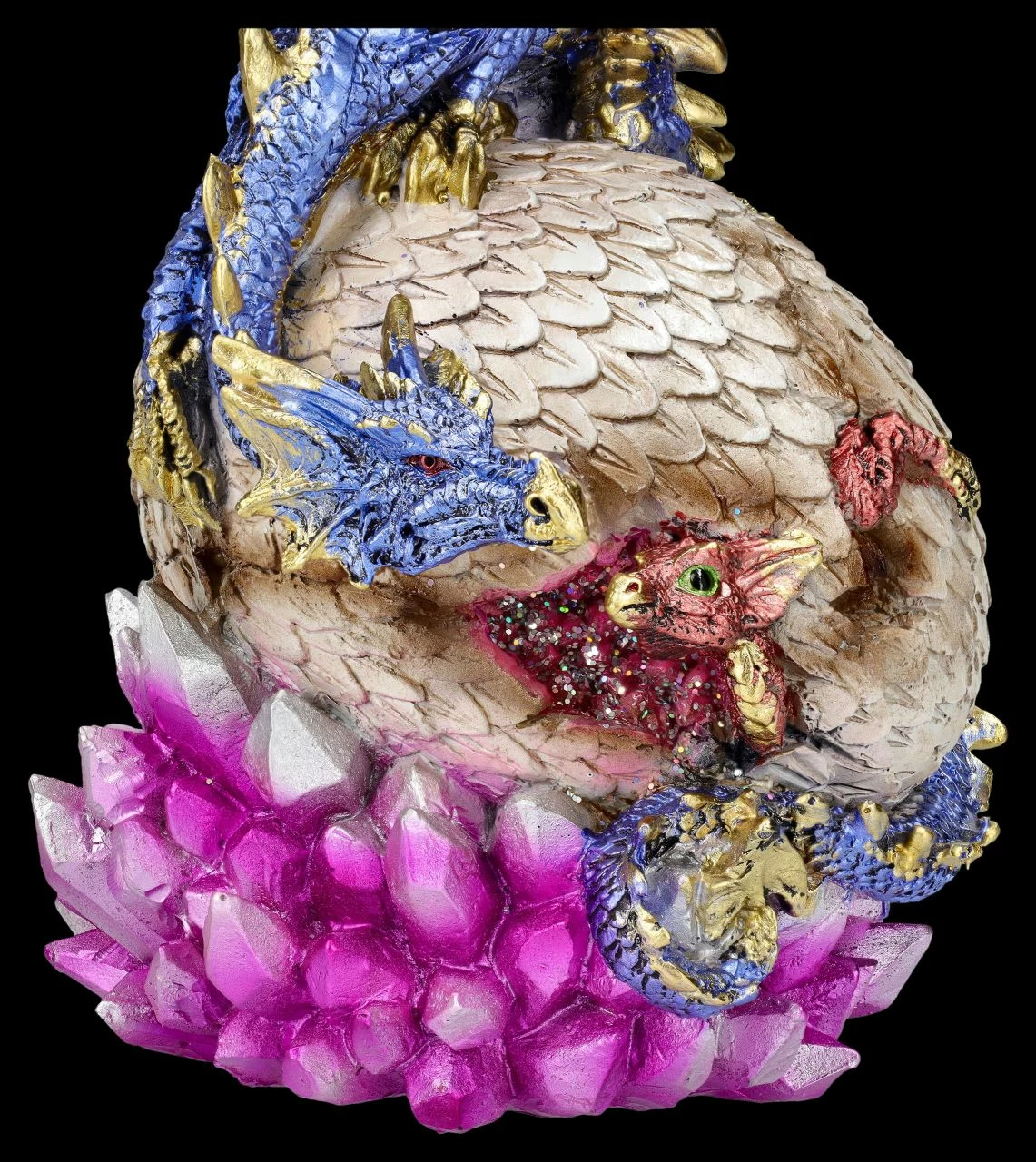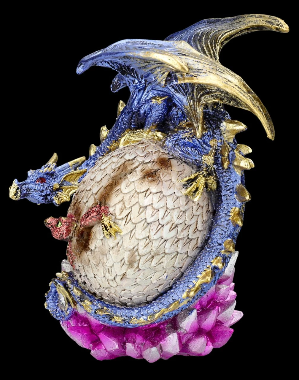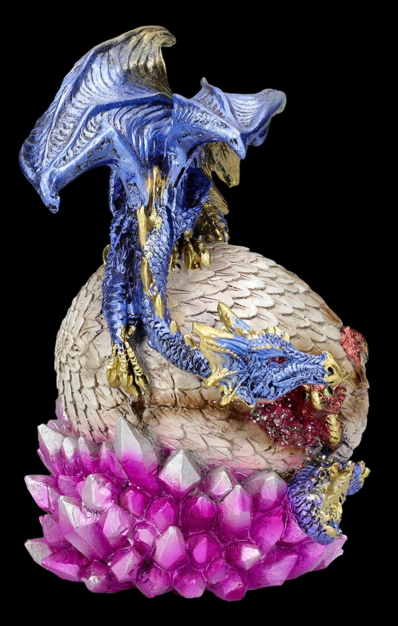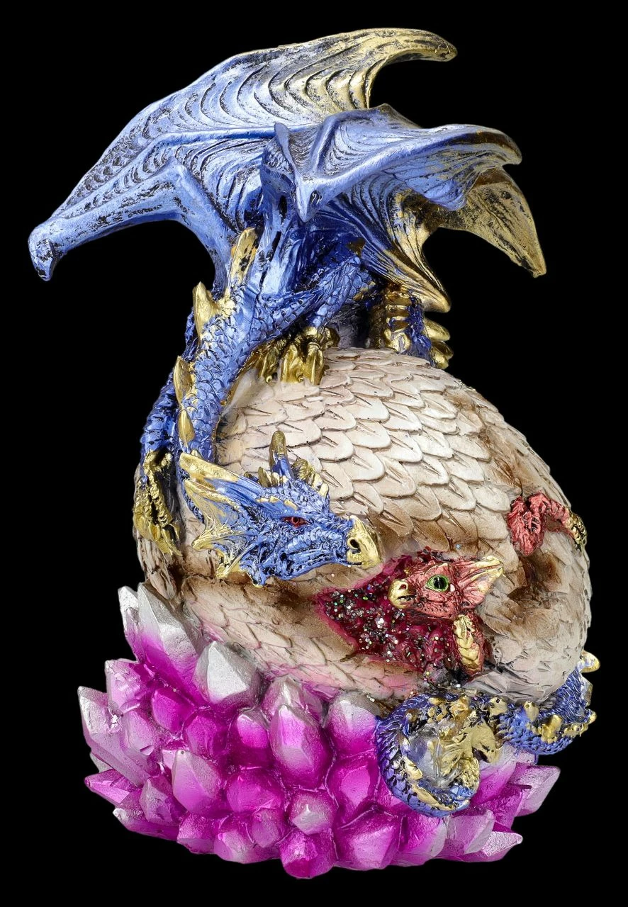Gefunden! Zärtlich blickt der blaue Drache auf seinen Nachwuchs, der frech aus dem auf dem Ei in der Kristallhöhle herausschaut. ‚Na, kommst du jetzt raus aus dem Ei, oder willst du dich weiter verstecken?‘ Tja, wie man bei dieser wunderbar detailreichen Drachen Figur mit dem Jungen sieht, ist das Versteckspiel auch bei den Drachen sehr beliebt. Die liebevoll von Hand bemalte Drachen Figur ‚Hide and Seek‘ ist 17,5 cm hoch, 14 cm breit und 12 cm tief und detailreich aus Kunststein (Polyresin) gefertigt. Sammler und auch alle, die sich für die verborgene und geheimnisvolle Welt der Drachen, Elfen und Feen interessieren,werden sich über diese liebevolle Drachen Figur als Geschenk sicherlich freuen..