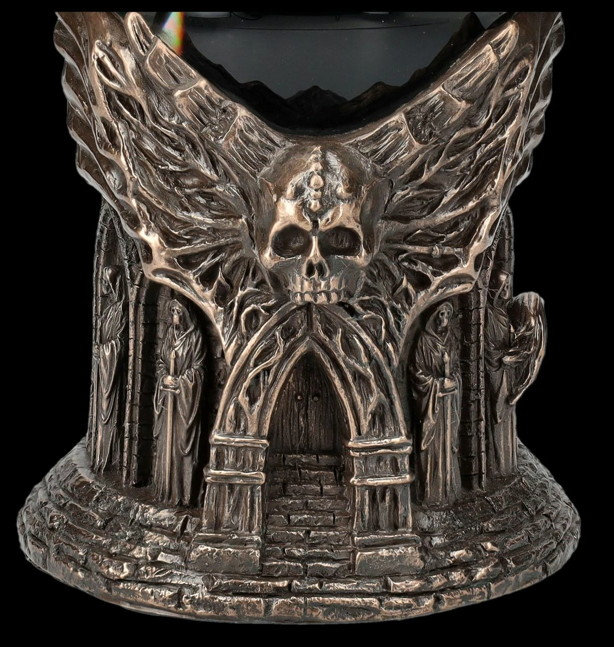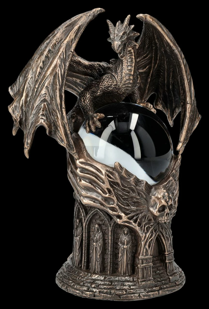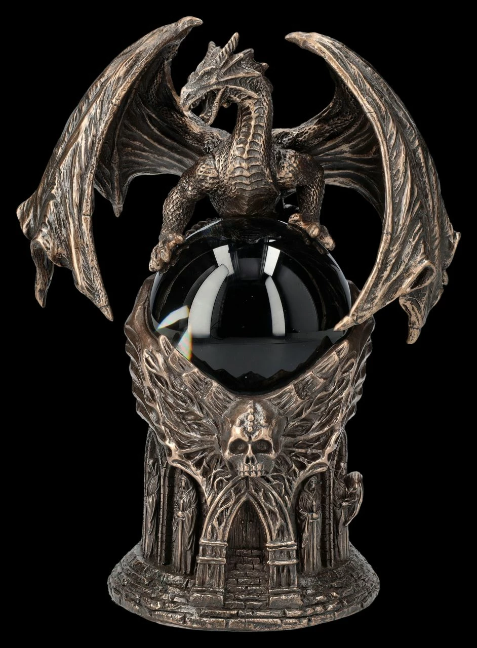 Tief in den dunklen Wäldern befindet sich der von Drachen bewachte alte Turm mit der mystischen Kristallkugel. Rund um den Turm stehen in den Torbögen aufgereiht einige Reaper mit Schwert in der Hand. Sie sehen aus, als hätten sie einst zu den Kreuzrittern gehört. Treppenstufen führen zu dem großen Holztor zur Anderswelt. Inmitten alter, bereits verholzter Flügel wacht ein Schädel über dem Tor. Denn nur die Weisen, die in der Kristallkugel lesen können, dürfen das Tor zur Anderswelt betreten. Aus hochwertigem Kunststein (Polyresin) ist diese edel bronzierte und colorierte Drachen-Figur mit der mystischen Kristallkugel aus Glas. Die sagenhafte Drachen-Figur aus der Studio Collection von Veronese ist 18,5 cm hoch, 15 cm breit und 10,5 cm tief. Sie ist eine wunderbare Skulptur für alle Rituale und ein fantastisches Geschenk für Drachen-Sammler. Aber auch für jeden, der den besonderen Blick hat, in der Kristallkugel zu lesen.