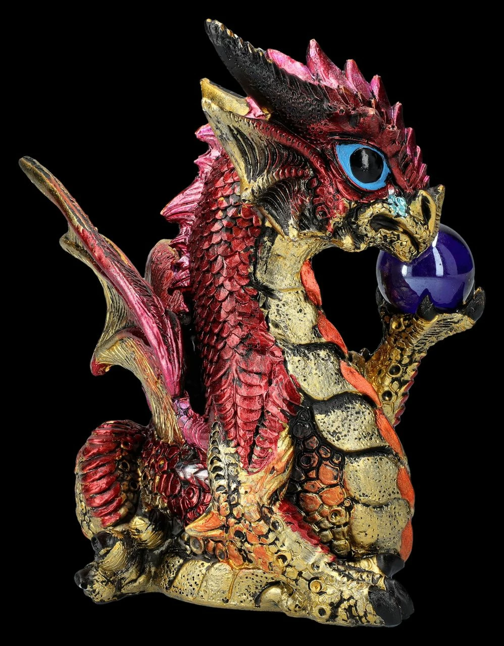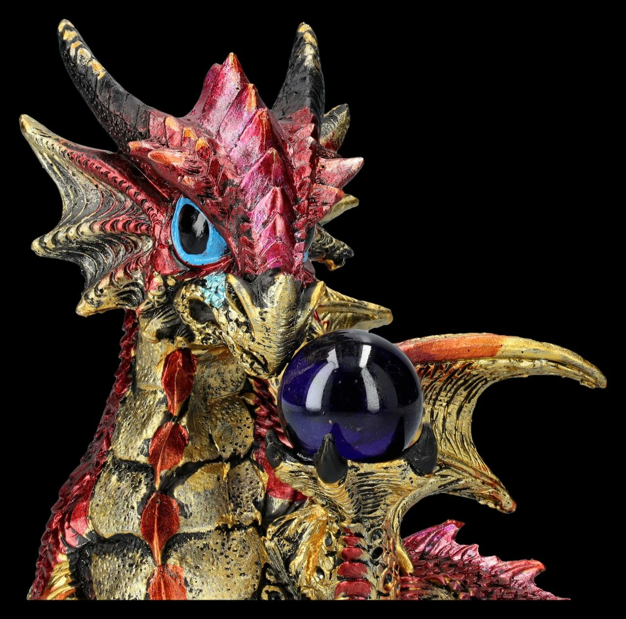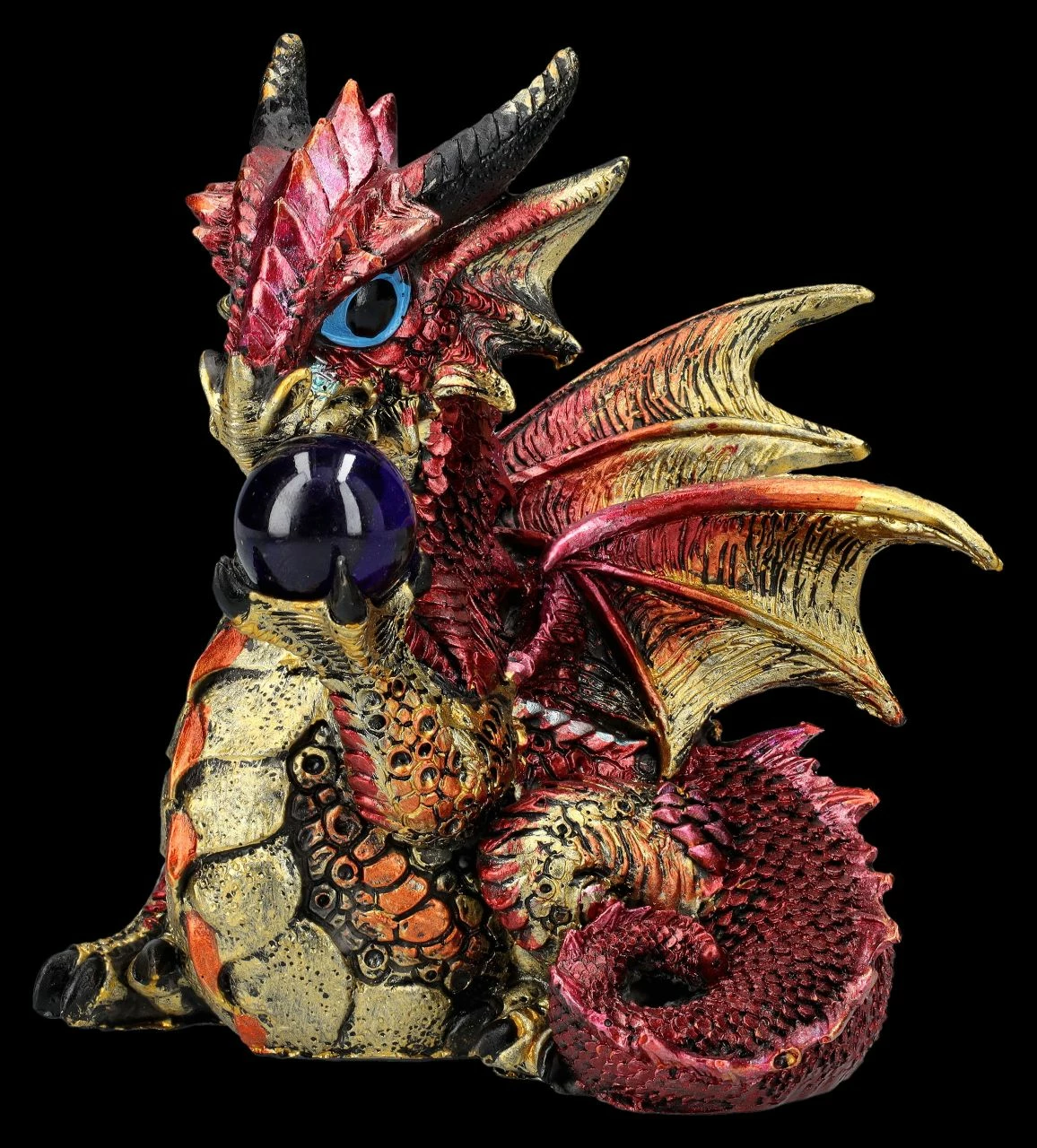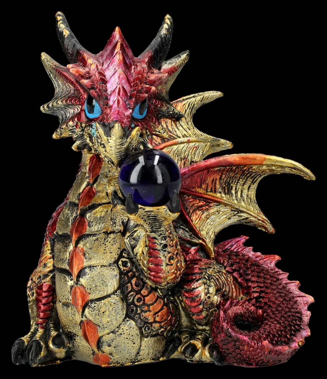 Einfach wunderbar magisch ist diese rote Drachenfigur ‚Orb Hoard‘ mit den farbigen Akzenten. Ob er in der Kugel aus Glas, die er in seiner Pranke hält, die Zukunft sieht? Sein aufmerksamer Blick lässt es beinahe vermuten. Die fantasievolle Drachenfigur ist detailreich aus sorgsam handbemaltem Kunststein (Polyresin) gefertigt und 15 cm hoch, 13 cm breit und 10,5 cm tief. Wer von der Kraft der Drachen überzeugt ist, wird sich über diese geheimnisvoll bezaubernde Drachen-Figur als Geschenk sicherlich sehr freuen.
