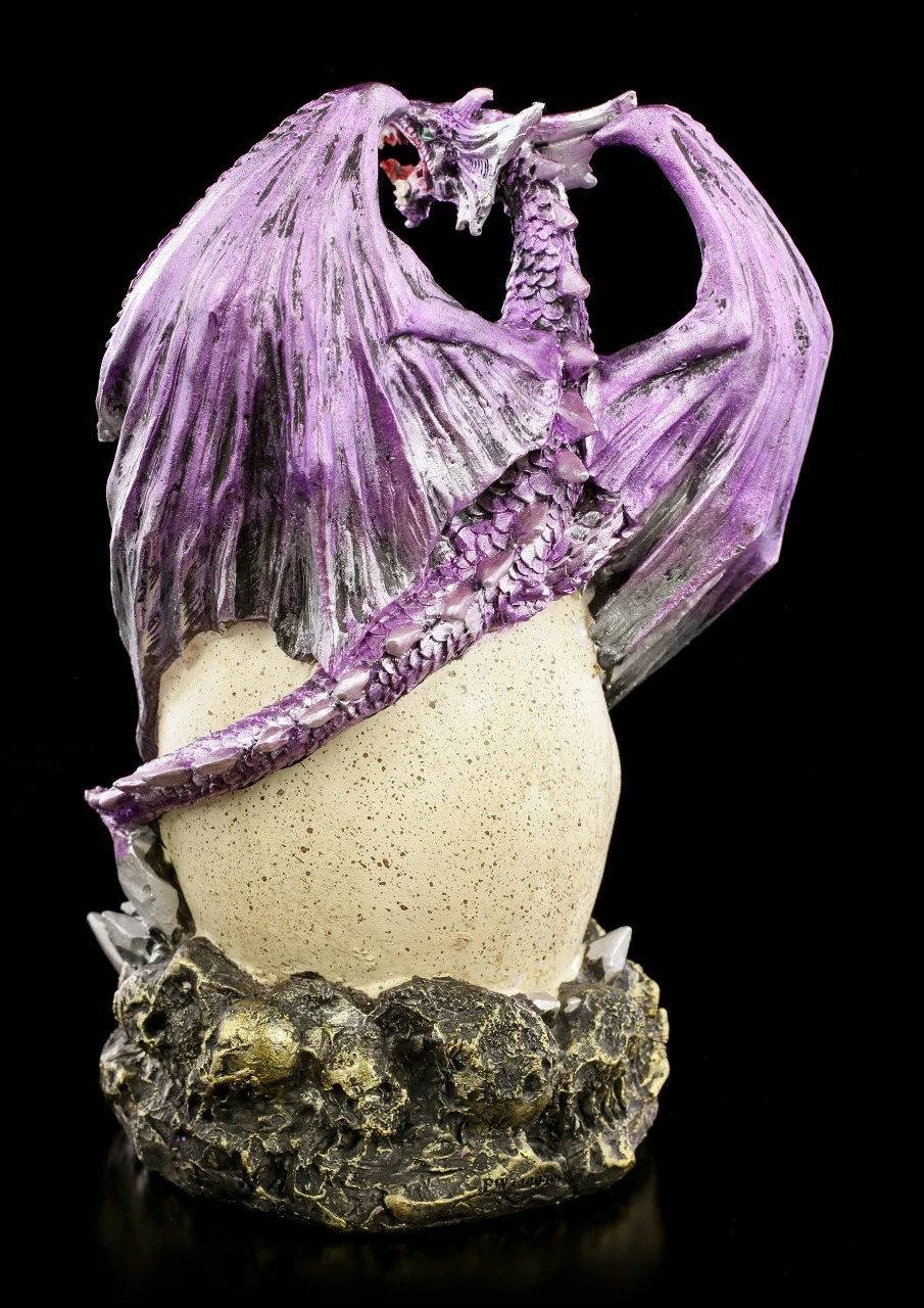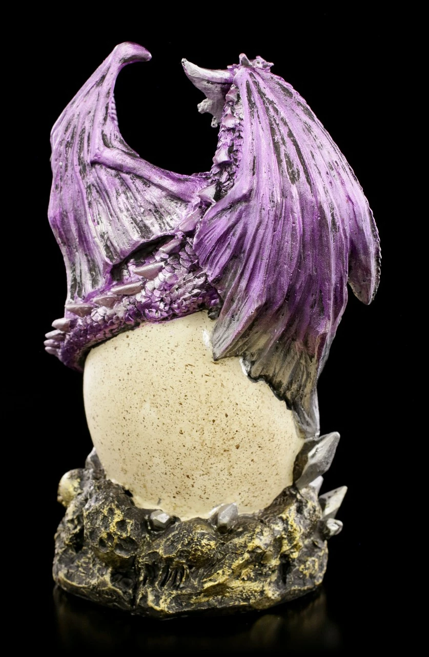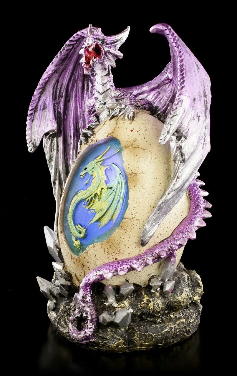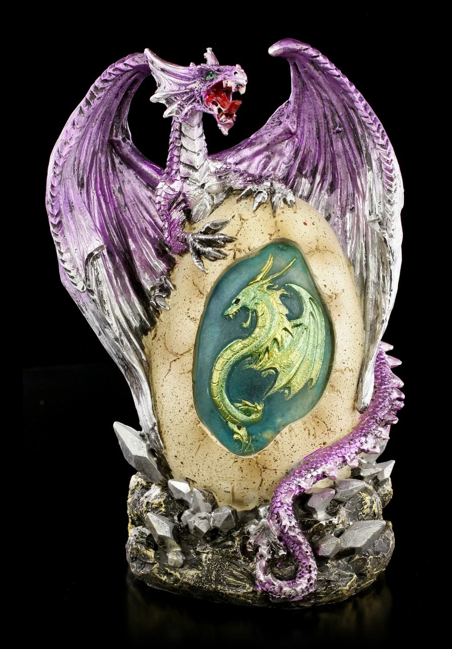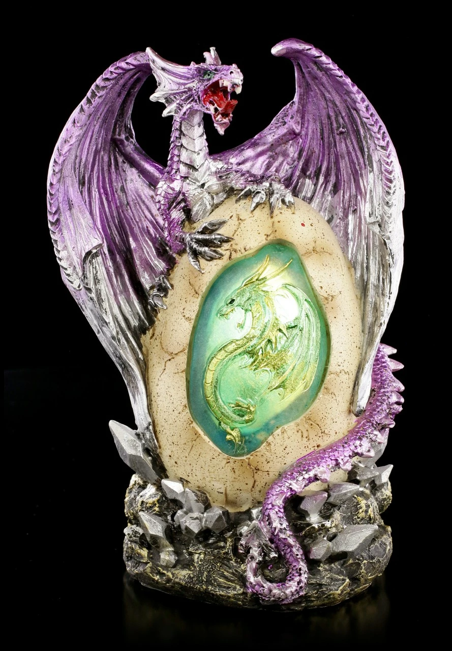 Diese Drachenfigur wird garantiert Ihre Wohnung verschönern. Der Drache Zemas klettert fauchend auf das große Drachen Ei. Durch die LED-Beleuchtung mit weichem Farbfilter wird die Silhouette des grünen Drachenbabys wunderschön hervorgehoben.