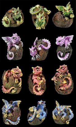 Noch schauen die jeweils drei blauen, drei roten, drei lilafarbenen und die drei grünen Drachenkinder recht frech aus den gerade aufgebrochenen Eiern. Sie wurden von ihren Müttern gut getarnt in den geheimnisvollen tiefen Wäldern der Drachen gelegt. Wenn die Drachenjungen groß genug sind, sollen die geschicktesten unter ihnen die neuen Hüter der Wälder werden. Die gerade aus den Eiern schlüpfenden Drachenjungen kommen im 12er Set und sind 4 – 5,5 cm hoch, 3 – 4,5 cm breit und 3 – 4 cm tief. Die 12 unterschiedlichen und detailreich aus handbemaltem Kunststein (Polyresin) gefertigten Drachenfiguren im Set sind ein lustiges und bezauberndes Geschenk für Drachen-Sammler und können auch mit Freunden geteilt werden.