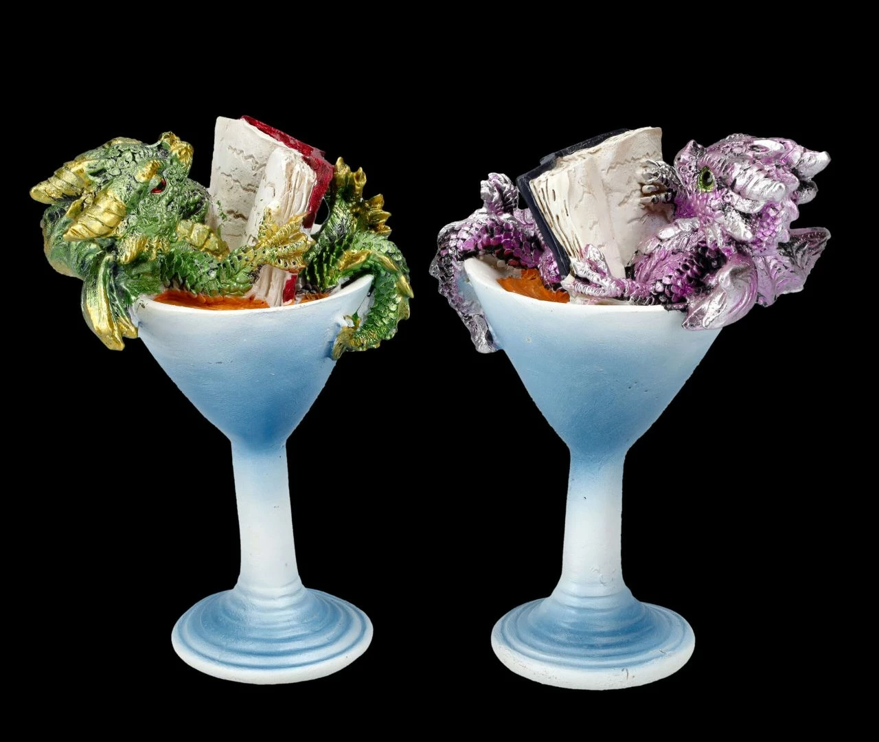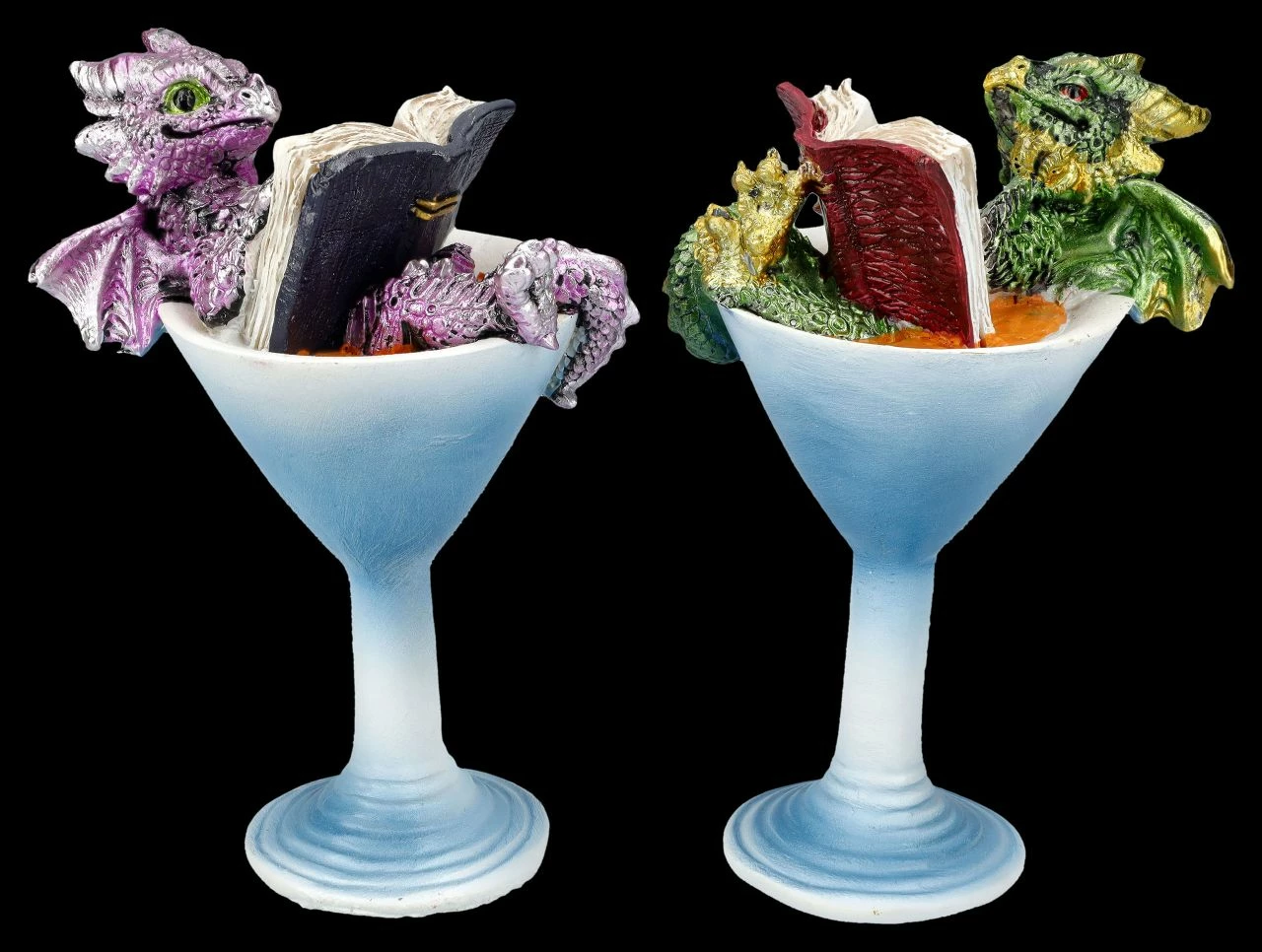 Die beiden witzigen Drachen scheinen zu wissen, wie man chillt. Sie sitzen in den Cocktailgläsern und schmökern in ihren Büchern. Der einzige Fehler dabei: Statt den Cocktail zu schlürfen, nehmen sie ein Bad darin. Nun – auch eine Möglichkeit, sich zu entspannen. Die lustigen Drachen beim Chillen im Cocktailglas sind aus handbemaltem Kunststein (Polyresin) und kommen im 2er Set. Damit können die je 11 cm hohen, je 7,5 cm breiten und je 5,5 cm tiefen Drachen-Figuren gleich mit Freunden geteilt werden und sind damit nicht nur eine tolle Deko für die Bar, sondern auch ein humorvolles Geschenk.