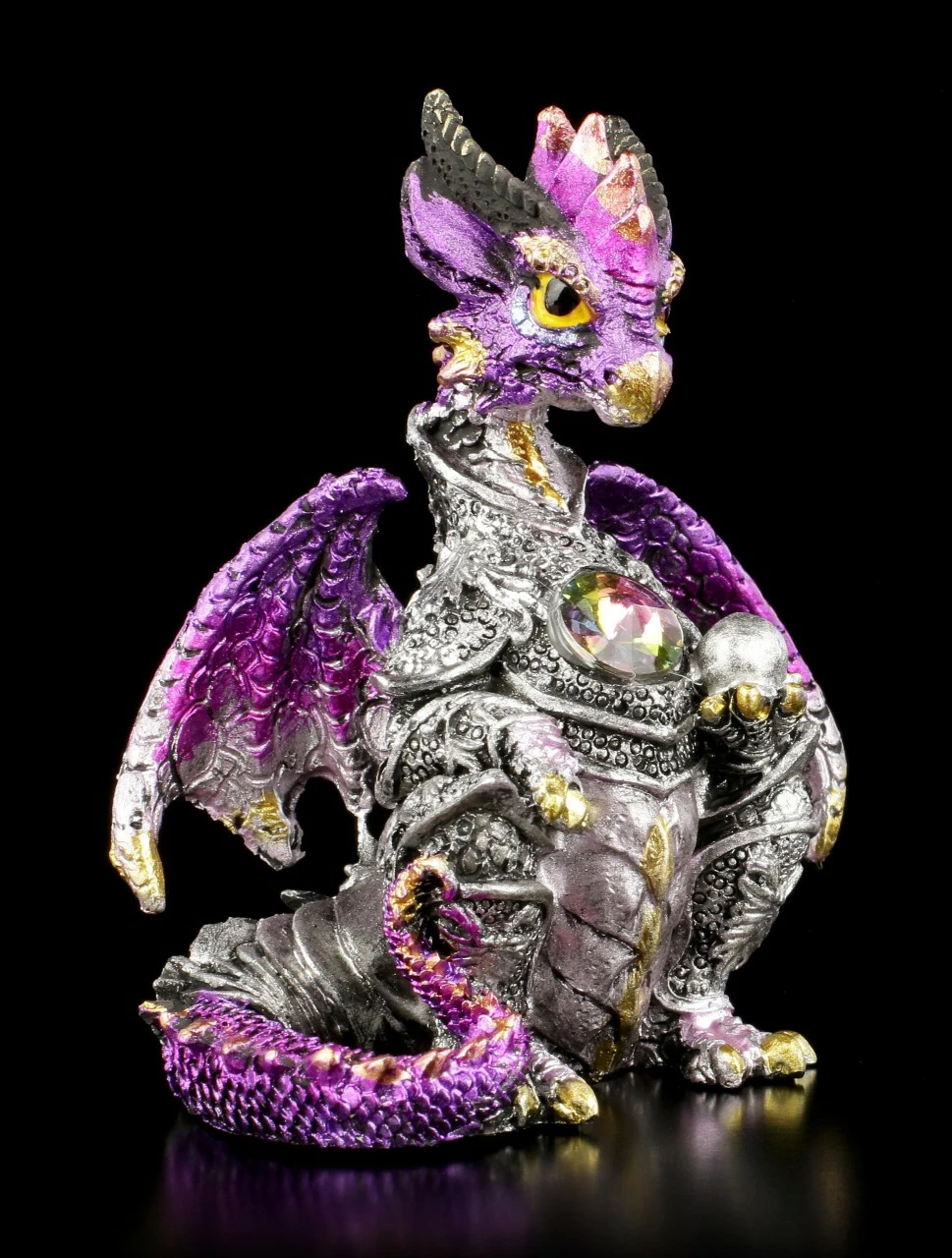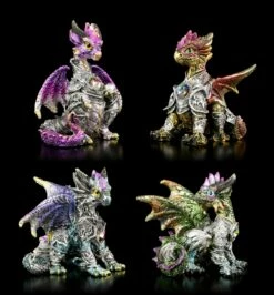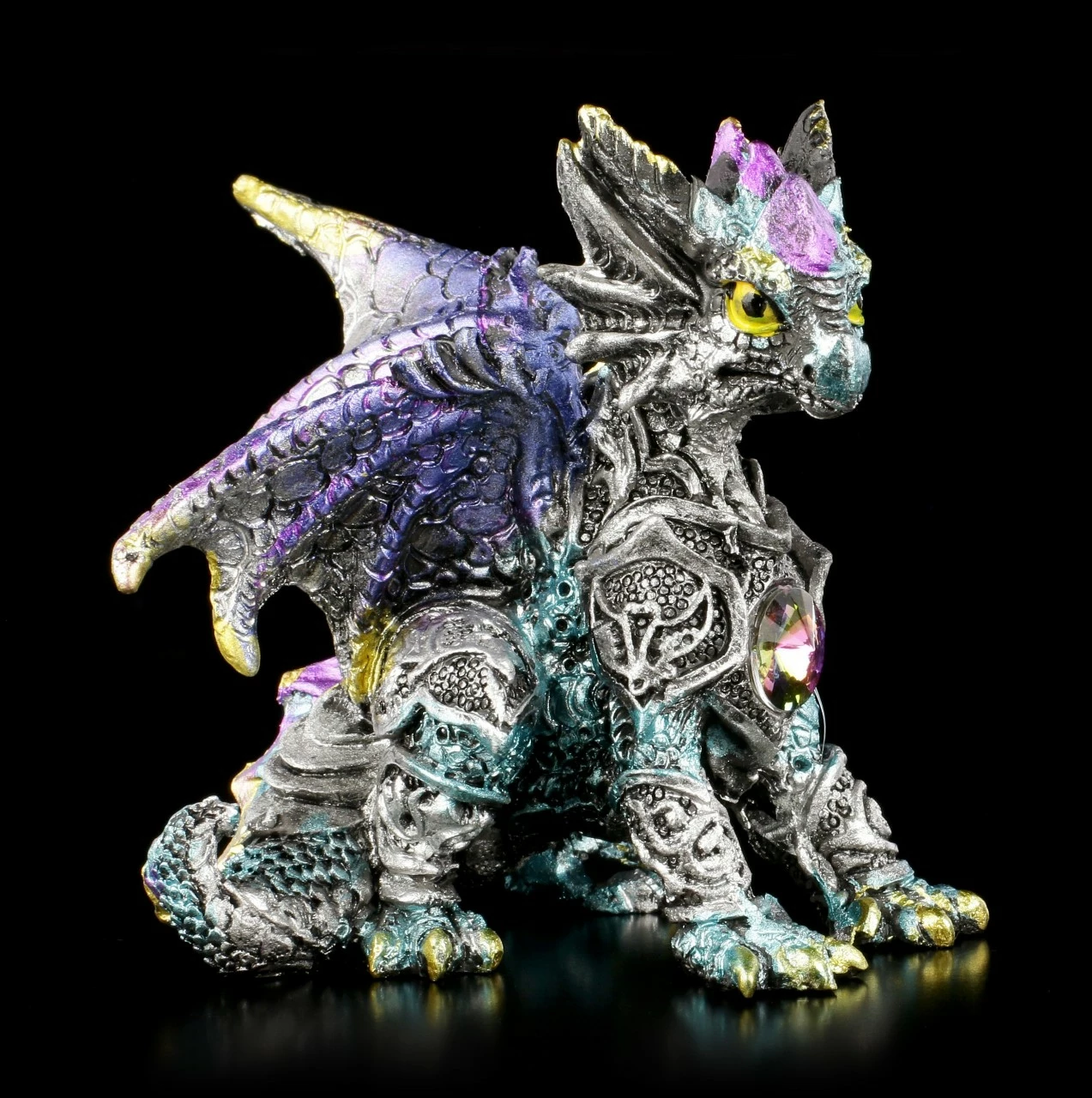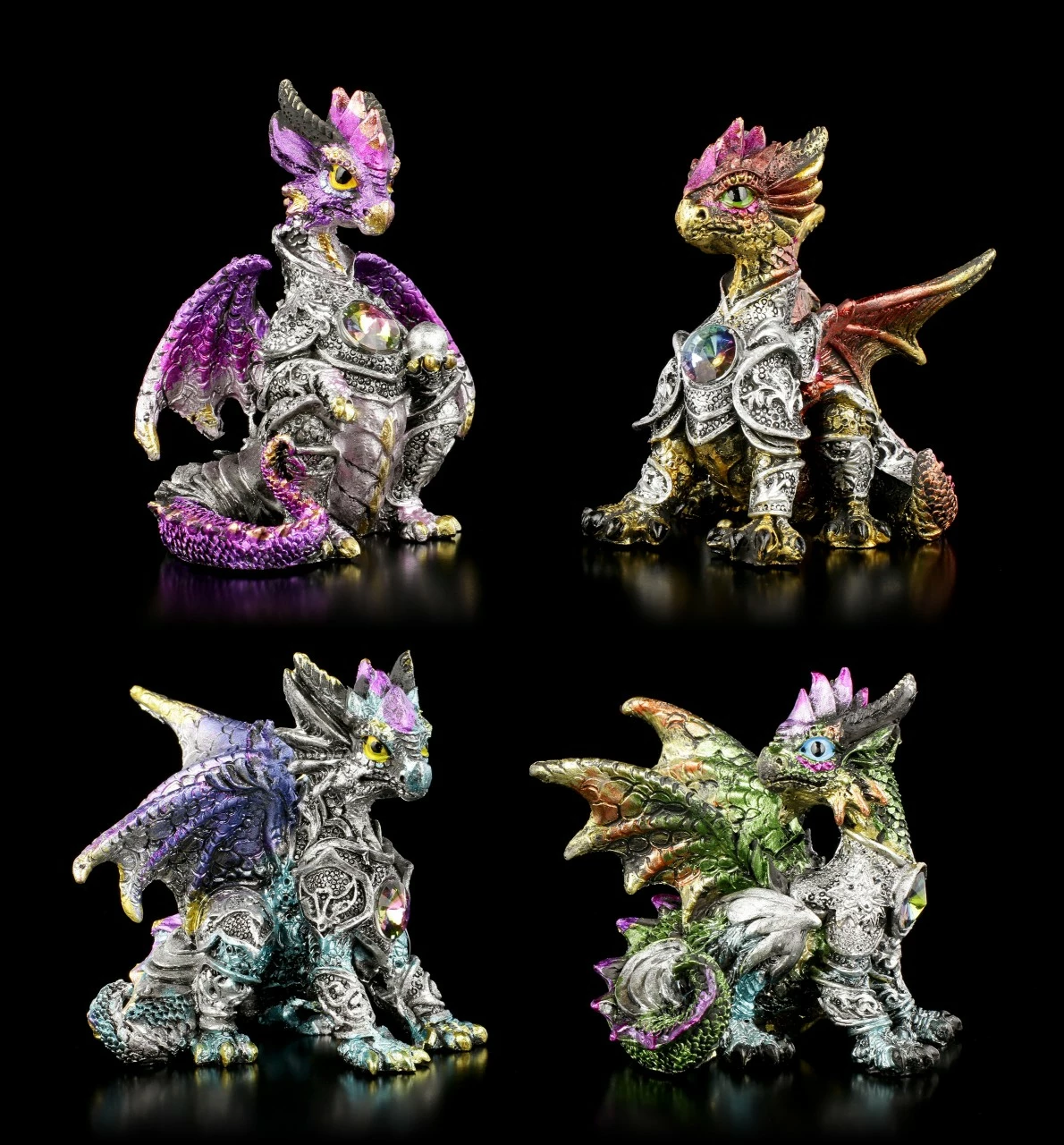 Aus dem Hort der Drachen Mutter haben die vier Jungtiere ein paar Rüstungen geklaut. Das bunte Quartett liebt die funkelnden Steine und das helle Metall der Rüstungen. Das handbemalte Set aus Kunststein (Polyresin) sollte in keiner Drachen Sammlung fehlen.