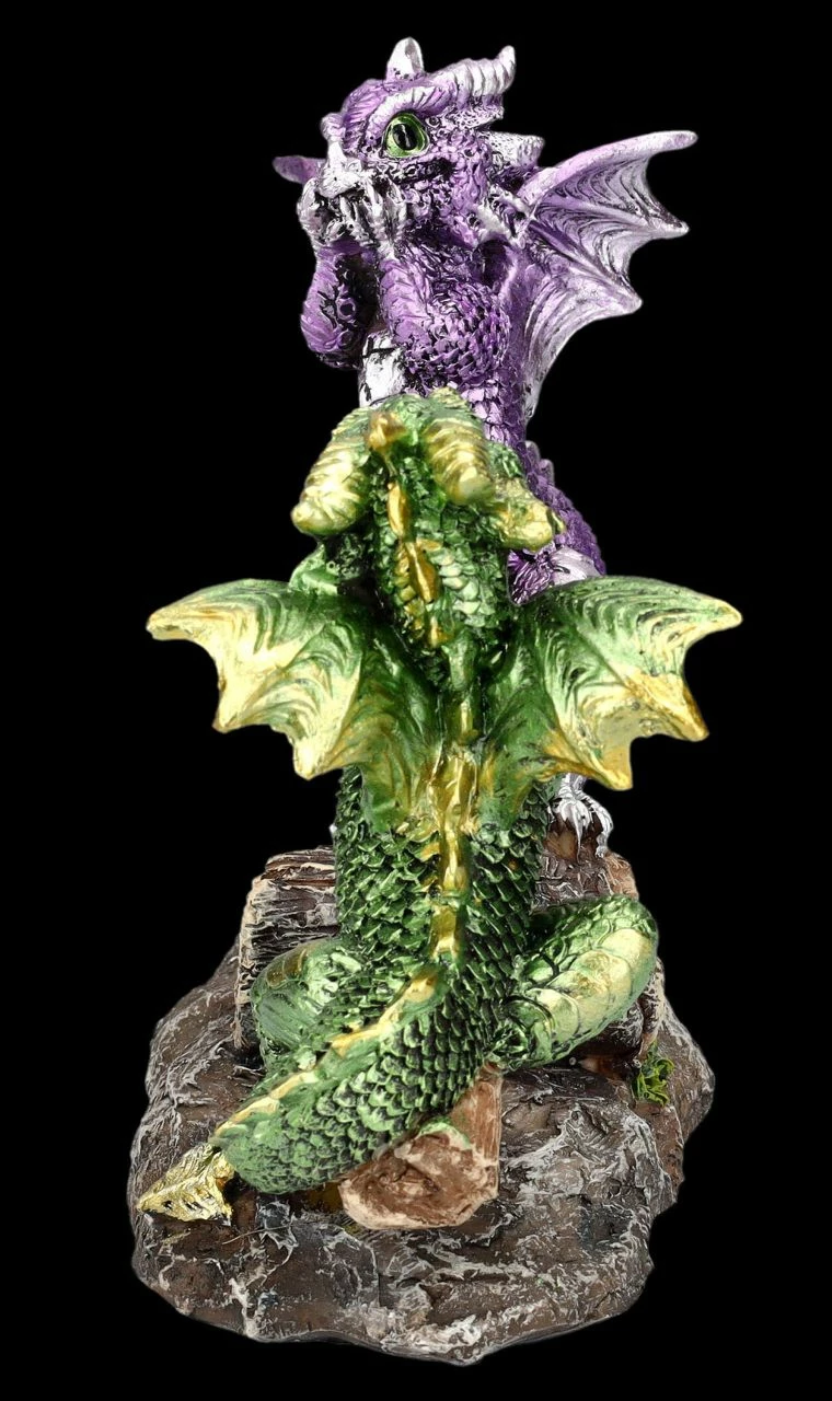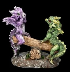 Sind die beiden spielenden jungen Drachen auf der Wippe nicht allzu niedlich? Während der grüne kleine Drache mutig schaukelt, scheint sich der lilafarbene Drache doch etwas zu fürchten, denn warum hält er sonst seine Hände vor das Gesicht… Die beiden spielenden Drachen sind doch ein putziges Geschenk für alle Drachen-Freunde. Die detailreiche Drachen-Figuren auf der Wippe wurden aus liebevoll handbemaltem Kunststein (Polyresin) gefertigt. Mit der Höhe von 14 cm, der Breite von 15 cm und der Tiefe von 8 cm sind die Drachenkinder auf der Wippe eine richtig niedliche Deko.