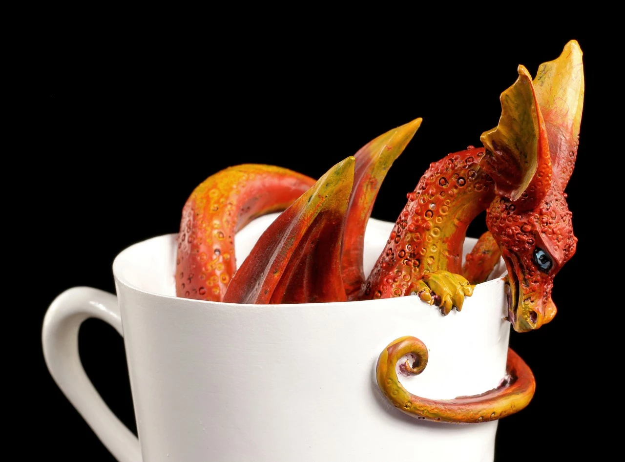 Die zwei Drachenkinder haben gerade lange mit der Kaffetasse gespielt. Jetzt ruhen sie sich aus. Der rote Drache schwimmt tatsächlich in dem Kaffee, während der andere sich am Fuß der Tasse ausruht. Die Drachen stammen von der Künstlerin Amy Brown und begeistern durch die außergewöhnliche Machart.