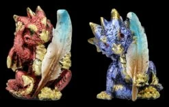 Warten die beiden kleinen Drachen auf das Diktat in der Schule, oder überlegen sie nur, was sie sich mit den Federn in ihren Händen schreiben könnten? Jedenfalls blicken der kleine rote und der kleine blaue Drache sehr konzentriert drein. Die beiden putzigen Drachen mit den Schreibfedern sind je 6 cm hoch, je 4 cm breit und je 4 cm tief. Das 2er Set aus liebevoll handbemaltem Kunststein (Polyresin) kann perfekt mit Freunden geteilt werden und ist nicht nur eine niedliche Deko, sondern auch für alle Drachen-Freunde ein perfektes Geschenk.
