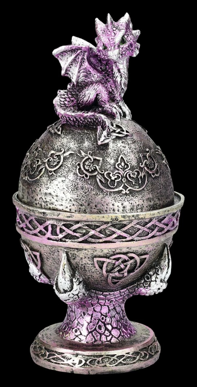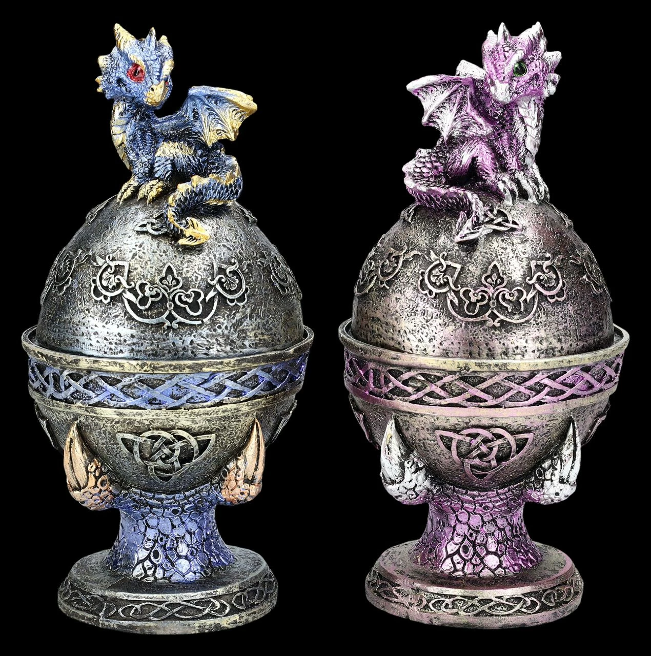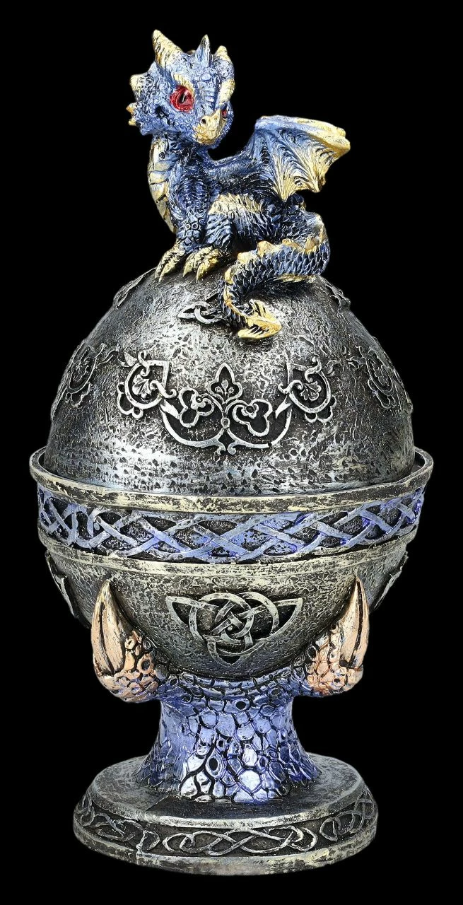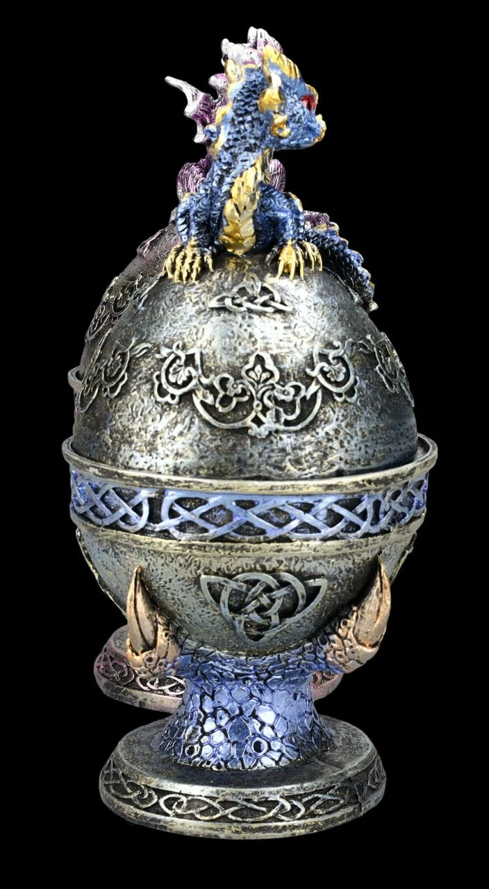 Wie hübsch – Drachenkrallen halten bei diesem 2er Set ein blaues und ein lilafsarbenes Ei, das mit keltischen Symbolen verziert ist. Auf den Eiern sitzt jeweils ein fablich dazu passendes niedliches Drachenbaby. In den Eiern befindet sich – wie einst bei den Farbergé-Eiern – eine geheimnisvolle Schatulle, die man nicht auf den ersten Blick erkennt. Die wunderbar dekorativen Drachenschatullen in blau und lila wurden aus liebevoll handbemaltem Kunststein (Polyresin) gefertigt. Sie sind je 18 cm hoch, je 9 cm breit und je 9 cm tief und haben innen mit dem Durchmesser von 7 cm und der Höhe von 5 cm Platz für ein Schmuckstück oder ein anderes Kleinod. Sie sind also nicht nur sehr dekorativ, sondern auch perfekt als Verpackung für ein ganz besonderes Geschenk geeignet.