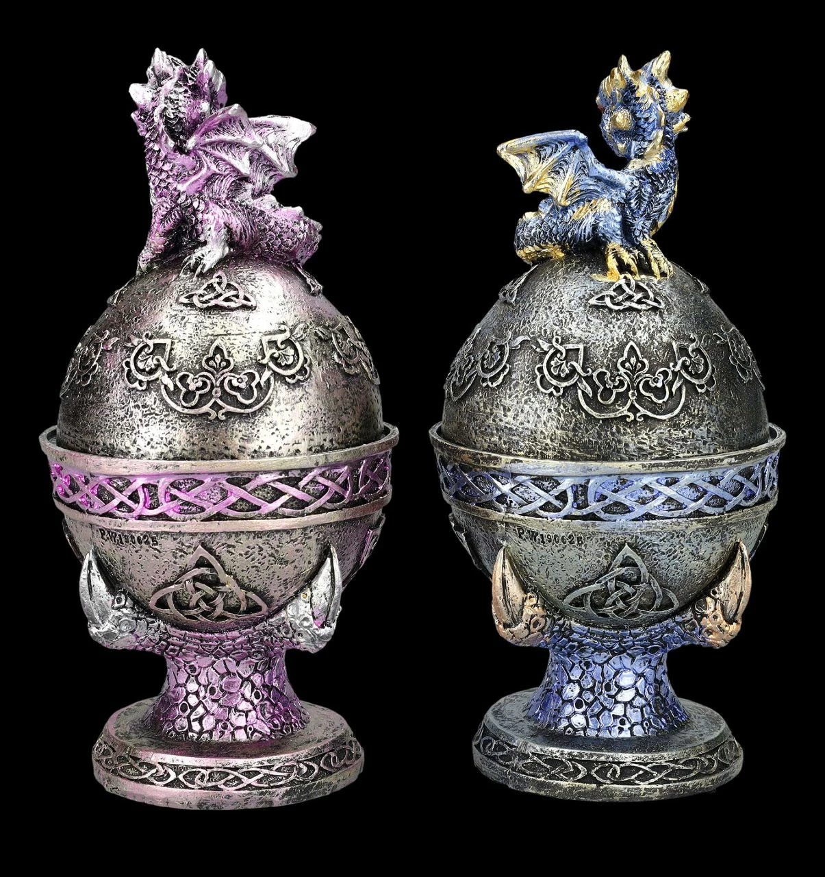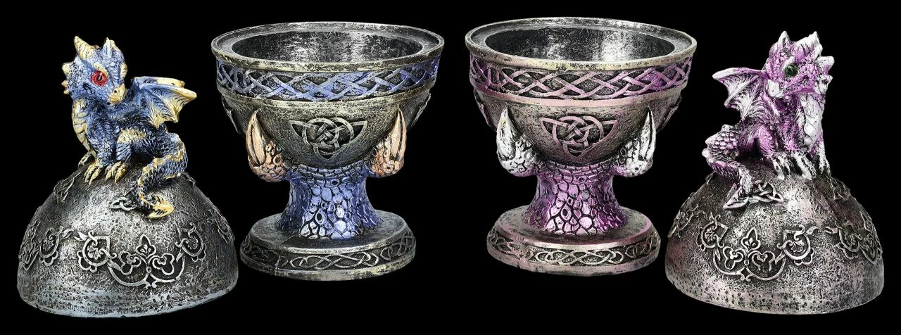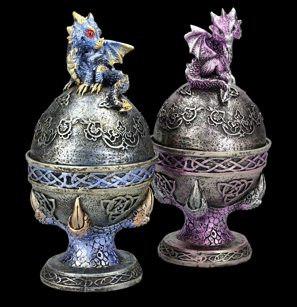 Wie hübsch – Drachenkrallen halten bei diesem 2er Set ein blaues und ein lilafsarbenes Ei, das mit keltischen Symbolen verziert ist. Auf den Eiern sitzt jeweils ein fablich dazu passendes niedliches Drachenbaby. In den Eiern befindet sich – wie einst bei den Farbergé-Eiern – eine geheimnisvolle Schatulle, die man nicht auf den ersten Blick erkennt. Die wunderbar dekorativen Drachenschatullen in blau und lila wurden aus liebevoll handbemaltem Kunststein (Polyresin) gefertigt. Sie sind je 18 cm hoch, je 9 cm breit und je 9 cm tief und haben innen mit dem Durchmesser von 7 cm und der Höhe von 5 cm Platz für ein Schmuckstück oder ein anderes Kleinod. Sie sind also nicht nur sehr dekorativ, sondern auch perfekt als Verpackung für ein ganz besonderes Geschenk geeignet.