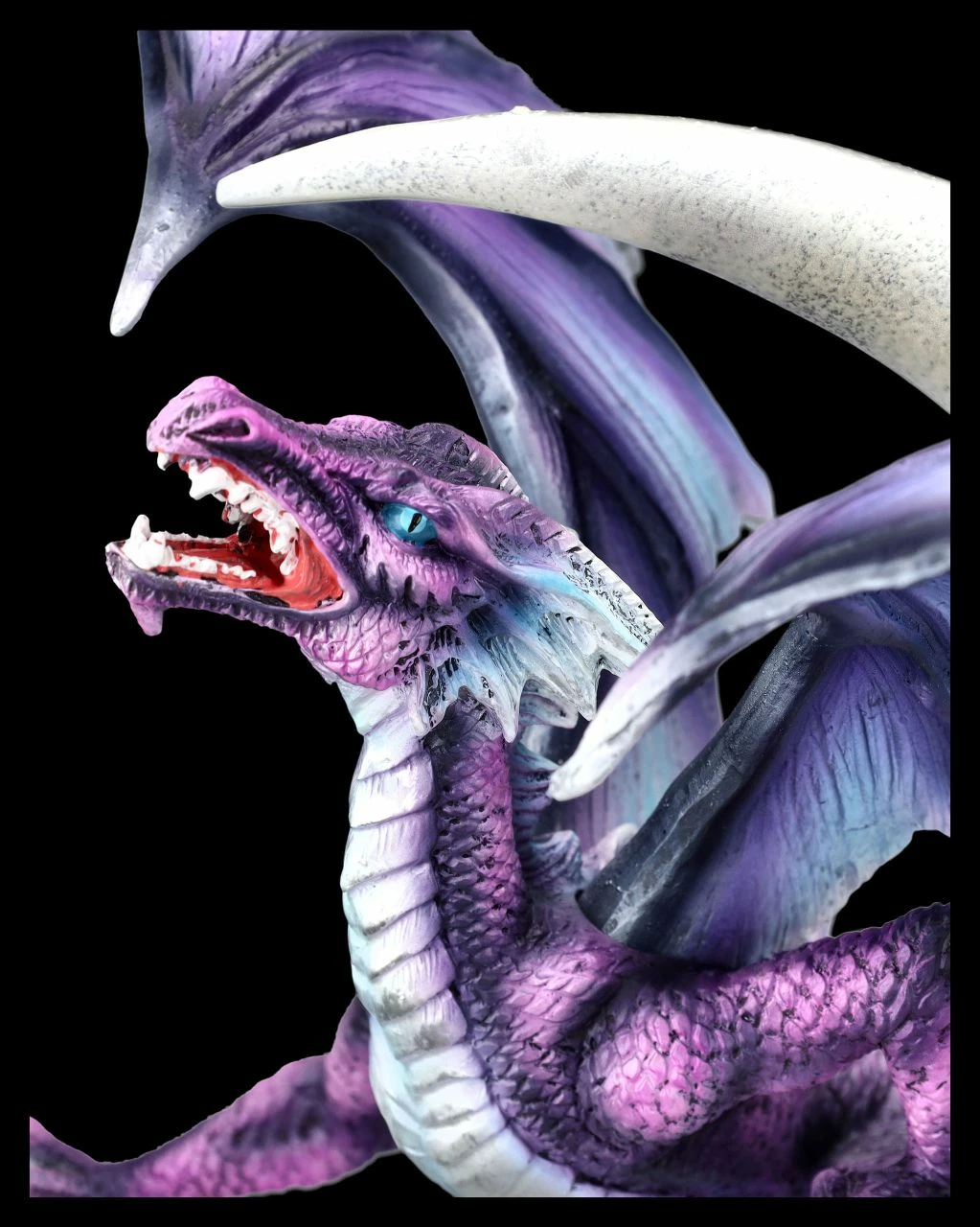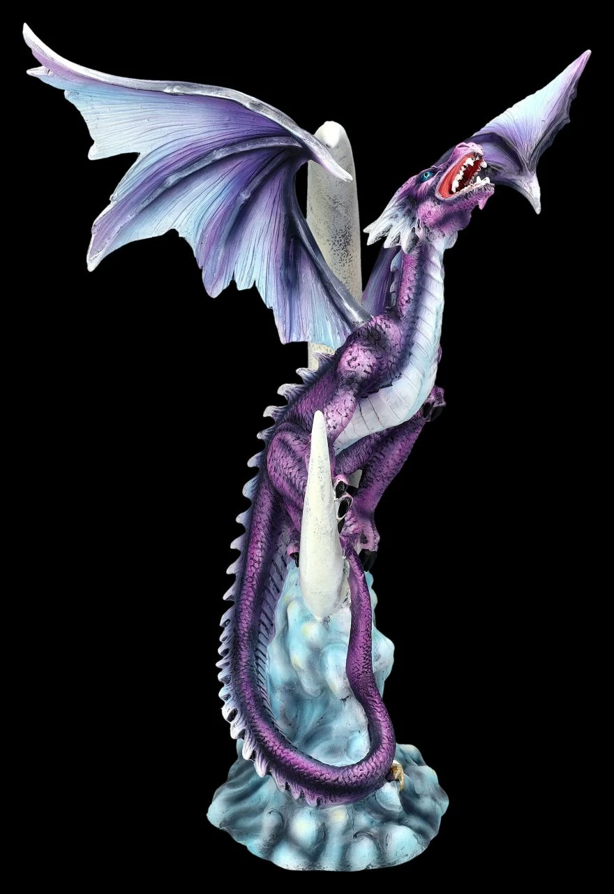 Wie sein Namensvetter, der zu den sieben olympischen Geistern gehört, fühlt sich auch der Drache Bathor als Ordnungshüter des Himmels. Über den sternenbesetzten Wolken ist der silbernen Halbmond zu sehen, auif der startbereit der imposante Drache Bathor sitzt. Wehe dem, der hier stört – Bathor wird für Ordnung sorgen. Der fantastische Drache Bathor auf dem Halbmond ist sehr detailreich aus hochwertigem Kunststein (Polyresin) gefertigt und kunstvoll von Hand bemalt. Die großen, blau-violetten prächtigen Flügel des 33 cm hohen, 17 cm breiten und 28 cm tiefen Drachen sind zum Stecken. Die fantasievolle Skulptur ist ein wunderbares Geschenk für jeden Drachen-Sammler.