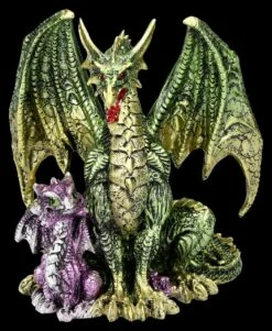 Mit ausgebreiteten Flügeln steht der große grüne Drache schützend neben dem kleinen lila Drachen. Er scheint ihm die Gefahren zu erklären, die auf ihn lauern, wenn er ungefragt den schützenden Wald verlässt. Mit seinen großen, leuchtend grünen Augen lauscht der kleine Drache seinem Guide. Die bunte, 17 cm hohe, 14,5 cm breite und 12 cm tiefe Drachenfigur aus detailreich gefertigtem Kunststein (Polyresin) wurde liebevoll von Hand bemalt. Für alle großen und kleinen Drachen-Freunde ist diese Drachenfigur ein perfektes Geschenk.