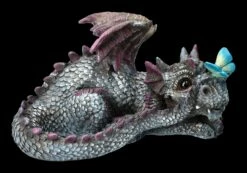Ganz schön mutig von dem blauen Schmetterling, genau auf der Nase des violetten Drachens zu landen, um da auszuruhen. Aber weiß er denn auch, wo er da gerade gelandet ist? Allerdings scheint von dem Drachen keine große Gefahr auszugehen, denn er wirkt eher etwas verunsichert. Der lustige Drache mit dem blauen Schmetterling wurde aus liebevoll handbemaltem Kunststein (Polyresin) gefertigt. Mit der Höhe von 9,5 cm, der Breite von 19 cm und der Tiefe von 14 cm ist die hübsche Drachenfigur Butterfly Rest eine tolle Deko zum Beispiel zwischen Ihren Pflanzen auf der Blumenbank oder auf der Fensterbank. Er ist aber auch ein fantasievolles Geschenk für alle, die die Welt der Drachen lieben.