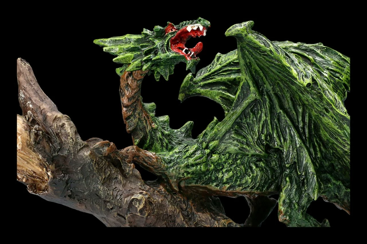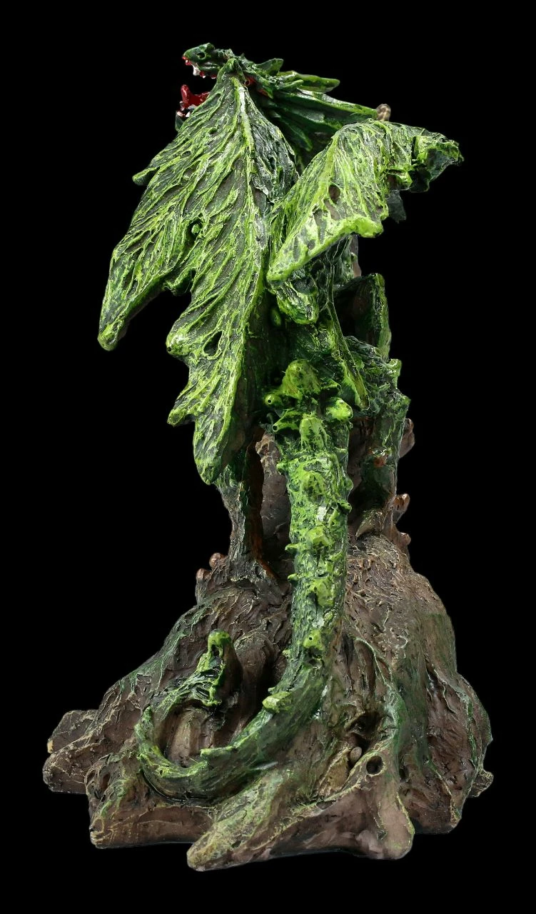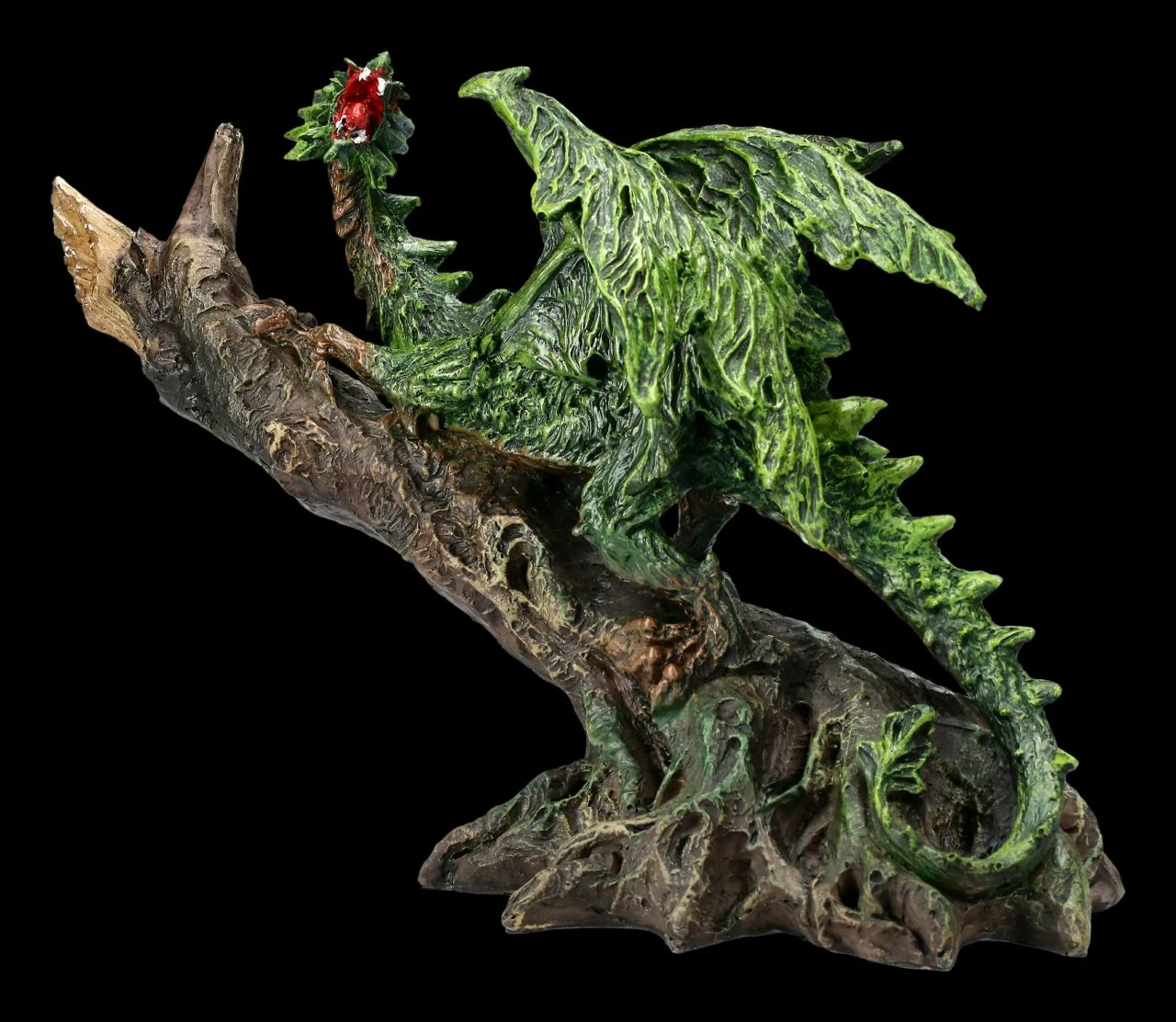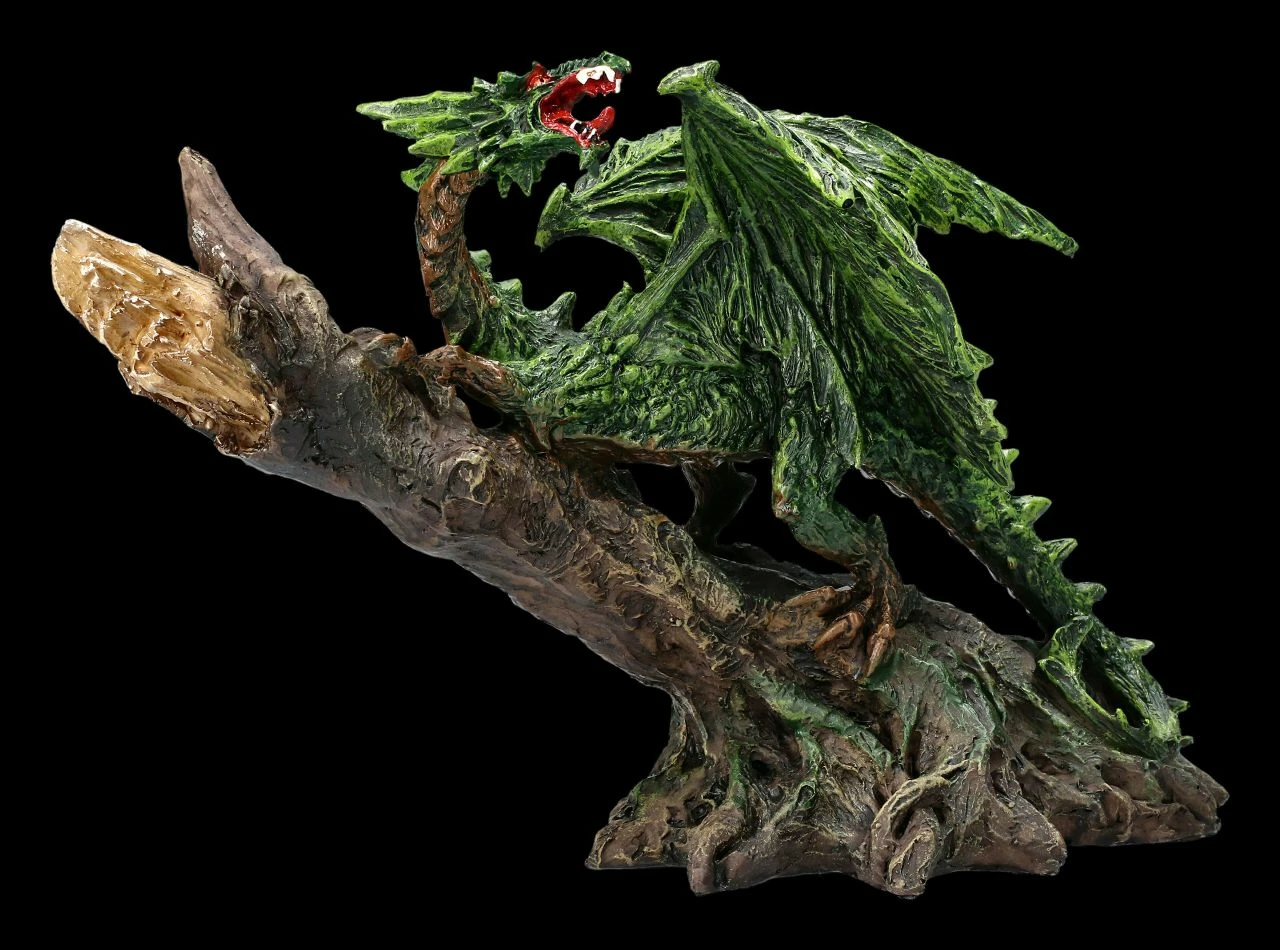 Jeder Drachenfreund, der die Freiheit des Waldes bei seinen Spaziergängen liebt, wird von diesem grünen Drachen, der sich auf einem abgebrochenen Baumstamm niedergelassen hat, begeistert sein. Der Drache scheint verzweifelt über die Zerstörung des Baumes zu sein und auch der Stamm selbst wirkt, als würde er sich laut beklagen. Die ungewöhnliche Drachenfigur Forest Freedom ist sehr detailreich aus Kunststein (Polyresin) gefertigt und sorgfältig handbemalt. Sie ist 17,5 cm hoch, 27 cm breit und 11 cm tief. Forest Freedom ist eine faszinierende Deko und ein fantastisches Geschenk für alle Natur- und Drachen-Freunde.