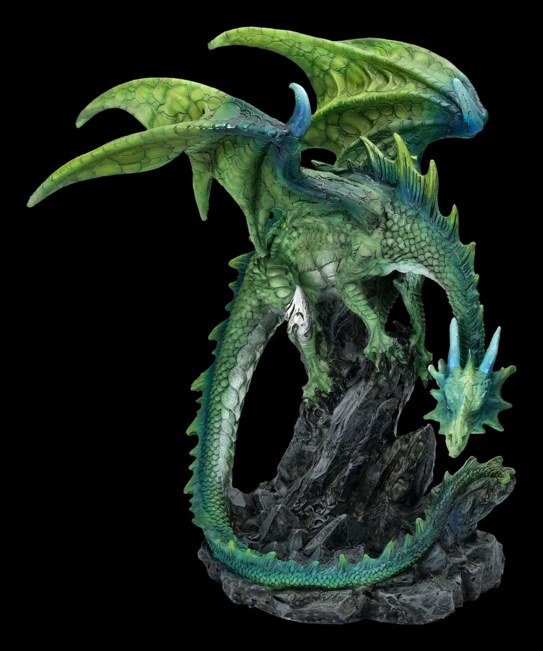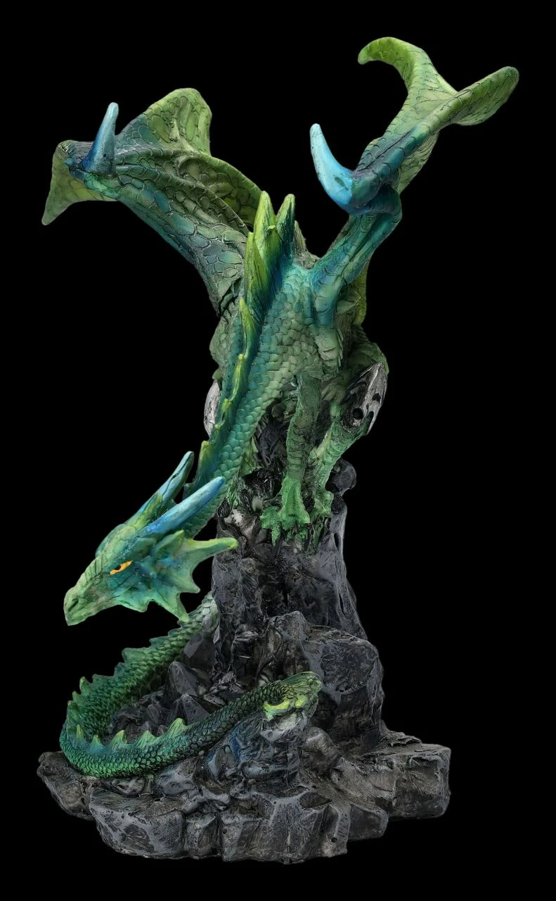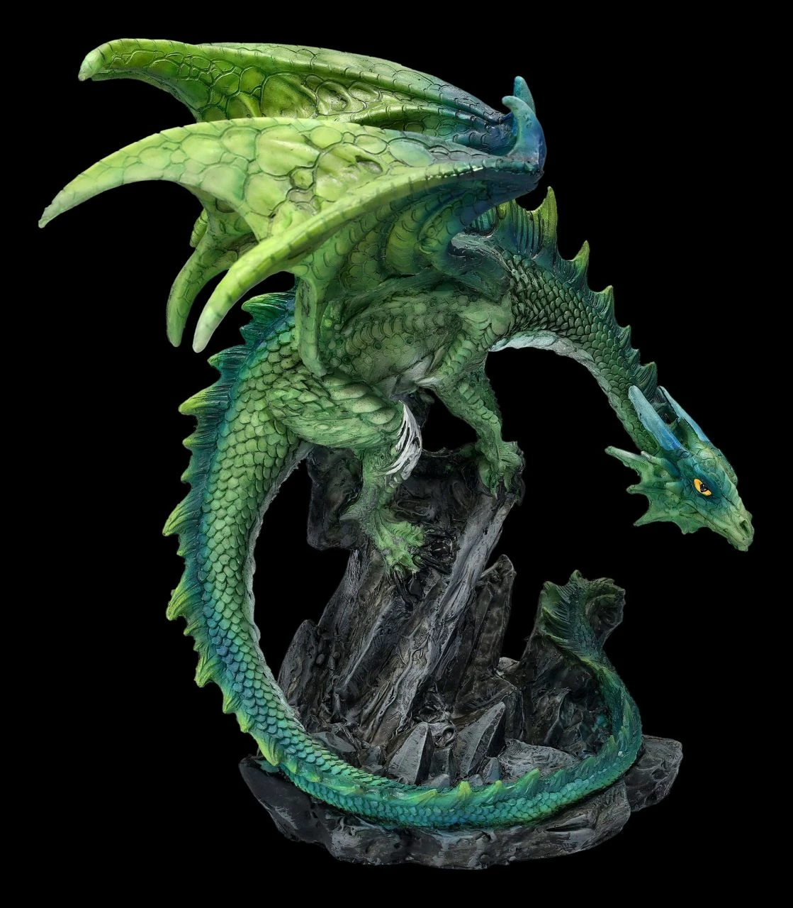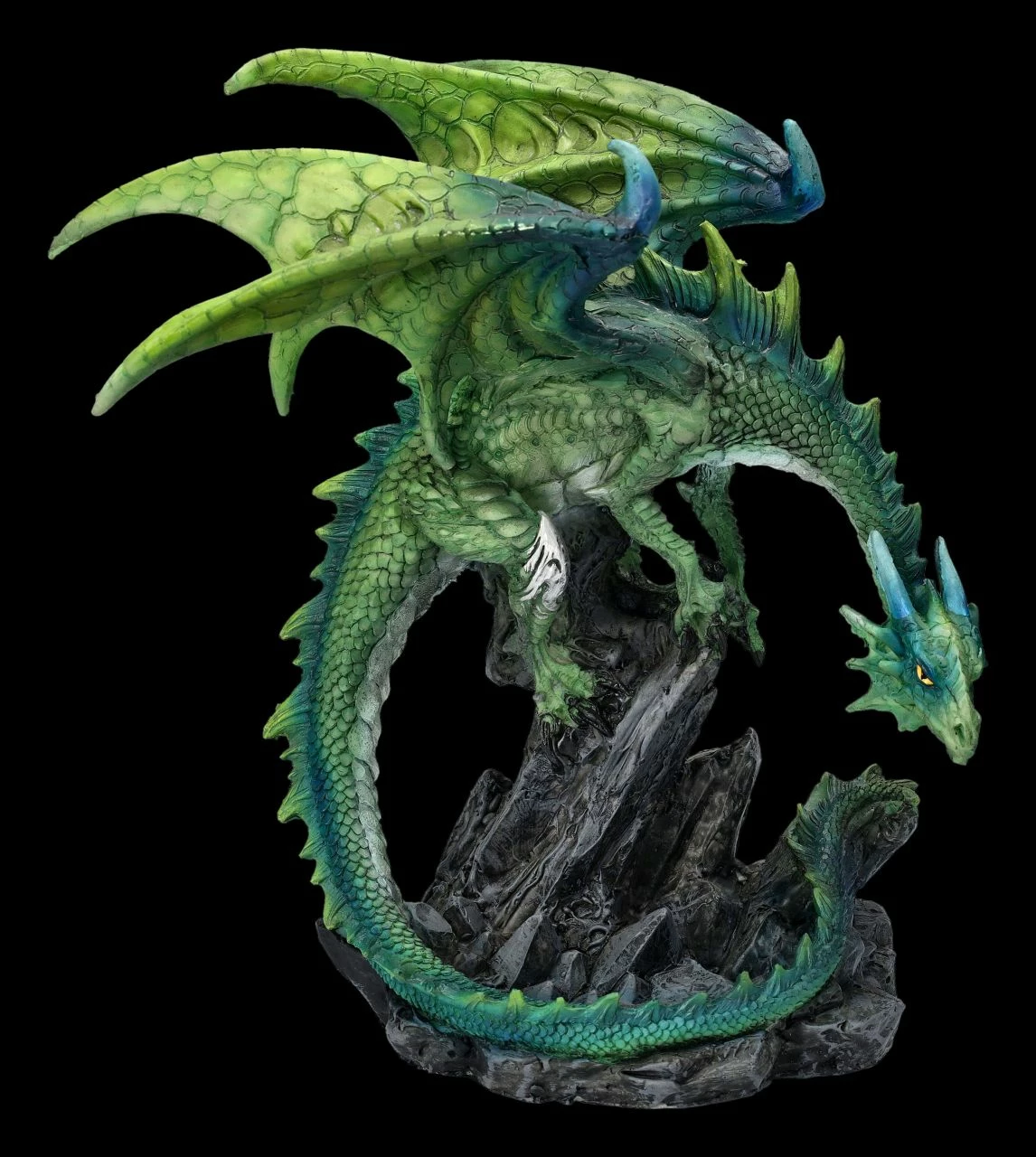 Hoch oben auf der Felskuppe der einsamen Drachen-Insel lauert ein großer Drache auf Boote, die in der unruhigen See an den Klippen zerschellen. Wenn die Wogen hoch schlagen, ist der blau-grüne Drache nicht von den Wellen zu unterscheiden und kann sich unentdeckt auf die Boote und deren Inhalt stürzen. Die detailreich aus Kunststein (Polyresin) gefertigte Drachenfigur Clifftop Dragon wurde sorgfältig von Hand bemalt. Alle, die von der magischen Welt der Drachen fasziniert sind, werden von dieser 21 cm hohen, 20 cm breiten und 13 cm tiefen fantastischen Drachenfigur begeistert sein. Der grüne Drache ist nicht nur eine tolle Deko, er ist auch ein fantasievolles Geschenk.für alle die Drachen lieben.