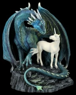 Selbst im fernen und geheimnisvollen Land der Elfen, Feen und Drachen sind Einhörner sehr selten geworden und müssen beschützt werden. Der große Drache hat freiwillig diese Aufgabe übernommen und kein Wesen wird es wagen, sich ungefragt dem kleinen und jungen Einhorn zu nähern. Die große Fantasy-Künstlerin Lisa Parker hat mit ‚Protector of Magick‘ diese märchenhafte Szene wunderbar eingefangen. Die faszinierende Figur des prächtigen Drachens, der mit seinen großen Flügeln schützend hinter dem kleinen Einhorn auf dem Felsen steht, wurde mit viel Liebe zum Detail aus hochwertigem Kunststein (Polyresin) gefertigt und genauso liebevoll von Hand bemalt. Diese wunderbare, 17 cm hohe, 14 cm breite und 13 cm tiefe Drachen-Figur mit dem Einhorn bringt einen Hauch von Magie in jeden Bereich. Sie ist – nicht nur für Sammler – auch ein bezauberndes Geschenk und kommt inklusive eines toll bedruckten Geschenkkartons.