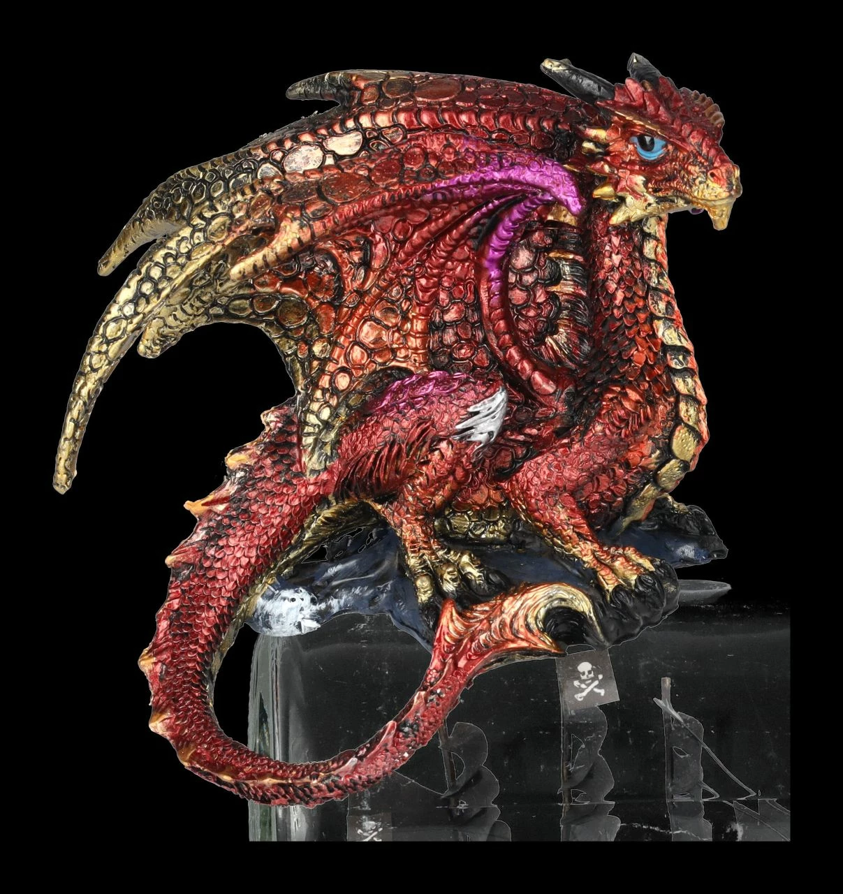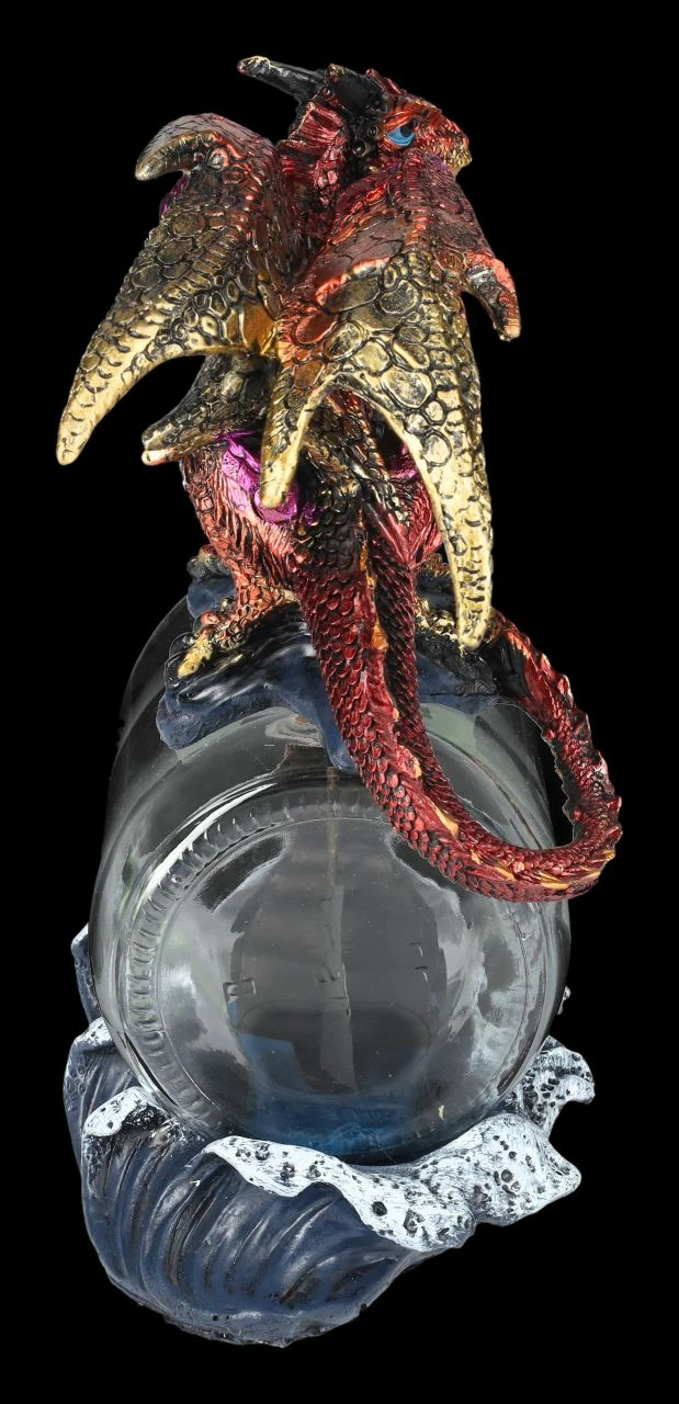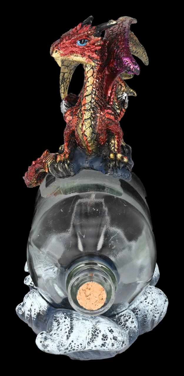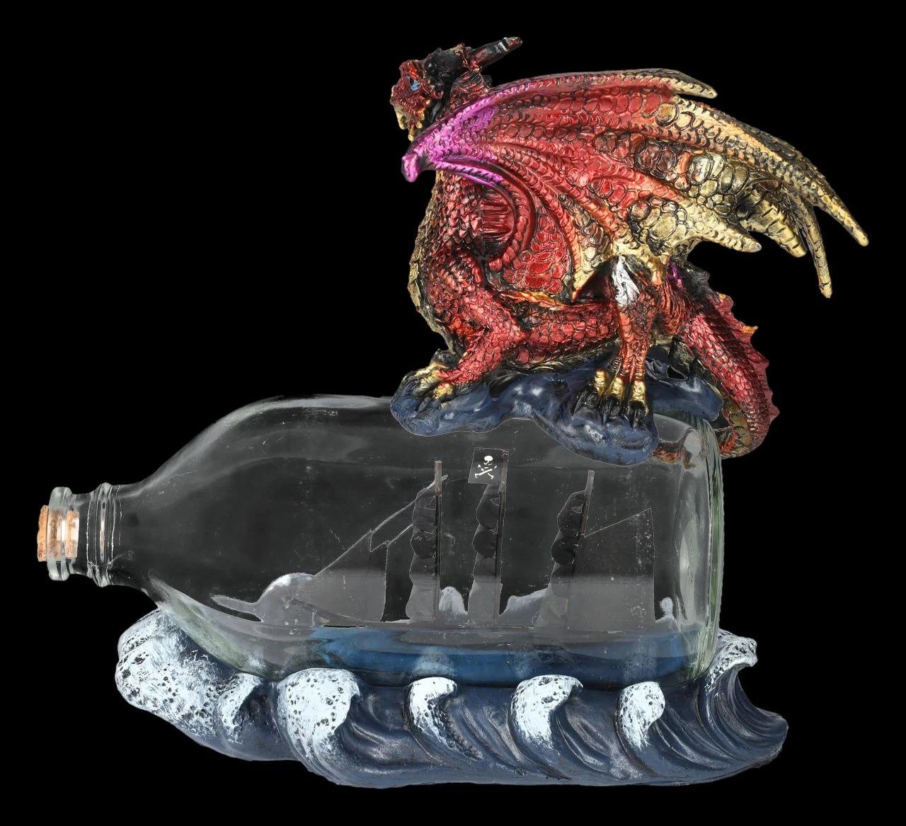 Ein Flaschenschiff auf dem Sideboard war mal ein echtes Statement vor allem in Meeresnähe gehörte es in vielen Wohnzimmern zur Einrichtung dazu. Man konnte von fernen Ländern träumen, die dieses Schiff mal erobert hatten. Bei diesem 21,5 cm hohen, 21,5 cm breiten und 10,5 cm tiefen Buddelschiff kann man auch heute noch seine Fantasie spielen lassen. Man muss sich nur vorstellen, wie man ruhig im Liegestuhl auf dem Deck eines Schiffes liegt und plötzlich entdeckt man einem roten Drachen, der hoch oben auf einem in eine Buddel eingeschlossenen Schiff auf den Wellen vorbeigleitet. Der auf der Buddelflasche aus Glas sitzende rote Drache in den Wellen wurde detailreich aus handbemaltem Kunststein (Polyresin) geschaffen. ‚The Voyage‘ ist perfektes Geschenk für alle Drachenfreunde, die sich auch gerne mal auf große Fahrt begeben möchten.