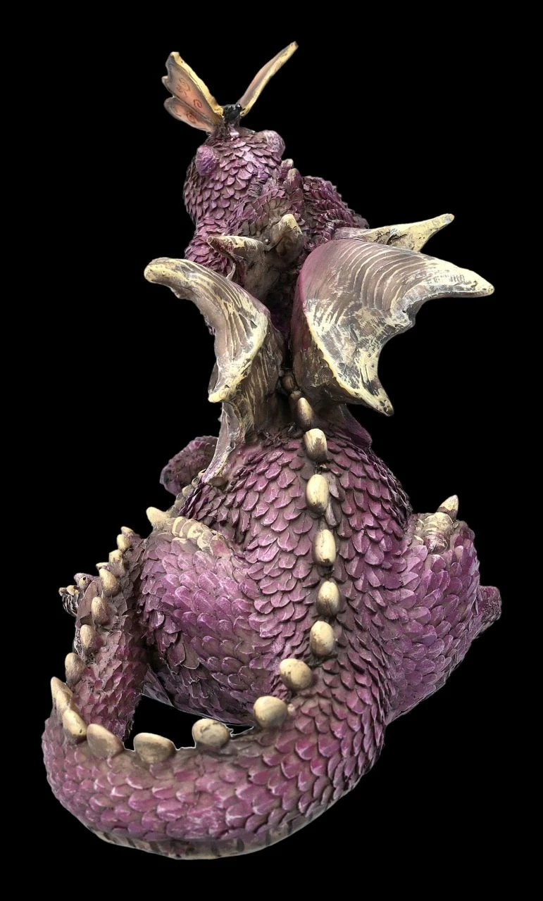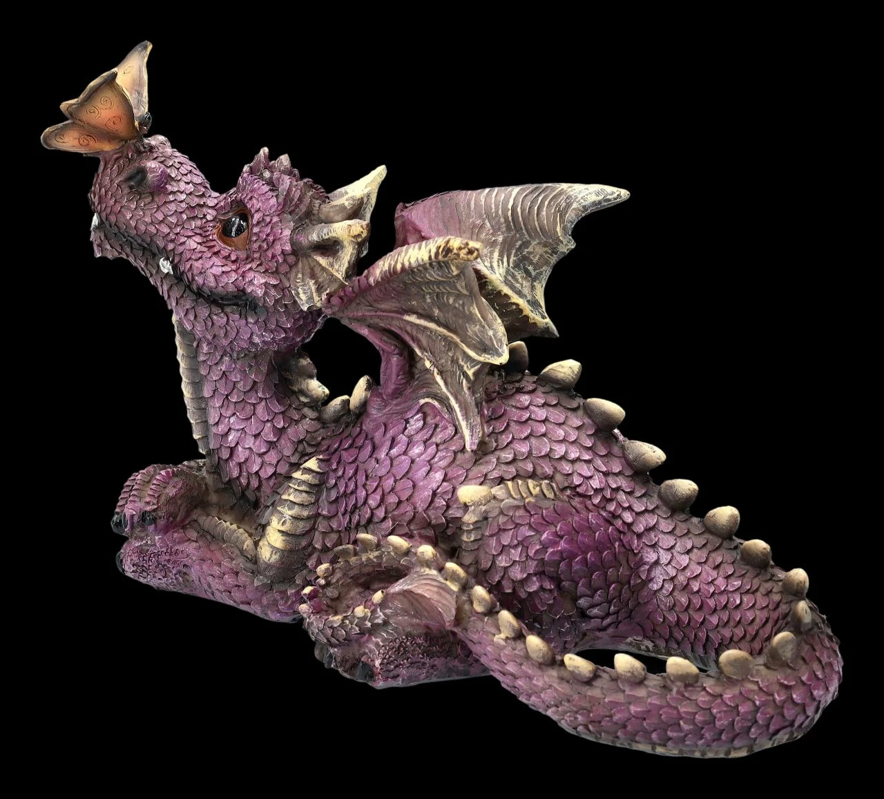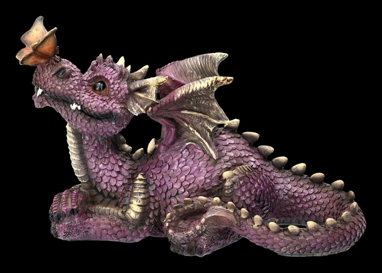 Ein mutiger bunter Schmetterling ist auf der Nase des violetten Drachens gelandet und scheint ihm einen zarten Kuss zu geben. Der gut gelaunte Drache ist von dem Nature’s Kiss des Schmetterlings scheinbar restlos begeistert. Da kann man nur hoffen, dass der Drache nicht niesen muss, denn dann würde der Schmetterling in ungeahnte Höhen entschwinden. Der lustige Drache mit dem Schmetterling wurde aus liebevoll handbemaltem Kunststein (Polyresin) geschaffen. Mit der Höhe von 14,5 cm, der Breite von 22 cm und der Tiefe von 12 cm ist der Drache eine wunderbare Deko zum Beispiel zwischen Ihren Pflanzen auf der Blumenbank oder auf der Fensterbank. Er ist aber auch ein tolles Geschenk für alle, die die Welt der Drachen lieben.