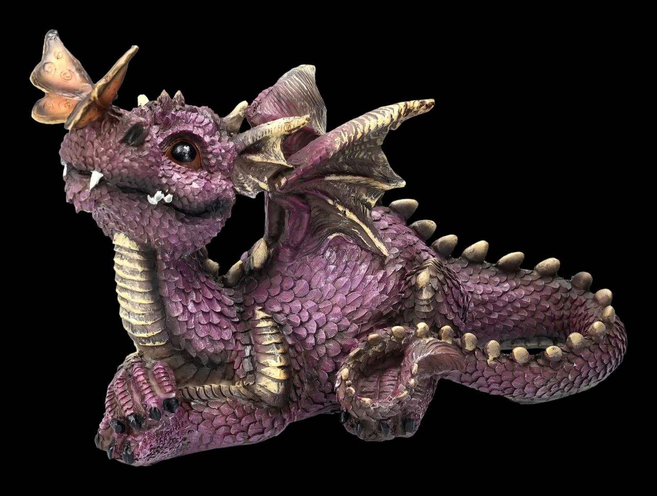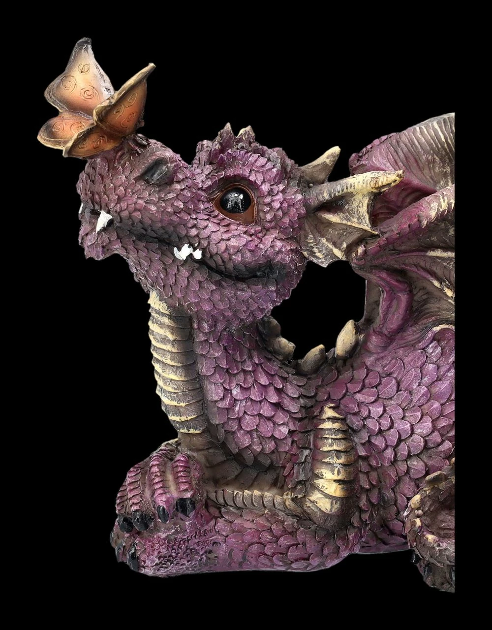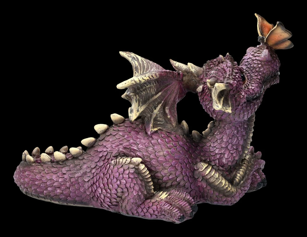 Ein mutiger bunter Schmetterling ist auf der Nase des violetten Drachens gelandet und scheint ihm einen zarten Kuss zu geben. Der gut gelaunte Drache ist von dem Nature’s Kiss des Schmetterlings scheinbar restlos begeistert. Da kann man nur hoffen, dass der Drache nicht niesen muss, denn dann würde der Schmetterling in ungeahnte Höhen entschwinden. Der lustige Drache mit dem Schmetterling wurde aus liebevoll handbemaltem Kunststein (Polyresin) geschaffen. Mit der Höhe von 14,5 cm, der Breite von 22 cm und der Tiefe von 12 cm ist der Drache eine wunderbare Deko zum Beispiel zwischen Ihren Pflanzen auf der Blumenbank oder auf der Fensterbank. Er ist aber auch ein tolles Geschenk für alle, die die Welt der Drachen lieben.