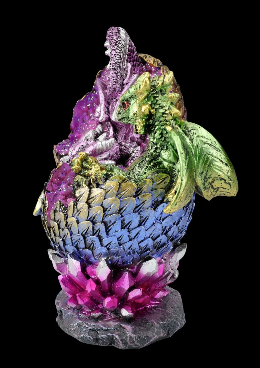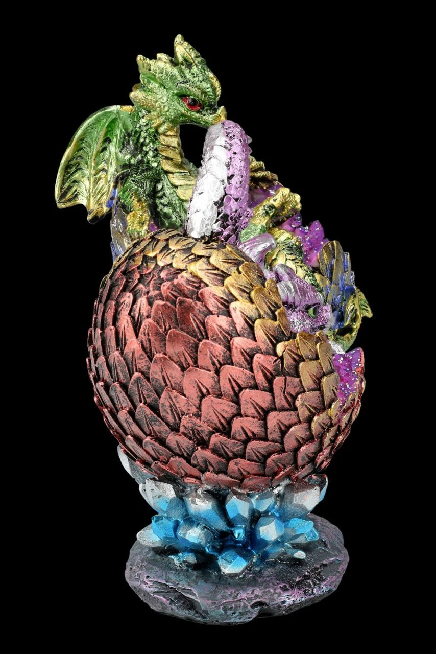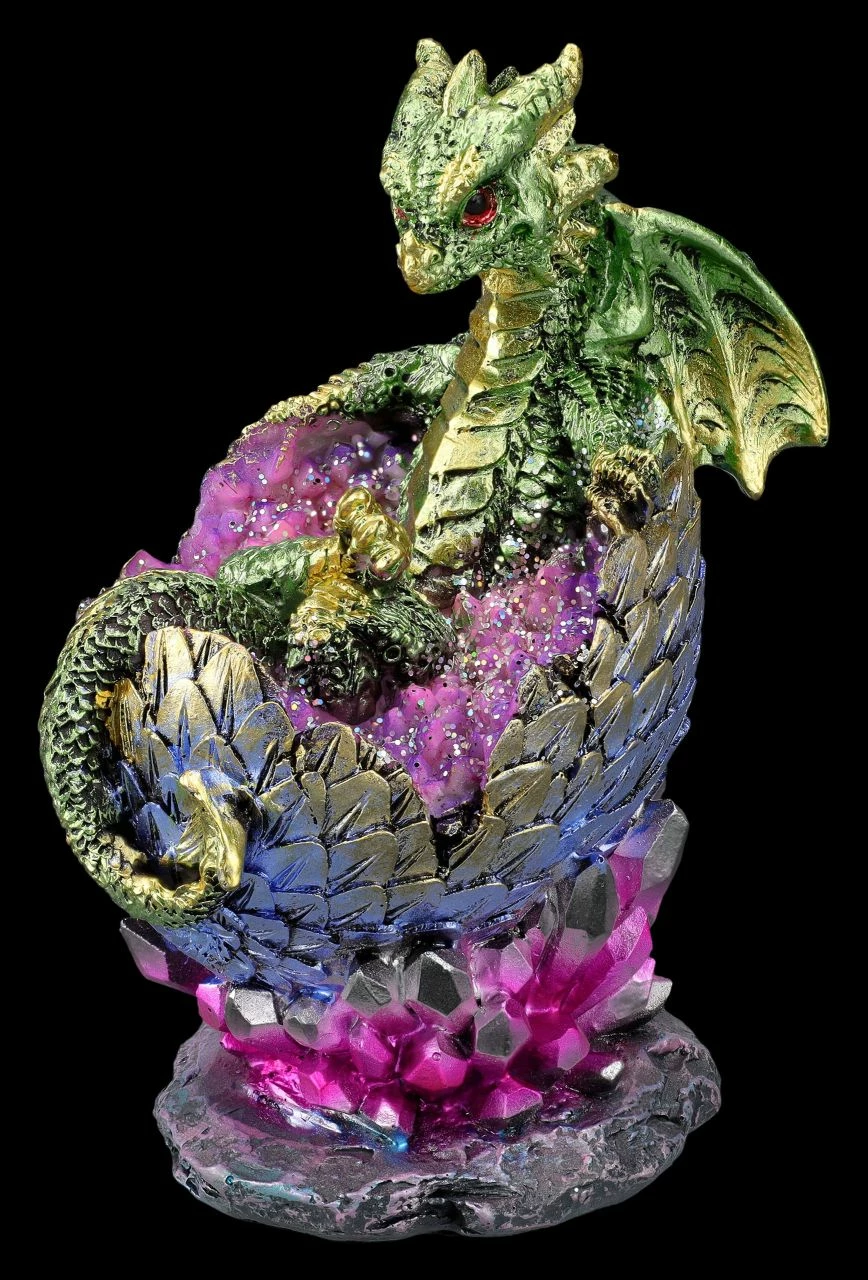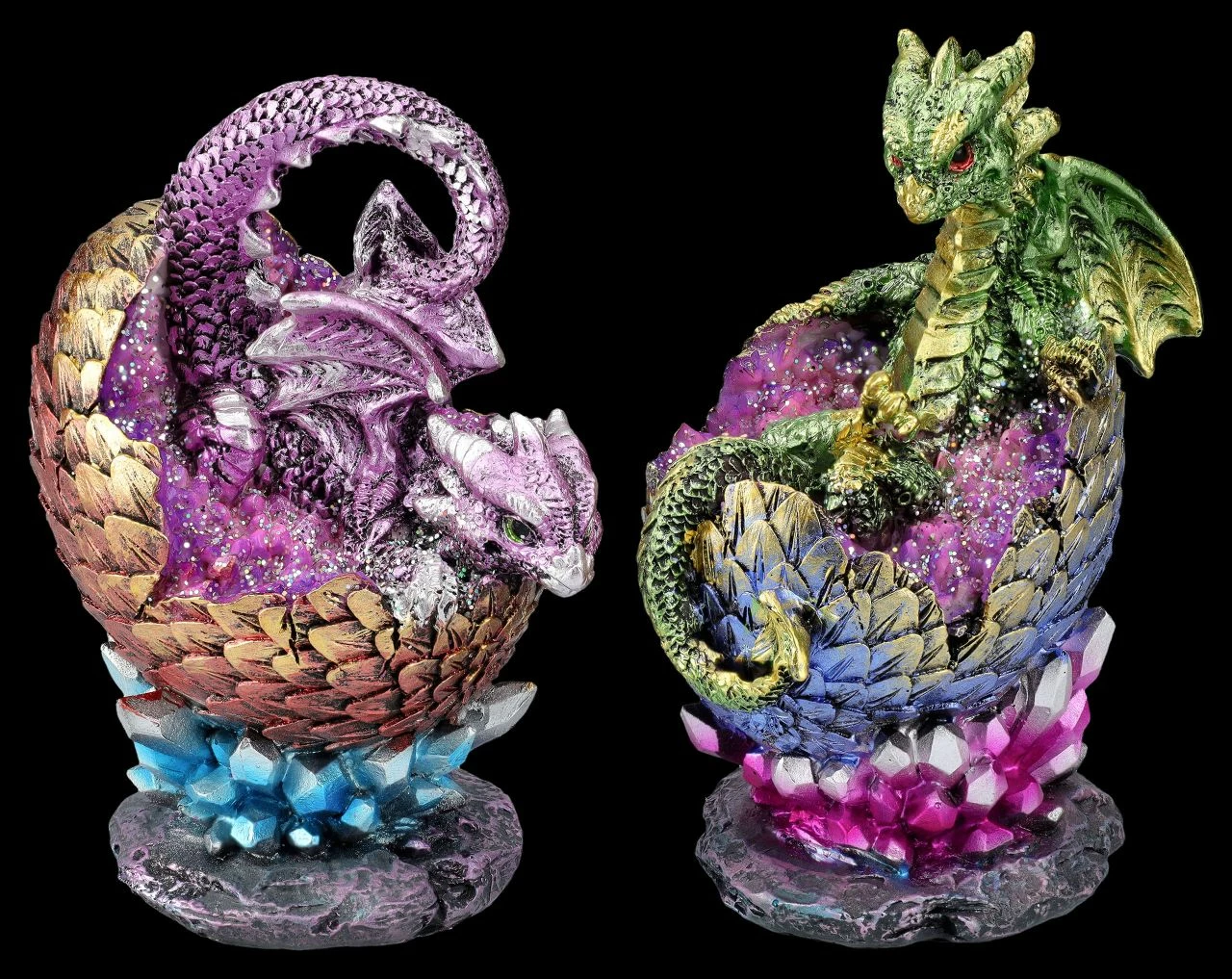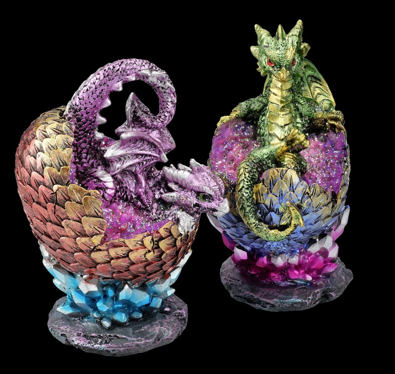 Tief versteckt in einer verborgenen Kristallgrotte hatte die Drachenmama ihre beiden Eier sicher auf einem blauen und einem rötlichen Kristall abgelegt. Nun sind die beiden kleinen Drachen-Babys zwar bereits geschlüpft, wagen es aber noch nicht, ohne ihre Eltern die kristallenen Eier zu verlassen. Die 14,5 – 6 cm hohen, 9 – 11 cm breiten und 6,5 – 8,5 cm tiefen bunten Eier mit den beiden Babys sind sehr detailreich aus liebevoll handbemaltem Kunststein (Polyresin) gefertigt. Das 2er Set ist nicht nur ein perfektes Geschenk für Sammler, sondern auch eine fantasievolle Deko für die Feier zu einer Geburt oder zu einer lustigen Drachen-Familienfeier.