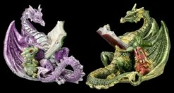 Eigentlich sollten die beiden großen Drachen dem Drachennachwuchs aus den alten Büchern die Geschichte der Drachen vorlesen. Sie finden aber das nun offenbar selbst so spannend, dass sie ganz vergessen, laut vorzulesen. ‚Wie geht die Geschichte weiter?‘ Das grüne Drachenbaby schaut den violetten Drachen etwas ratlos an und das rote Drachenbaby beklagt sich schon lautstark beim großen grünen Drachen. Die je 13,5 cm hohen, je 17 cm breiten und je 10,5 cm tiefen bunten Figuren mit den Geschichten lesenden Drachen sind sehr detailreich aus liebevoll handbemaltem Kunststein (Polyresin) gefertigt. Das 2er Set ist ein lustiges Geschenk für Sammler, das auch perfekt mit den Drachen-Freundinnen und Freunden geteilt werden kann. Es ist aber auch eine fantasievolle Deko für eine Bibliothek oder auch einen Bücherladen.