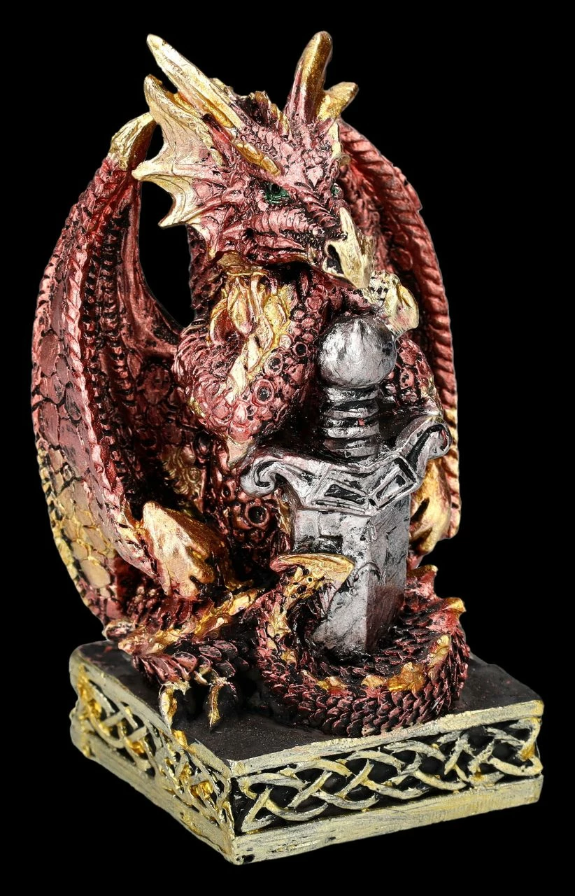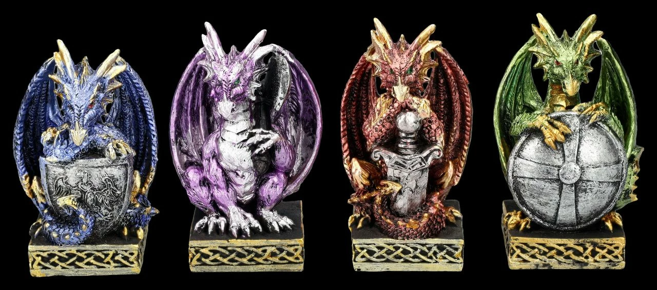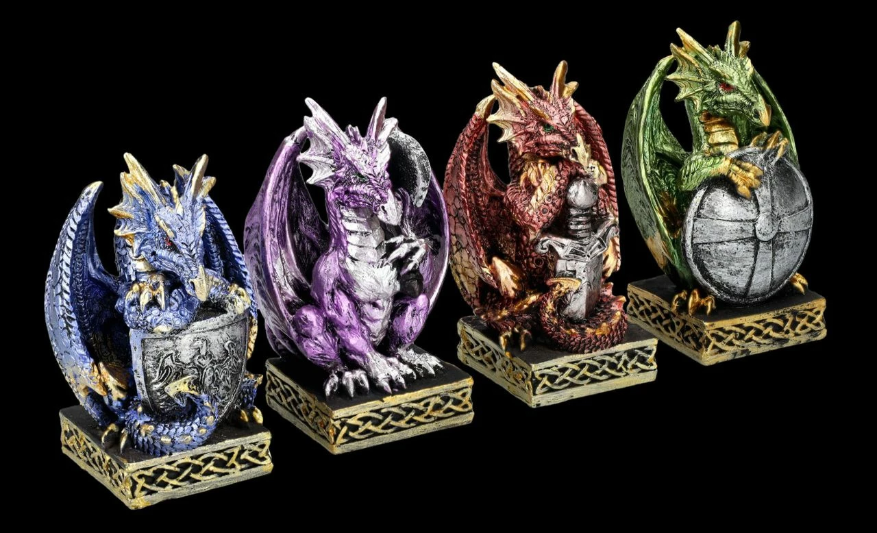 Die vier Drachen-Wächter aus den märchenhaften und geheimnisvollen Wäldern werden jeden beschützen, dem sie gehören. Am besten stellt man sie also in den vier Ecken des Wohnbereiches auf. Der blaue Drache trägt das Wappen des großen Märchenkönigs, der rote Drache trägt sein Schwert, der grüne Drache das Schild und der lilafarbene Drache behält die Übersicht. Die vier je 10 cm hohen, 5,5 – 6,5 cm breiten und je 5,5 cm tiefen Drachen-Wächter aus sorgsam handbemaltem Kunststein (Polyresin) kommen im Set und sind nicht nur für Sammler ein wunderbares Geschenk.