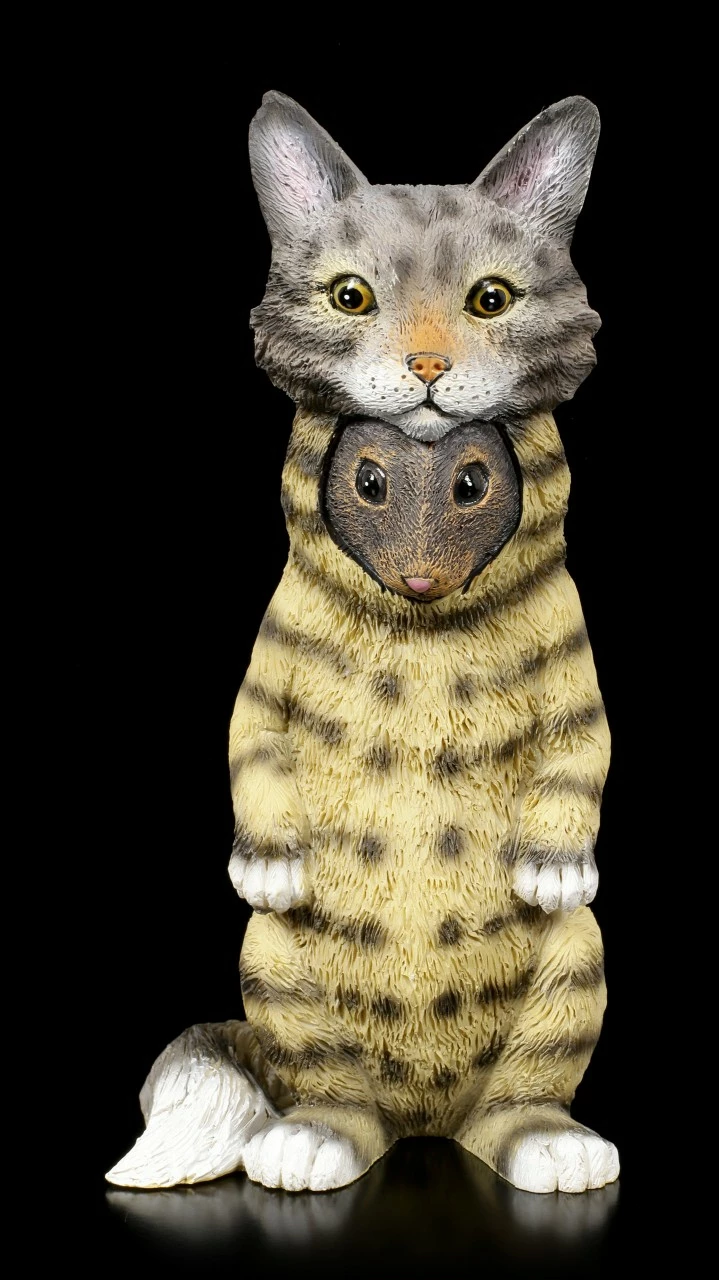 Diese findige kleine braune Maus versteckt sich in einem Katzenkostüm. Mit einer solchen raffinierten Verkleidung kann sie sich in jedem zu Haus frei bewegen und kein Mensch erschreckt sich und sie wird auch nicht von der Hauskatze gejagt. Die süße Dupers Figur ist aus handbemaltem Kunststein (Polyresin) und ein sehr witziges Geschenk.